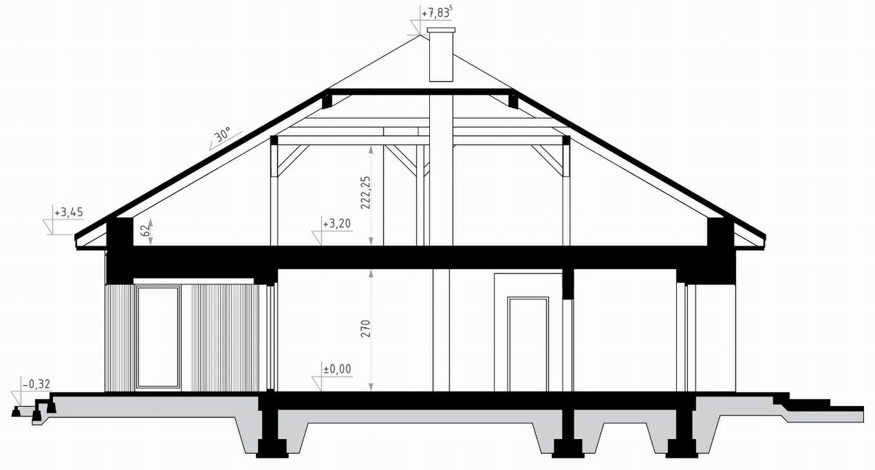 Fundamenty: bezpośrednie, na ławach i stopach fundamentowych. Ściany zewnętrzne: bloczki wapienno-piaskowe - 24 cm + styropian TERMO ORGANIKA typ Fasada 20-26 cm. Ściany wewnętrzne: bloczki wapienno-piaskowe - 24 cm (działowe - 12/8 cm). Strop: żelbetowy monolityczny gr. 20 cm. Elewacje: tynk - systemowy firmy TERMO ORGANIKA, okładzina z lameli klejonych. Pokrycie dachu: blachodachówka lub dachówka cementowa. Konstrukcja dachu: tradycyjna drewniana. Schody wewnętrzne: schody strychowe FAKRO. Ogrzewanie: kocioł na paliwo stałe dodatkowe źródło ciepła - kominek. Projekt jest zgodny z wymaganiami WT2025.