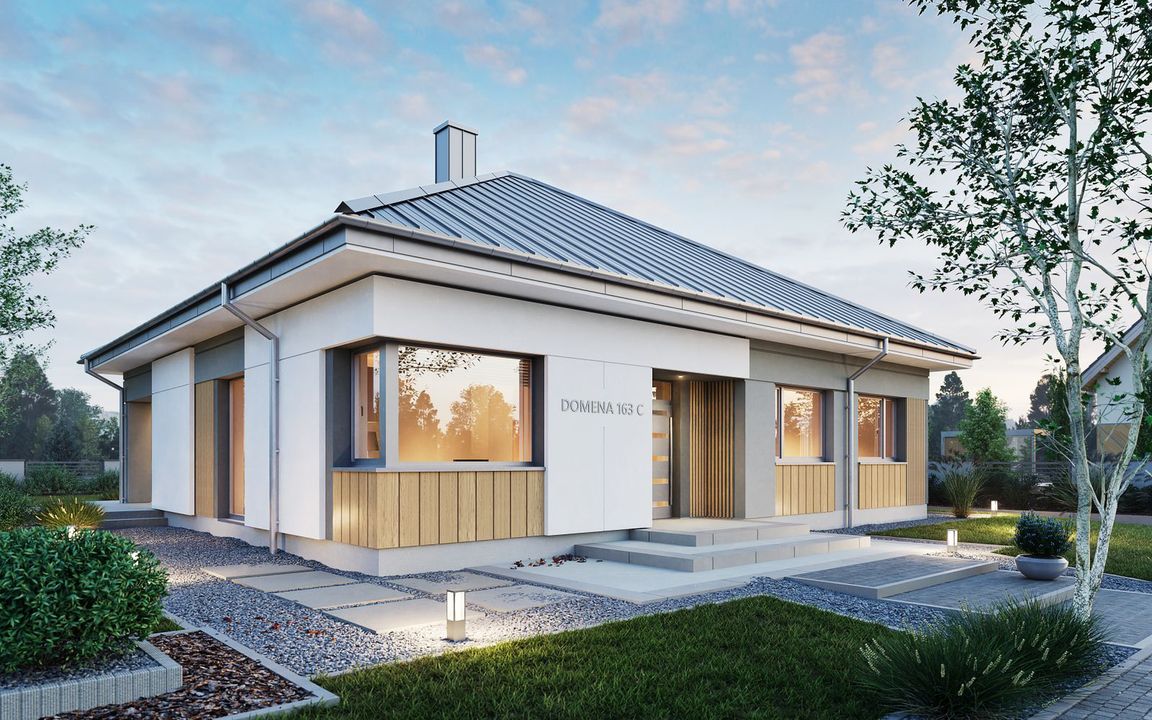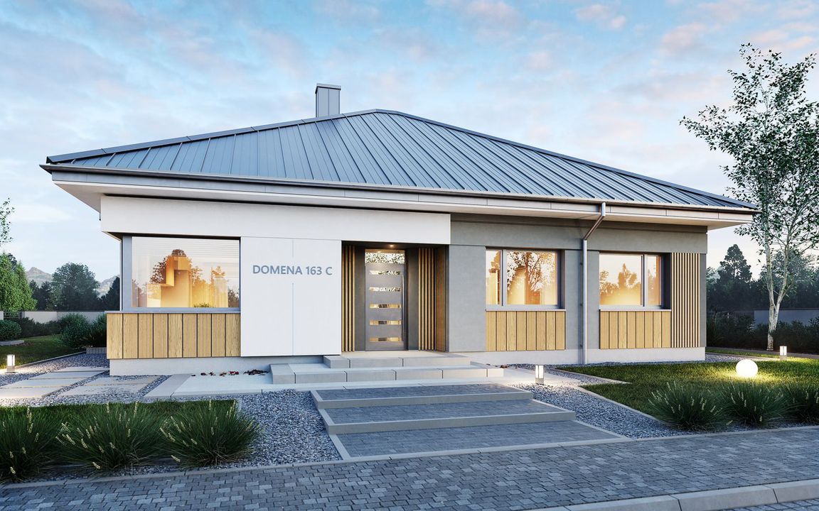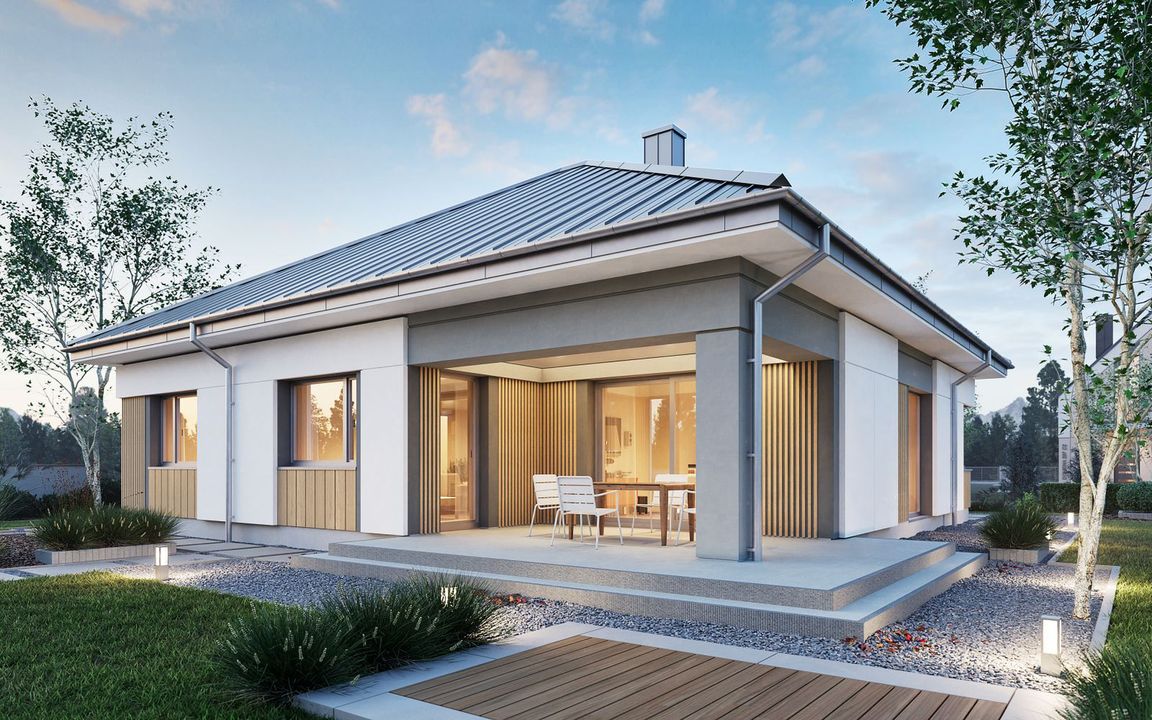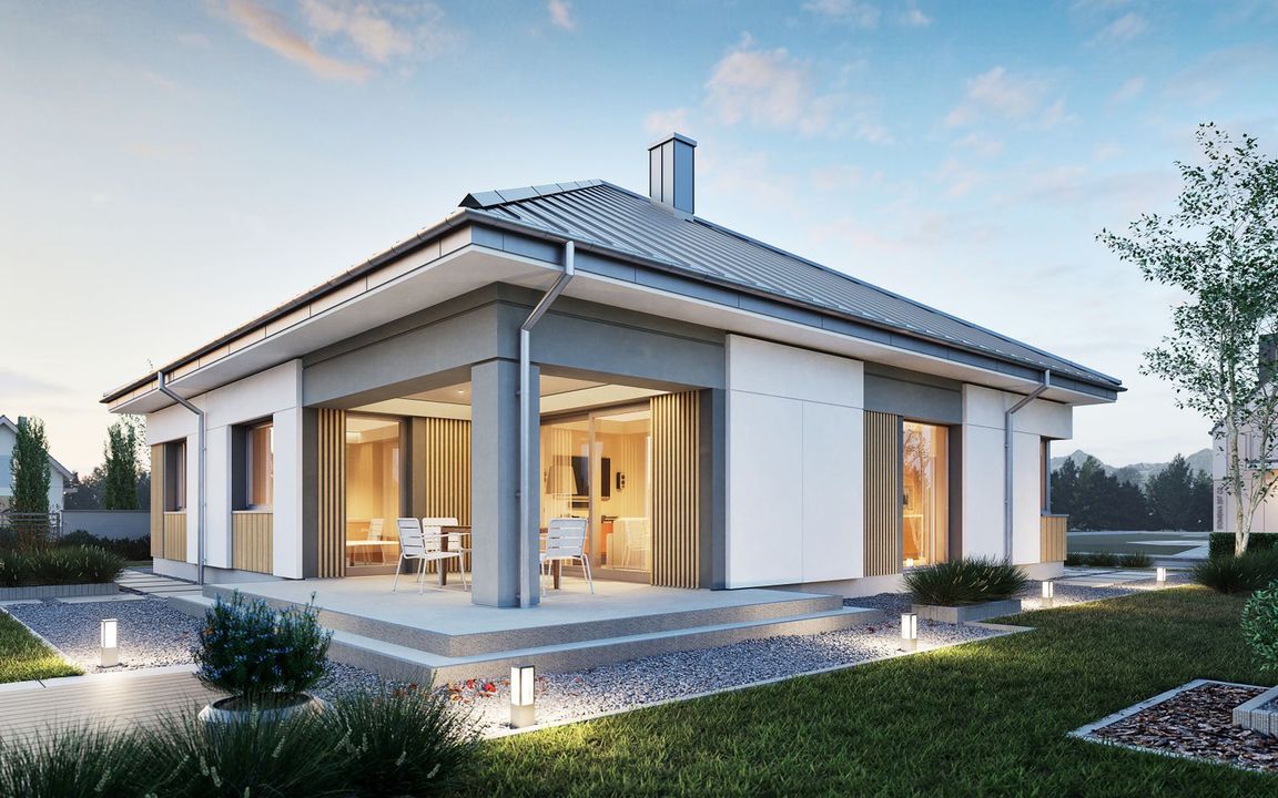Graficzne opracowanie rzutów poglądowych widocznych na karcie projektu zostało wykonane przez Extradom.pl. Prezentowane przez Extradom.pl wizualizacje wykonane zostały przez autora projektu i należy poczytywać je jedynie za przykład i propozycję wykończenia, wizję architektoniczną autora projektu. Ostateczne wykończenie budynku może nastąpić na wiele sposobów. Szczegółowe rozwiązania zastosowane w oferowanej dokumentacji - w tym również ilość, lokalizacje i wygląd okien, drzwi, kominów - mogą w niewielkim stopniu różnić się od prezentowanej wizualizacji budynku.