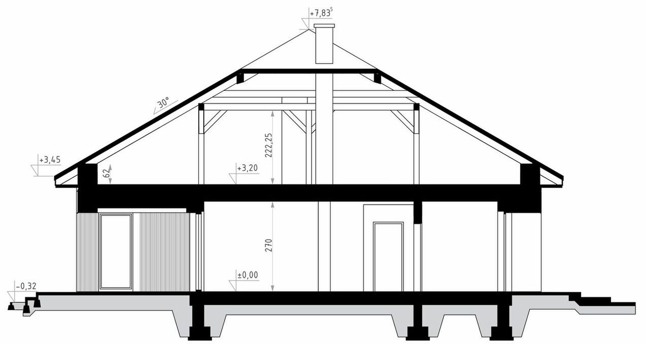 Fundamenty: bezpośrednie, na ławach i stopach fundamentowych. Ściany zewnętrzne: bloczki wapienno-piaskowe - 24 cm + styropian TERMO ORGANIKA typ Fasada 20-26 cm. Ściany wewnętrzne: bloczki wapienno-piaskowe - 24 cm (działowe - 12/8 cm). Strop: żelbetowy monolityczny gr. 20 cm. Elewacje: tynk - systemowy firmy TERMO ORGANIKA, okładzina z lameli klejonych. Pokrycie dachu: blachodachówka lub dachówka. Konstrukcja dachu: tradycyjna drewniana. Schody wewnętrzne: wyłaz na poddasze. Ogrzewanie: kocioł na paliwo stałe dodatkowe źródło ciepła - kominek. Projekt jest zgodny z wymaganiami WT2025.