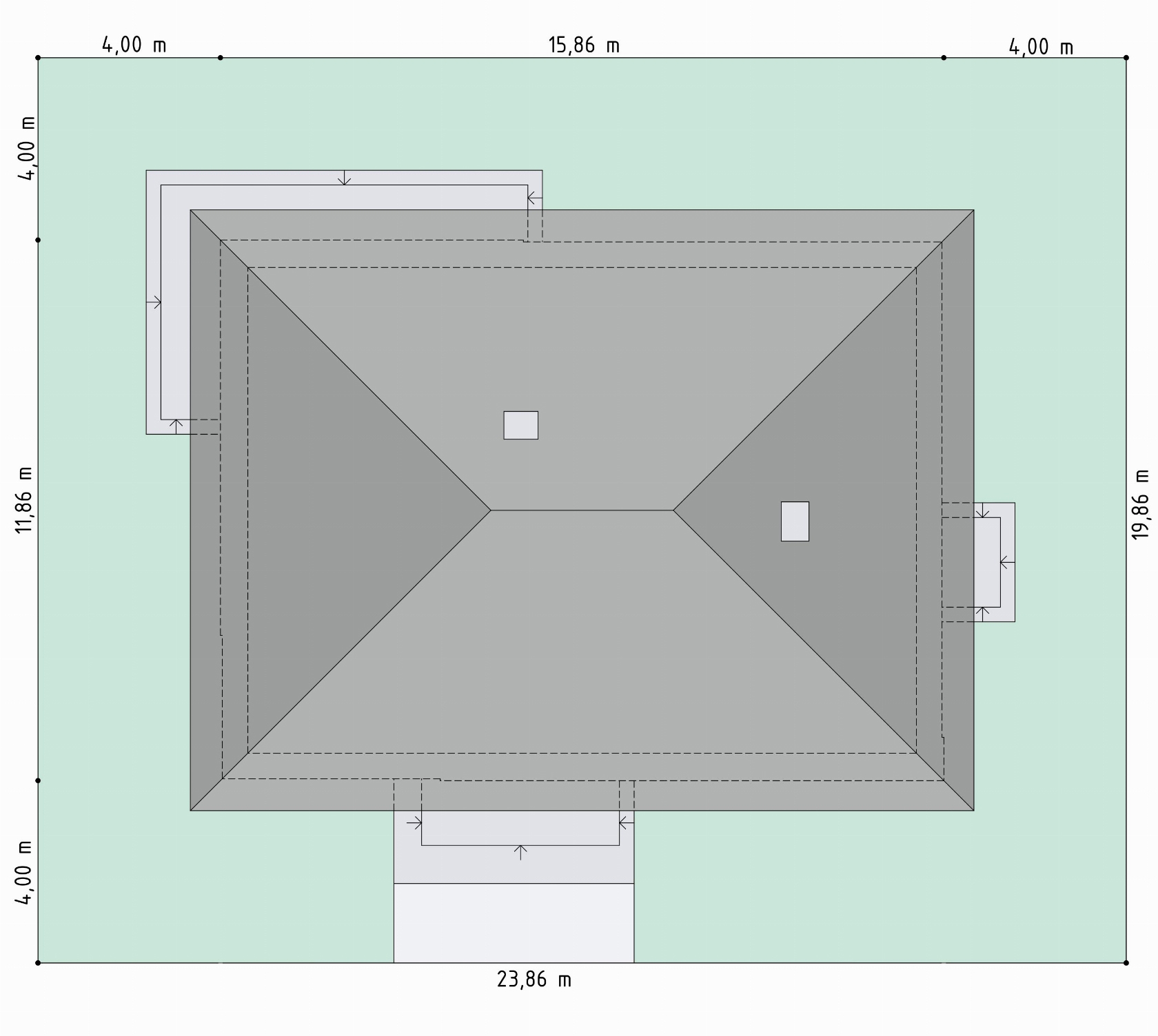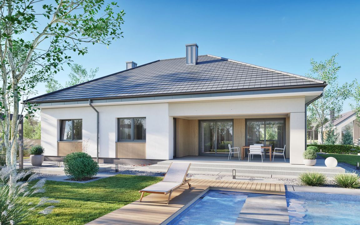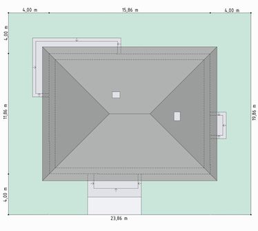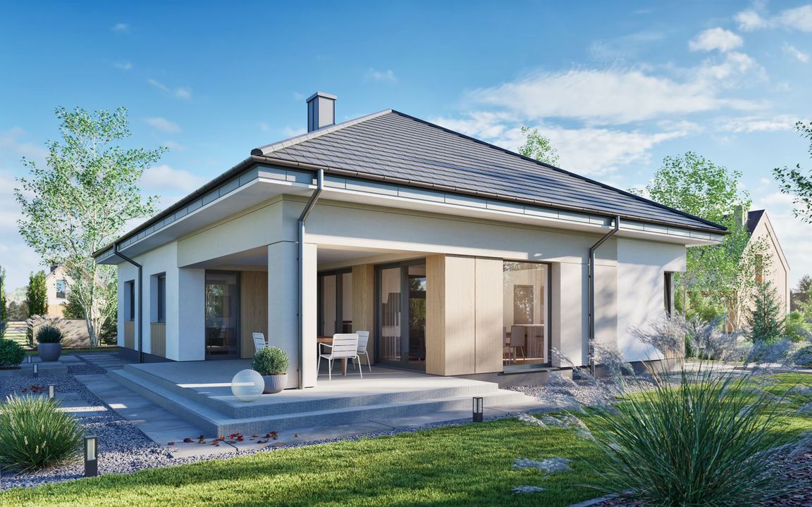 Graficzne opracowanie rzutów poglądowych widocznych na karcie projektu zostało wykonane przez Extradom.pl. Prezentowane przez Extradom.pl wizualizacje wykonane zostały przez autora projektu i należy poczytywać je jedynie za przykład i propozycję wykończenia, wizję architektoniczną autora projektu. Ostateczne wykończenie budynku może nastąpić na wiele sposobów. Szczegółowe rozwiązania zastosowane w oferowanej dokumentacji - w tym również ilość, lokalizacje i wygląd okien, drzwi, kominów - mogą w niewielkim stopniu różnić się od prezentowanej wizualizacji budynku.