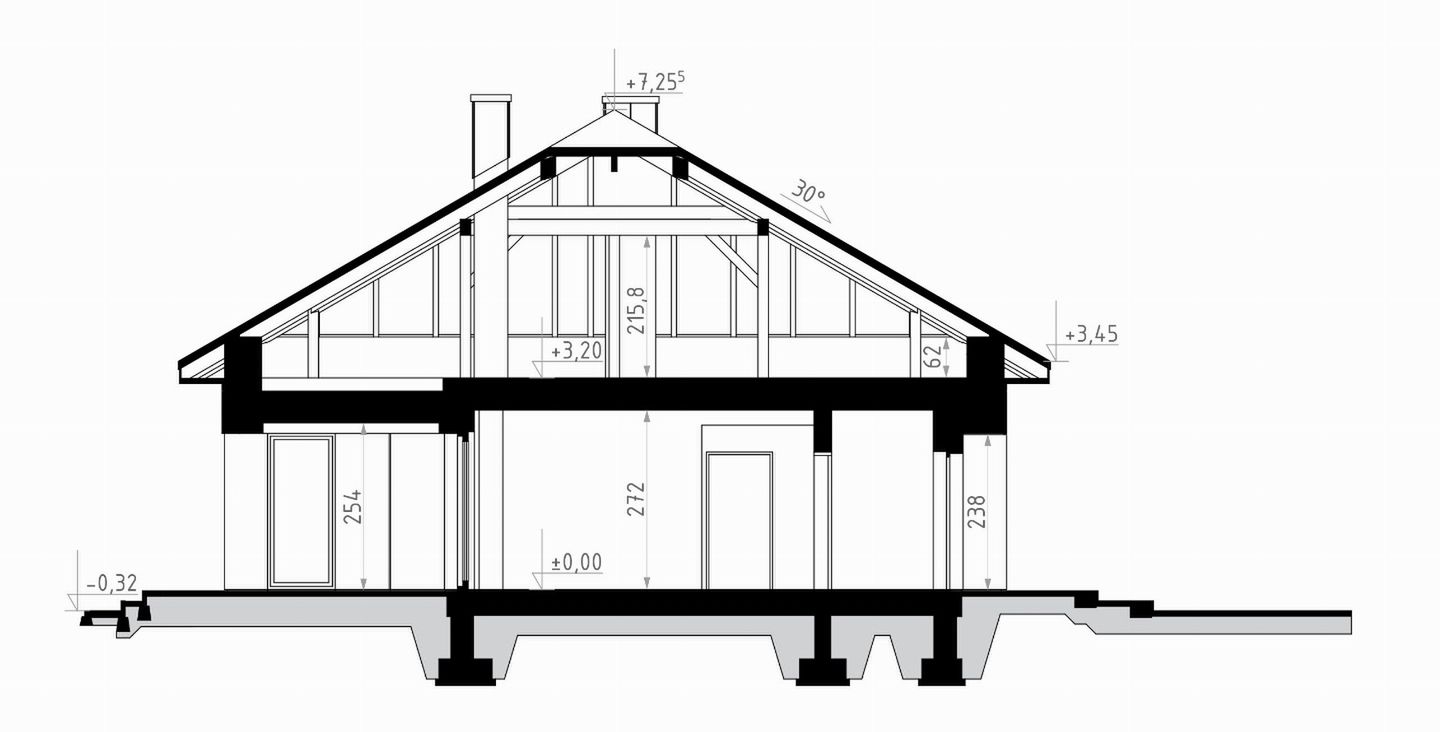 Fundamenty: bezpośrednie, na ławach i stopach fundamentowych. Ściany zewnętrzne: bloczki wapienno-piaskowe - 24 cm + styropian TERMO ORGANIKA typ Fasada 20-26 cm. Ściany wewnętrzne: bloczki wapienno-piaskowe - 24 cm (działowe - 12/8 cm). Strop: żelbetowy monolityczny. Elewacje: tynk - systemowy firmy TERMO ORGANIKA, okładzina z lameli klejonych. Pokrycie dachu: blachodachówka lub dachówka. Konstrukcja dachu: tradycyjna drewniana MITEK. Schody wewnętrzne: schody strychowe Fakro. Ogrzewanie: kocioł na paliwo stałe dodatkowe źródło ciepła - kominek. Projekt jest zgodny z wymaganiami WT2025.