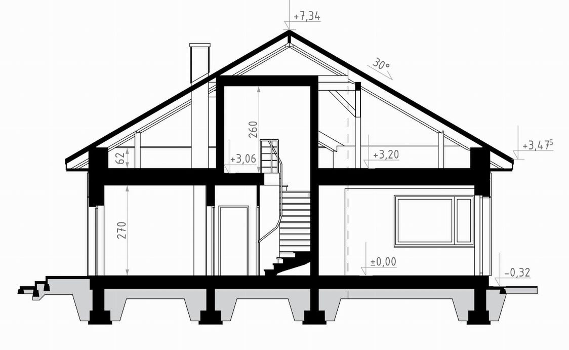 Fundamenty: bezpośrednie, na ławach fundamentowych. Ściany zewnętrzne: bloczki wapienno-piaskowe - 24 cm + styropian TERMO ORGANIKA typ Fasada 22 cm. Ściany wewnętrzne: bloczki wapienno-piaskowe - 24 cm (działowe – bloczki wapienno-piaskowe - 8 cm). Strop: płyta żelbetowa. Elewacje: tynk - systemowy firmy TERMO ORGANIKA, okładzina z lameli. Pokrycie dachu: blachodachówka lub dachówka cementowa. Konstrukcja dachu: tradycyjna drewniana MITEK. Schody wewnętrzne: schody żelbetowe. Ogrzewanie: kocioł na paliwo stałe, dodatkowe źródło ciepła - kominek rekreacyjny. Projekt jest zgodny z wymaganiami WT2025.