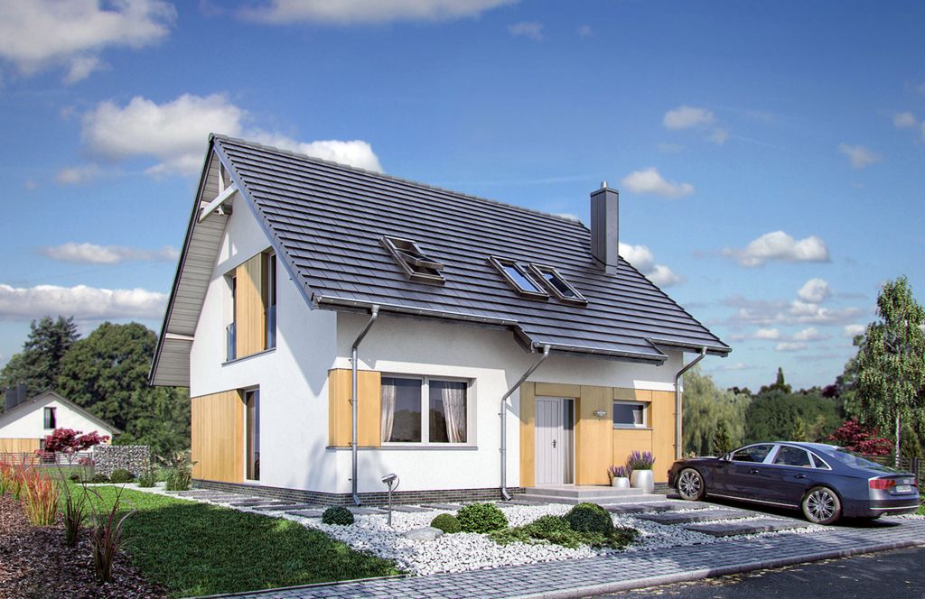 Fundamenty: bezpośrednie, na ławach i stopach fundamentowych. Ściany zewnętrzne: bloczki z bet. komórkowego - 24 cm + styropian TERMO ORGANIKA typ Fasada 20 cm. Ściany wewnętrzne: bloczki z bet. komórkowego (odm. 600) - 24 cm (działowe - 12/19 cm) + działowe z płyty G-K na ruszcie (poddasze). Strop: gęstożebrowy Teriva E oraz żelbetowy monolityczny (ocieplenie ISOVER Super Mata). Elewacje: tynk - System Platinum firmy TERMO ORGANIKA, deska elewacyjna. Pokrycie dachu: dachówka cementowa. Konstrukcja dachu: drewniana o układzie konstrukcyjnym mieszanym. Schody wewnętrzne: drewniane zabiegowe. Ogrzewanie: kocioł gazowy kondensacyjny lub kocioł na paliwo stałe, dodatkowe źródło ciepła - kominek z płaszczem wodnym. Projekt jest zgodny z wymaganiami WT2024, a konstrukcja była obliczana zgodnie z eurokodami.
