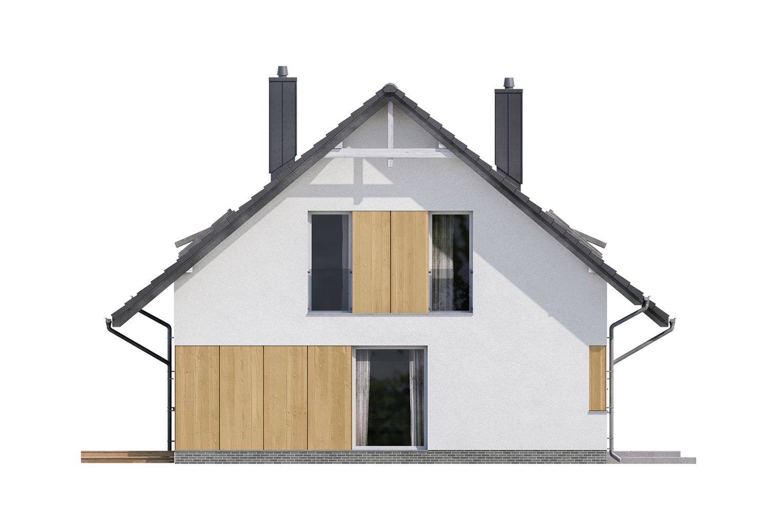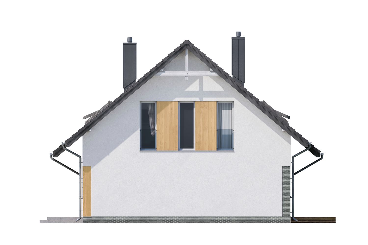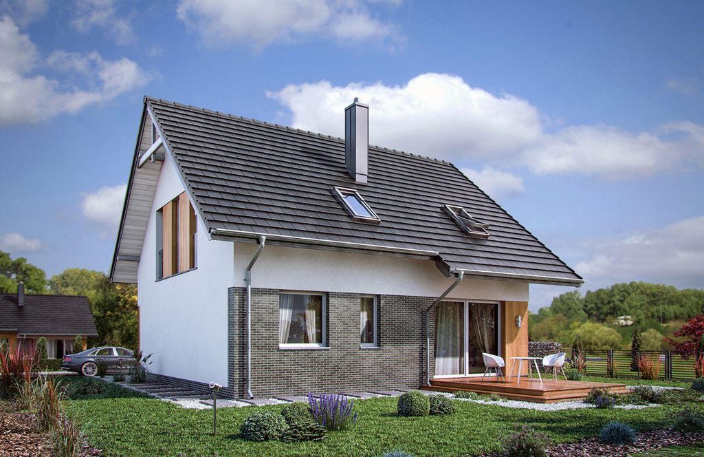 Graficzne opracowanie rzutów poglądowych widocznych na karcie projektu zostało wykonane przez Extradom.pl. Prezentowane przez Extradom.pl wizualizacje wykonane zostały przez autora projektu i należy poczytywać je jedynie za przykład i propozycję wykończenia, wizję architektoniczną autora projektu. Ostateczne wykończenie budynku może nastąpić na wiele sposobów. Szczegółowe rozwiązania zastosowane w oferowanej dokumentacji - w tym również ilość, lokalizacje i wygląd okien, drzwi, kominów - mogą w niewielkim stopniu różnić się od prezentowanej wizualizacji budynku.