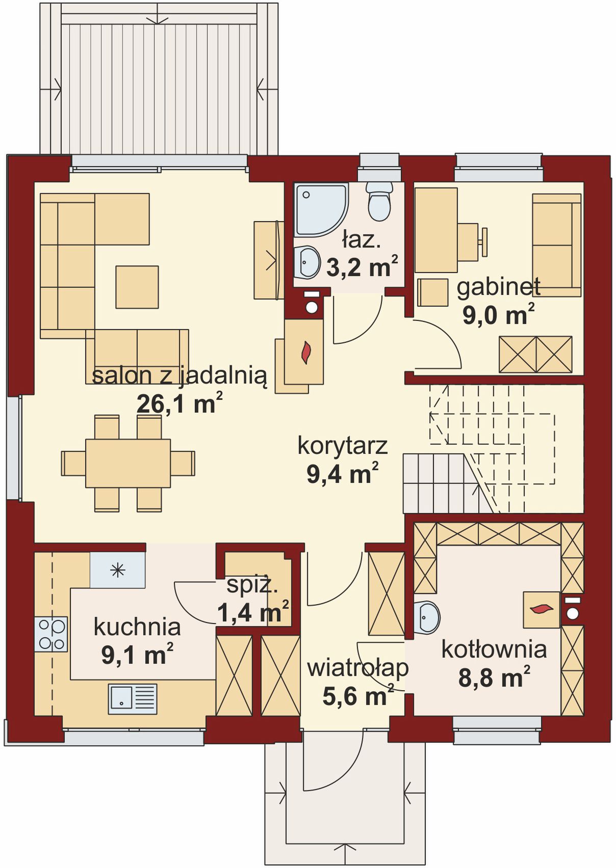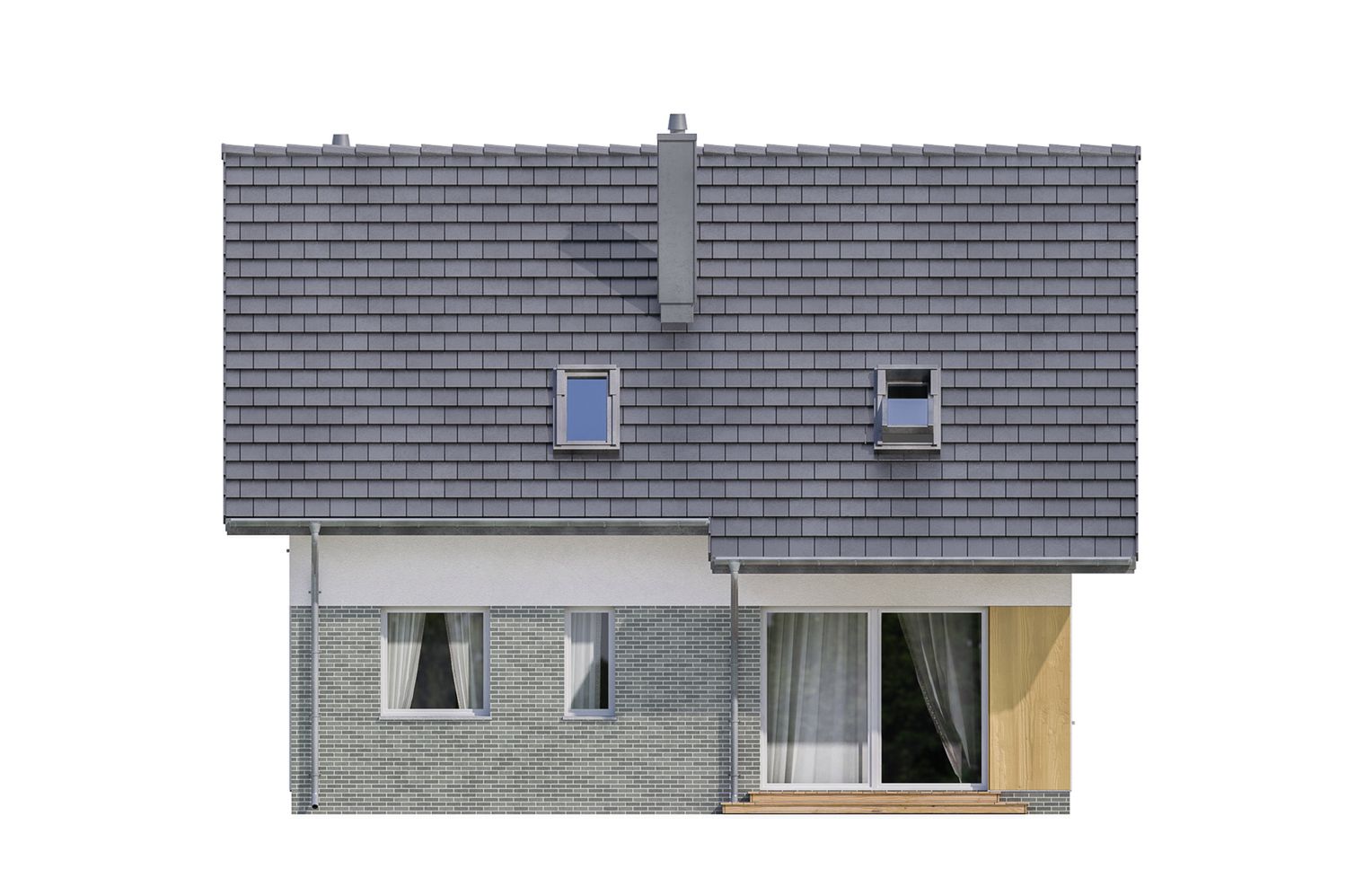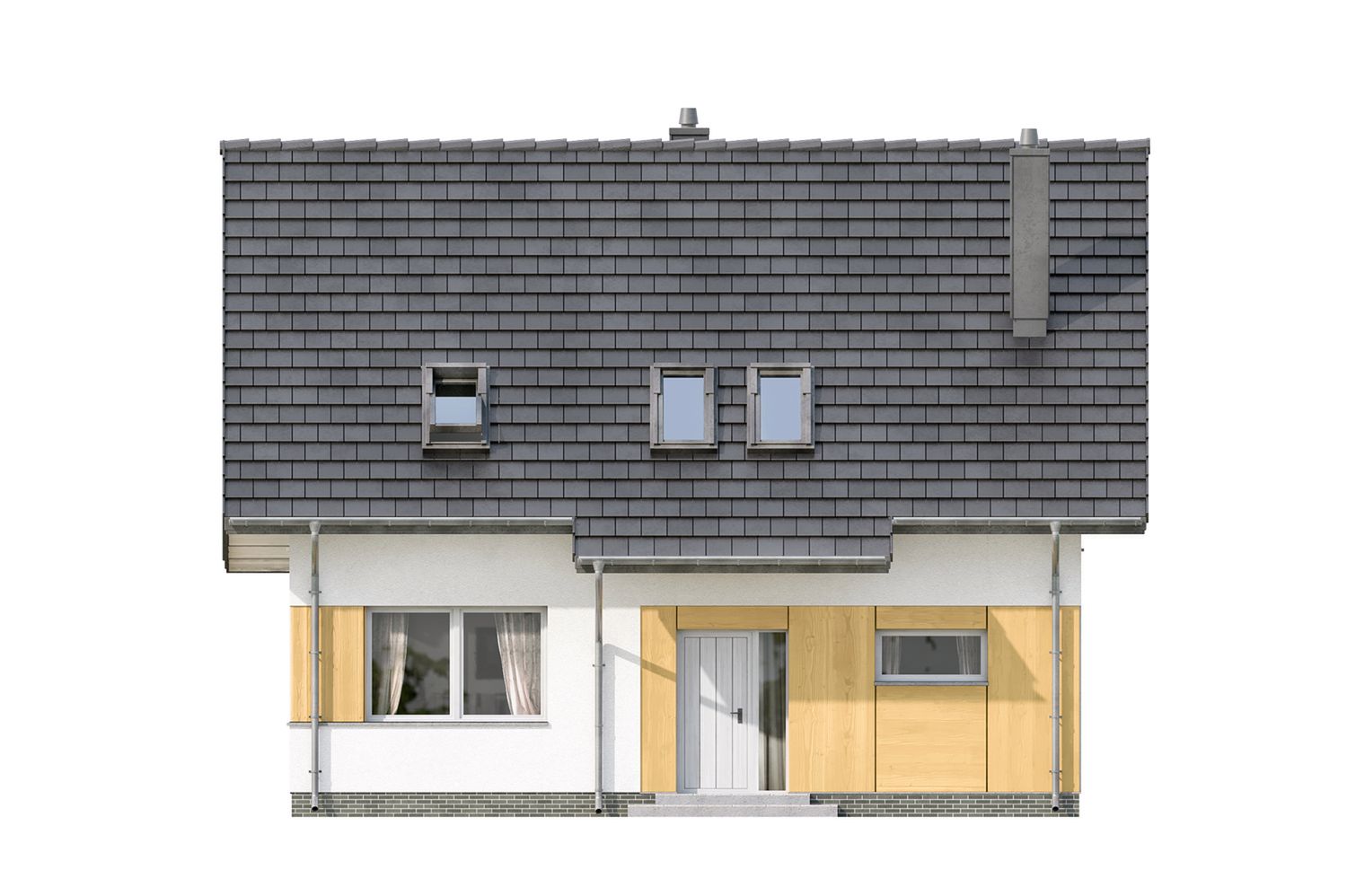 Graficzne opracowanie rzutów poglądowych widocznych na karcie projektu zostało wykonane przez Extradom.pl. Prezentowane przez Extradom.pl wizualizacje wykonane zostały przez autora projektu i należy poczytywać je jedynie za przykład i propozycję wykończenia, wizję architektoniczną autora projektu. Ostateczne wykończenie budynku może nastąpić na wiele sposobów. Szczegółowe rozwiązania zastosowane w oferowanej dokumentacji - w tym również ilość, lokalizacje i wygląd okien, drzwi, kominów - mogą w niewielkim stopniu różnić się od prezentowanej wizualizacji budynku.