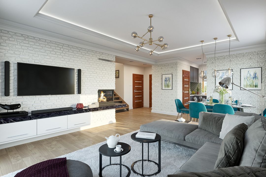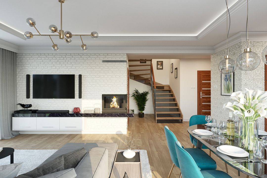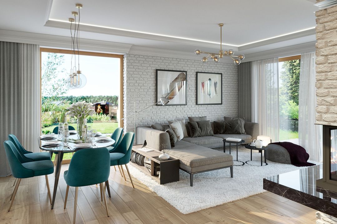 Graficzne opracowanie rzutów poglądowych widocznych na karcie projektu zostało wykonane przez Extradom.pl. Prezentowane przez Extradom.pl wizualizacje wykonane zostały przez autora projektu i należy poczytywać je jedynie za przykład i propozycję wykończenia, wizję architektoniczną autora projektu. Ostateczne wykończenie budynku może nastąpić na wiele sposobów. Szczegółowe rozwiązania zastosowane w oferowanej dokumentacji - w tym również ilość, lokalizacje i wygląd okien, drzwi, kominów - mogą w niewielkim stopniu różnić się od prezentowanej wizualizacji budynku.