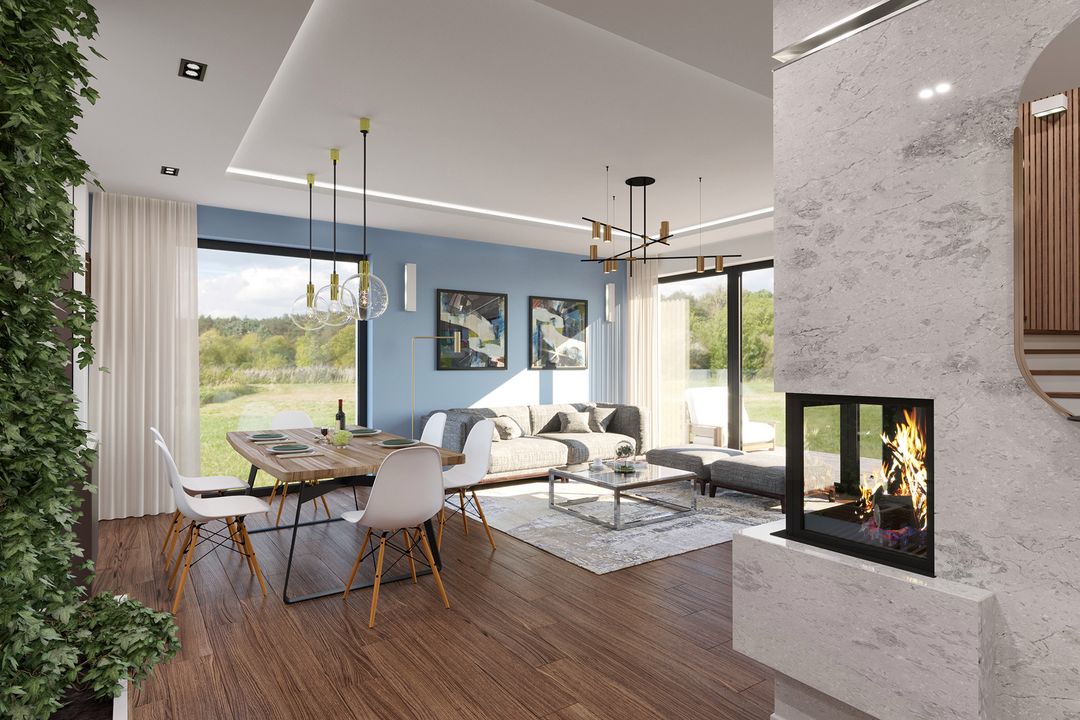 Graficzne opracowanie rzutów poglądowych widocznych na karcie projektu zostało wykonane przez Extradom.pl. Prezentowane przez Extradom.pl wizualizacje wykonane zostały przez autora projektu i należy poczytywać je jedynie za przykład i propozycję wykończenia, wizję architektoniczną autora projektu. Ostateczne wykończenie budynku może nastąpić na wiele sposobów. Szczegółowe rozwiązania zastosowane w oferowanej dokumentacji - w tym również ilość, lokalizacje i wygląd okien, drzwi, kominów - mogą w niewielkim stopniu różnić się od prezentowanej wizualizacji budynku.