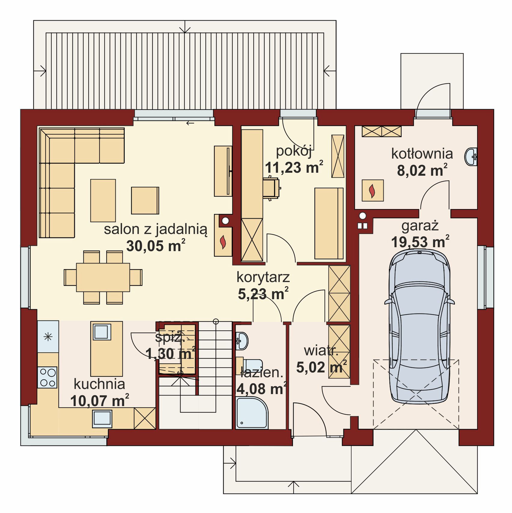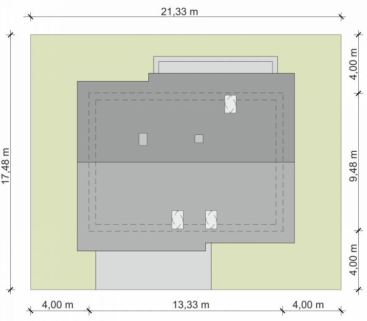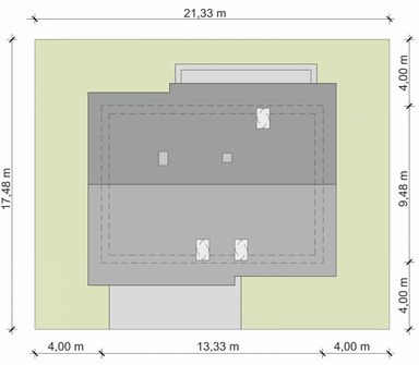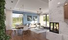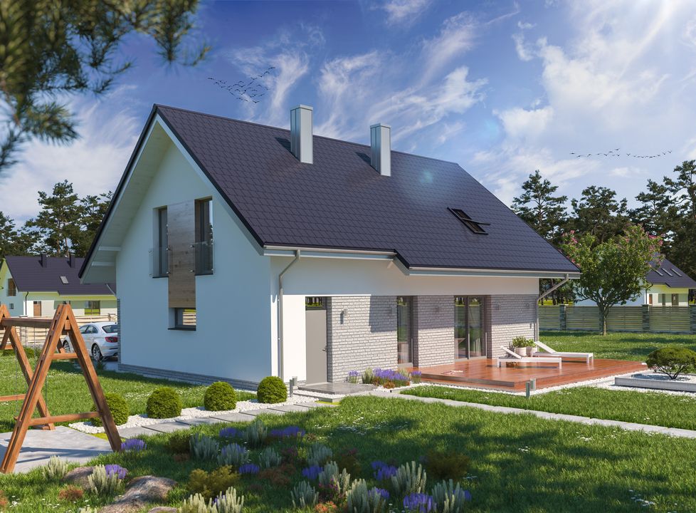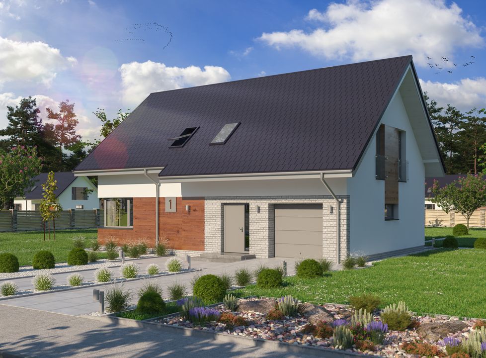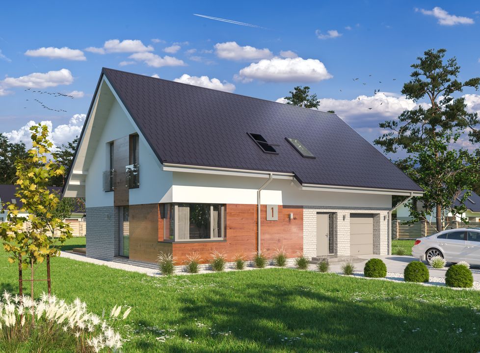 Graficzne opracowanie rzutów poglądowych widocznych na karcie projektu zostało wykonane przez Extradom.pl. Prezentowane przez Extradom.pl wizualizacje wykonane zostały przez autora projektu i należy poczytywać je jedynie za przykład i propozycję wykończenia, wizję architektoniczną autora projektu. Ostateczne wykończenie budynku może nastąpić na wiele sposobów. Szczegółowe rozwiązania zastosowane w oferowanej dokumentacji - w tym również ilość, lokalizacje i wygląd okien, drzwi, kominów - mogą w niewielkim stopniu różnić się od prezentowanej wizualizacji budynku.