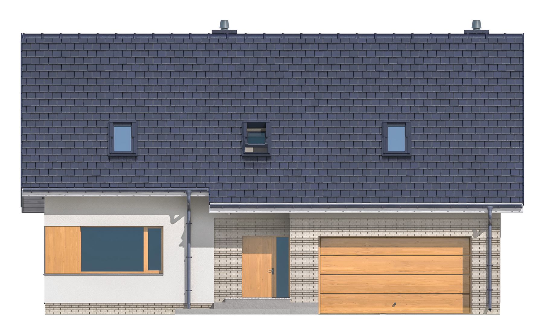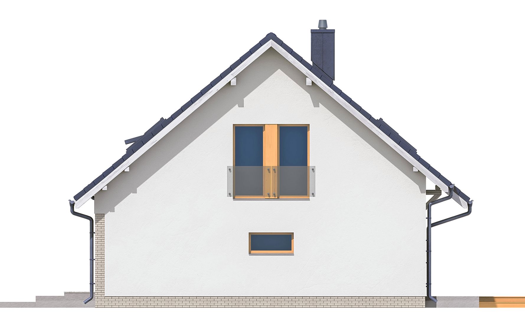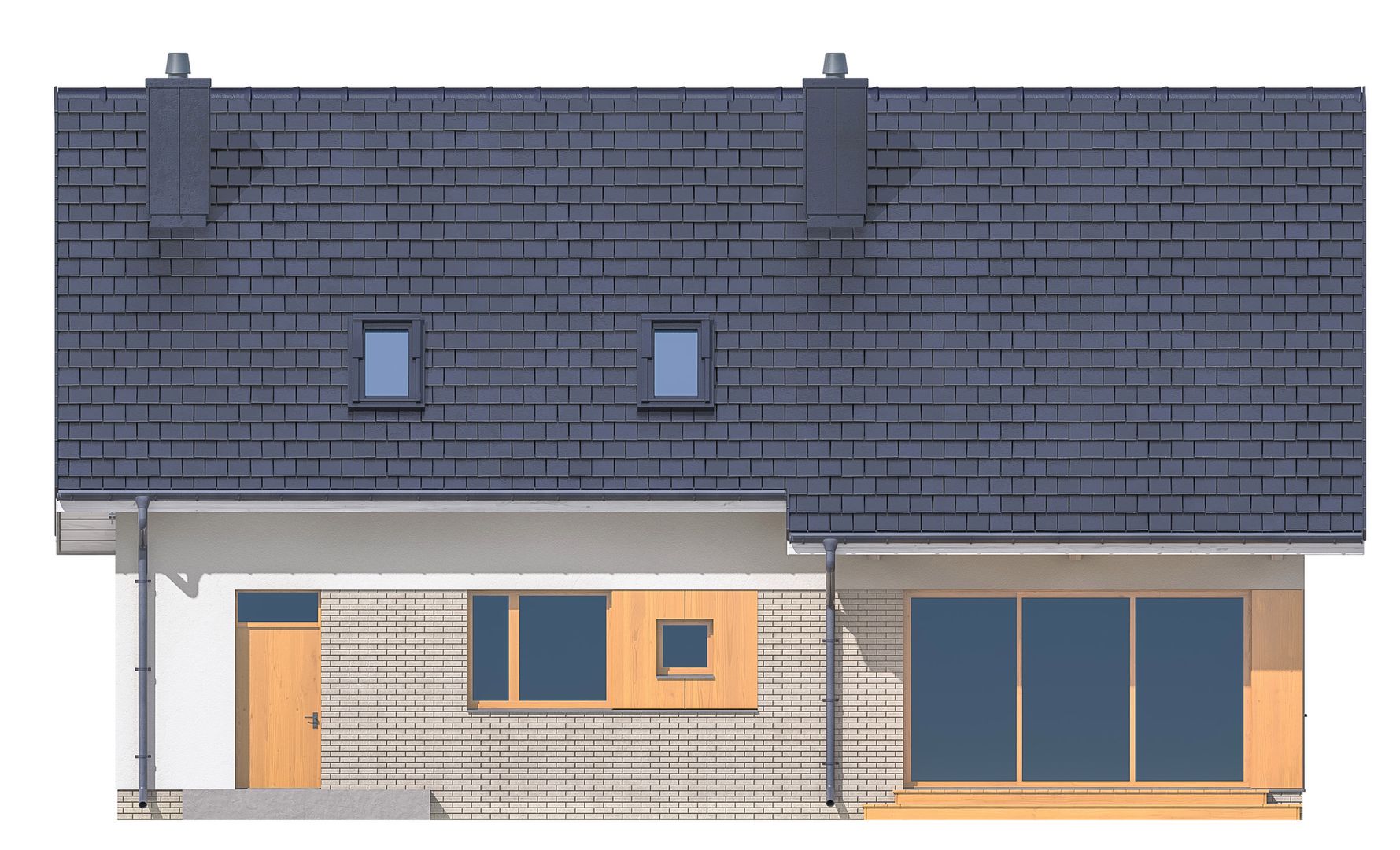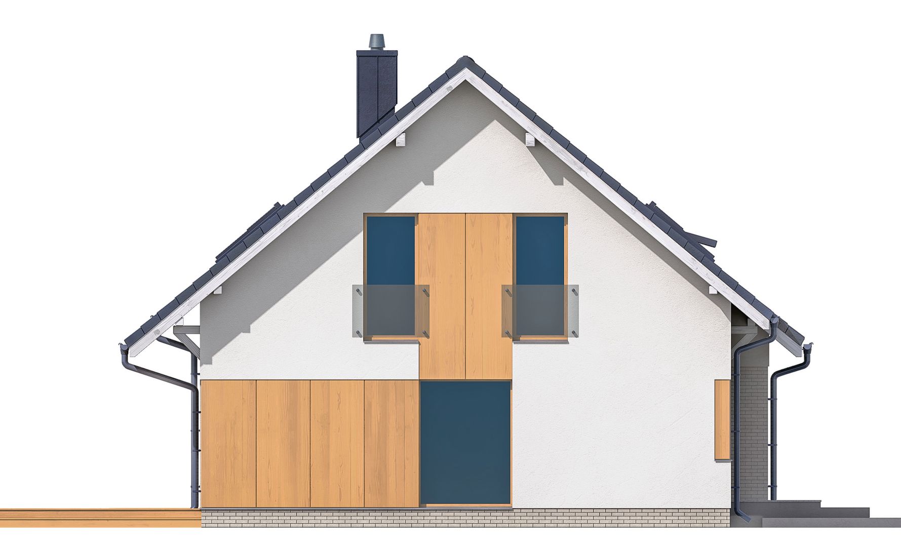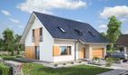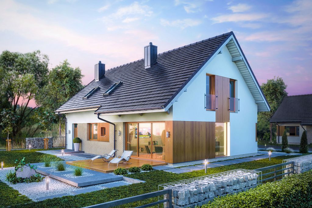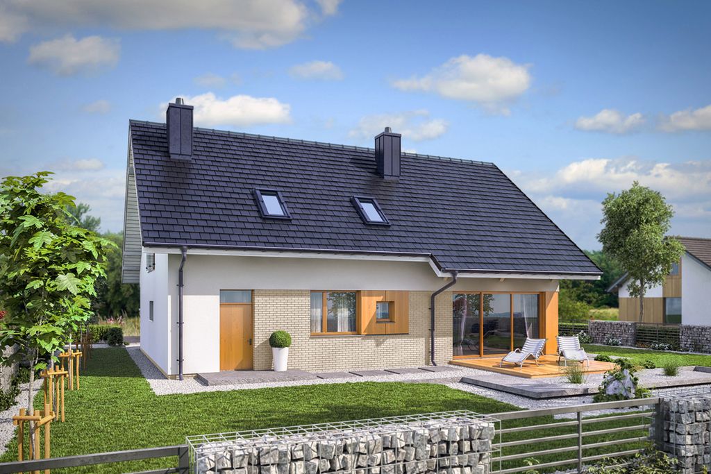 Graficzne opracowanie rzutów poglądowych widocznych na karcie projektu zostało wykonane przez Extradom.pl. Prezentowane przez Extradom.pl wizualizacje wykonane zostały przez autora projektu i należy poczytywać je jedynie za przykład i propozycję wykończenia, wizję architektoniczną autora projektu. Ostateczne wykończenie budynku może nastąpić na wiele sposobów. Szczegółowe rozwiązania zastosowane w oferowanej dokumentacji - w tym również ilość, lokalizacje i wygląd okien, drzwi, kominów - mogą w niewielkim stopniu różnić się od prezentowanej wizualizacji budynku.