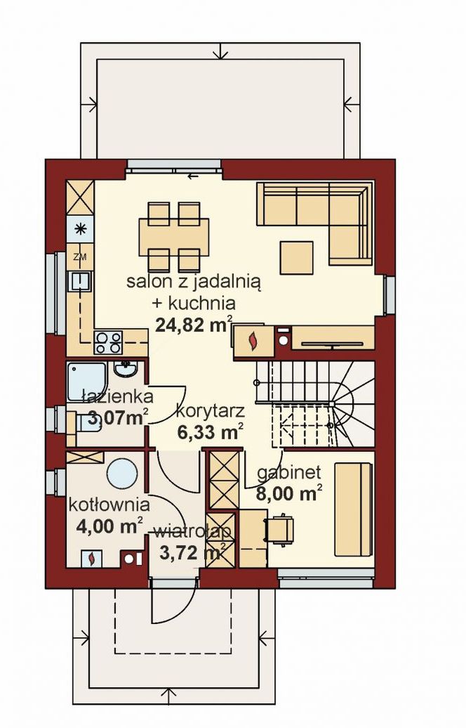 Fundamenty bezpośrednie, na ławach i stopach fundamentowych Ściany zewnętrzne bloczki wapienno-piaskowe - 24 cm + styropian TERMO ORGANIKA typ Fasada 20 cm Ściany wewnętrzne bloczki wapienno-piaskowe – 24 cm (działowe – bloczki wapienno-piaskowe - 12/8 cm) Strop żelbetowy monolityczny Elewacje tynk - systemowy firmy TERMO ORGANIKA, Pokrycie dachu blacha płaska Konstrukcja dachu tradycyjna drewniana Schody wewnętrzne schody drewniane oraz schody strychowe FAKRO Ogrzewanie kocioł na gaz, dodatkowe źródło ciepła - kominek