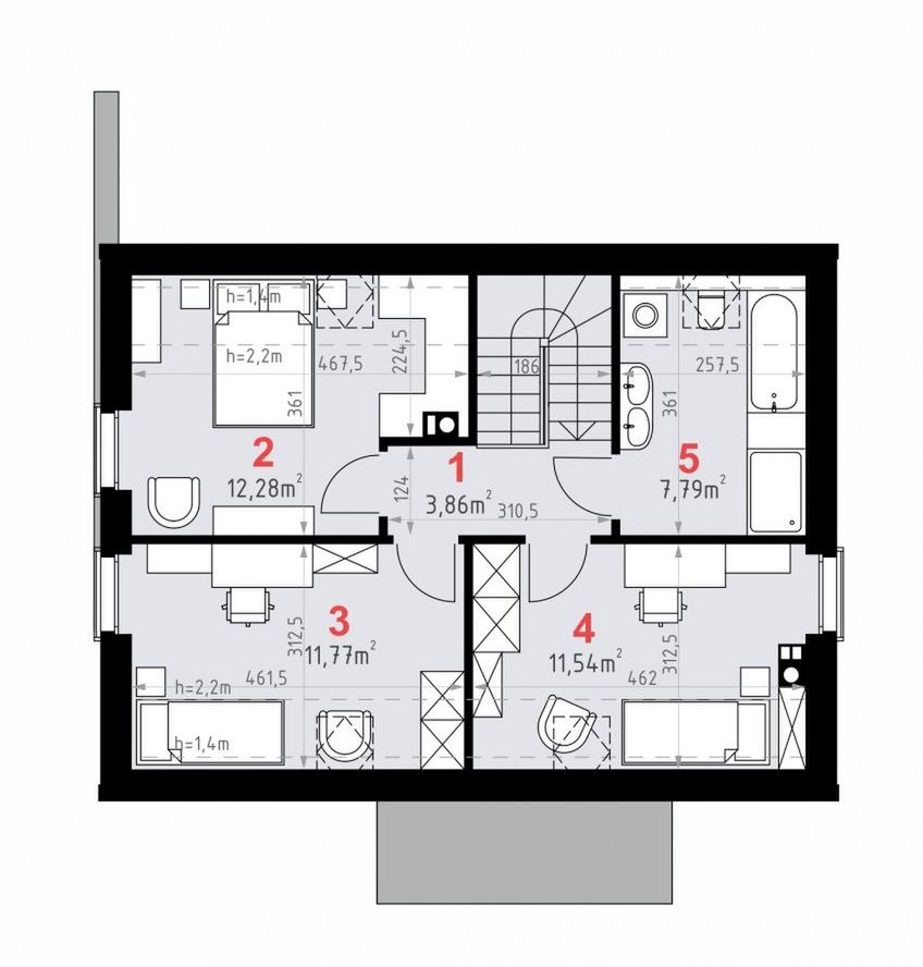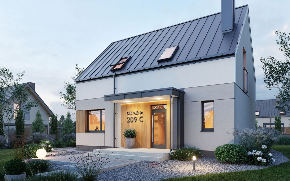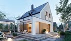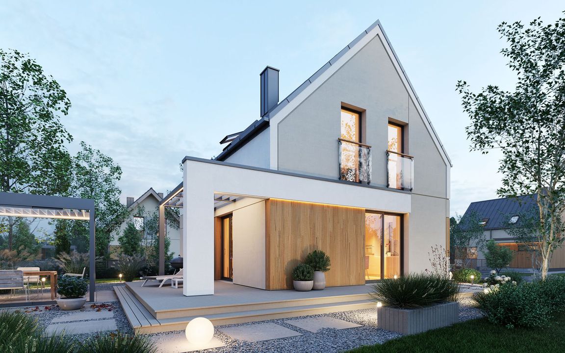Graficzne opracowanie rzutów poglądowych widocznych na karcie projektu zostało wykonane przez Extradom.pl. Prezentowane przez Extradom.pl wizualizacje wykonane zostały przez autora projektu i należy poczytywać je jedynie za przykład i propozycję wykończenia, wizję architektoniczną autora projektu. Ostateczne wykończenie budynku może nastąpić na wiele sposobów. Szczegółowe rozwiązania zastosowane w oferowanej dokumentacji - w tym również ilość, lokalizacje i wygląd okien, drzwi, kominów - mogą w niewielkim stopniu różnić się od prezentowanej wizualizacji budynku.