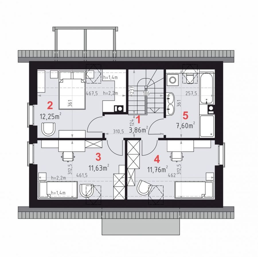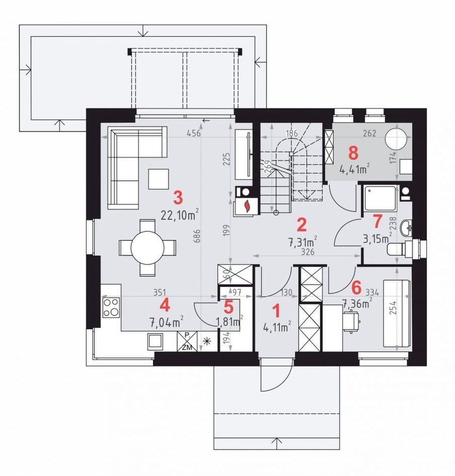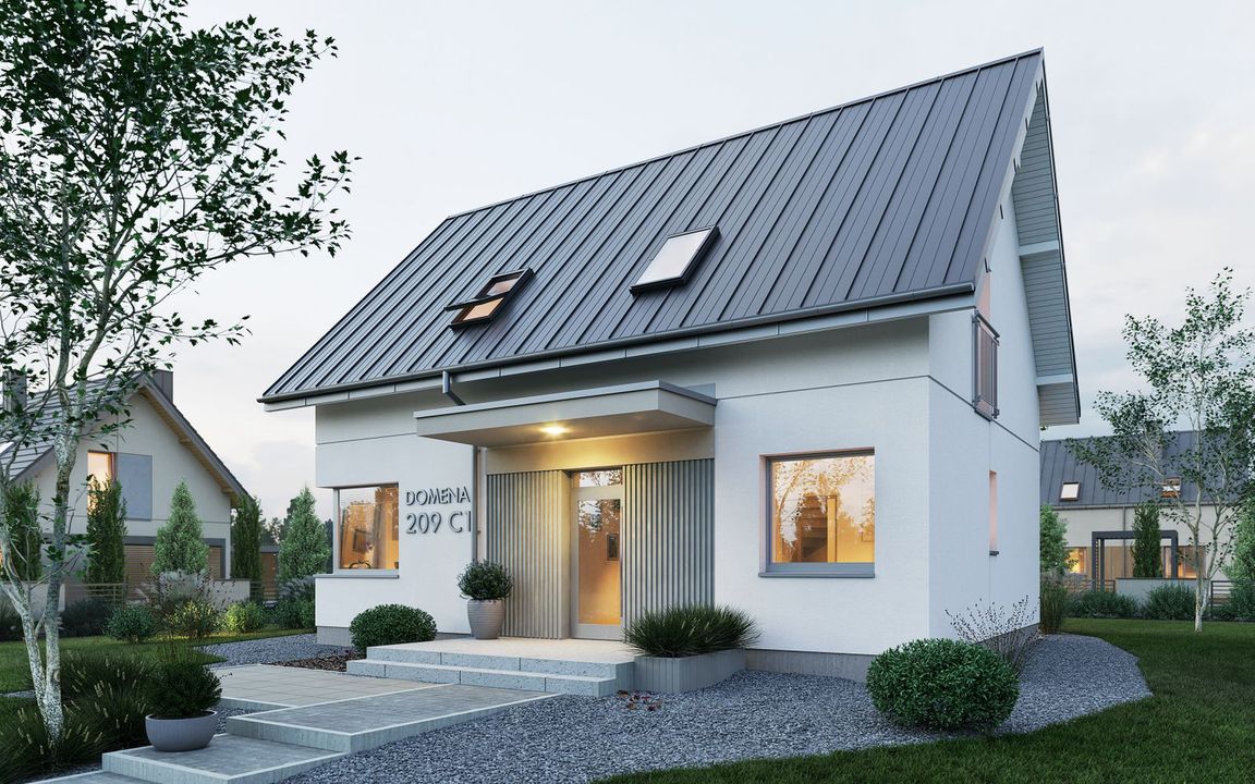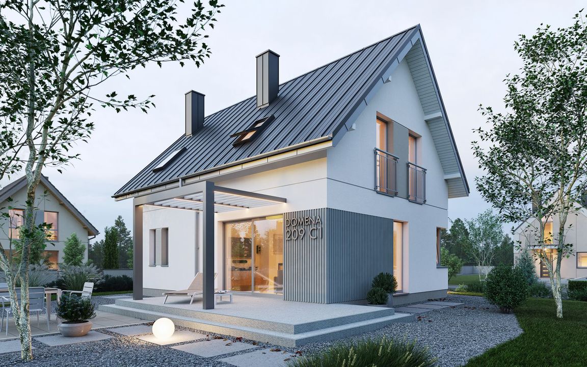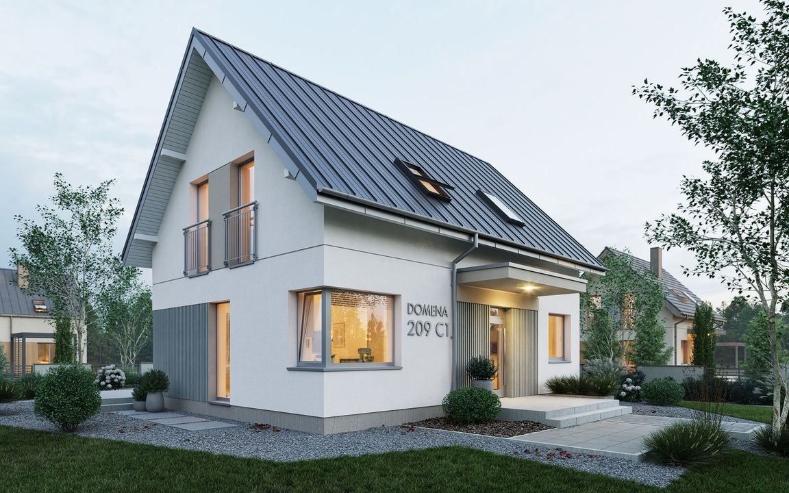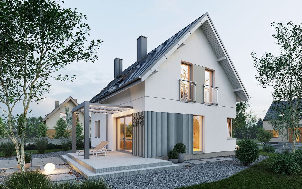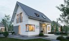 Graficzne opracowanie rzutów poglądowych widocznych na karcie projektu zostało wykonane przez Extradom.pl. Prezentowane przez Extradom.pl wizualizacje wykonane zostały przez autora projektu i należy poczytywać je jedynie za przykład i propozycję wykończenia, wizję architektoniczną autora projektu. Ostateczne wykończenie budynku może nastąpić na wiele sposobów. Szczegółowe rozwiązania zastosowane w oferowanej dokumentacji - w tym również ilość, lokalizacje i wygląd okien, drzwi, kominów - mogą w niewielkim stopniu różnić się od prezentowanej wizualizacji budynku.
