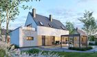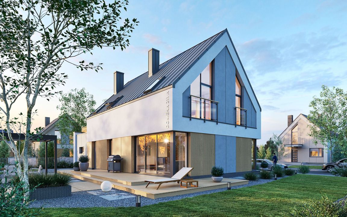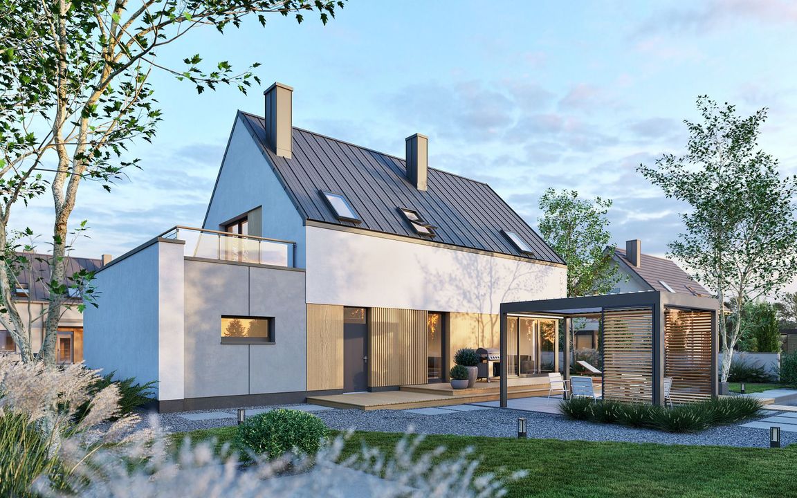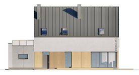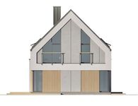 Graficzne opracowanie rzutów poglądowych widocznych na karcie projektu zostało wykonane przez Extradom.pl. Prezentowane przez Extradom.pl wizualizacje wykonane zostały przez autora projektu i należy poczytywać je jedynie za przykład i propozycję wykończenia, wizję architektoniczną autora projektu. Ostateczne wykończenie budynku może nastąpić na wiele sposobów. Szczegółowe rozwiązania zastosowane w oferowanej dokumentacji - w tym również ilość, lokalizacje i wygląd okien, drzwi, kominów - mogą w niewielkim stopniu różnić się od prezentowanej wizualizacji budynku.