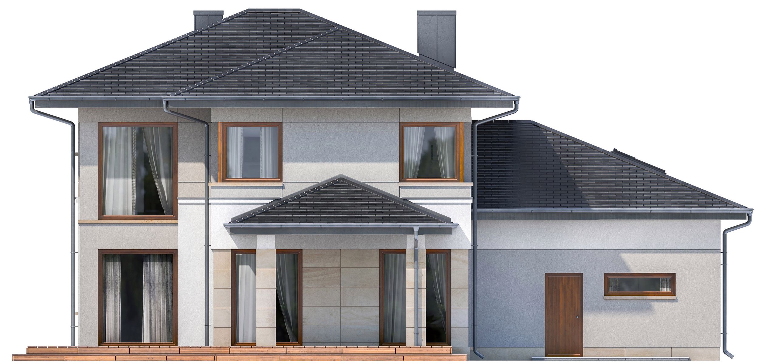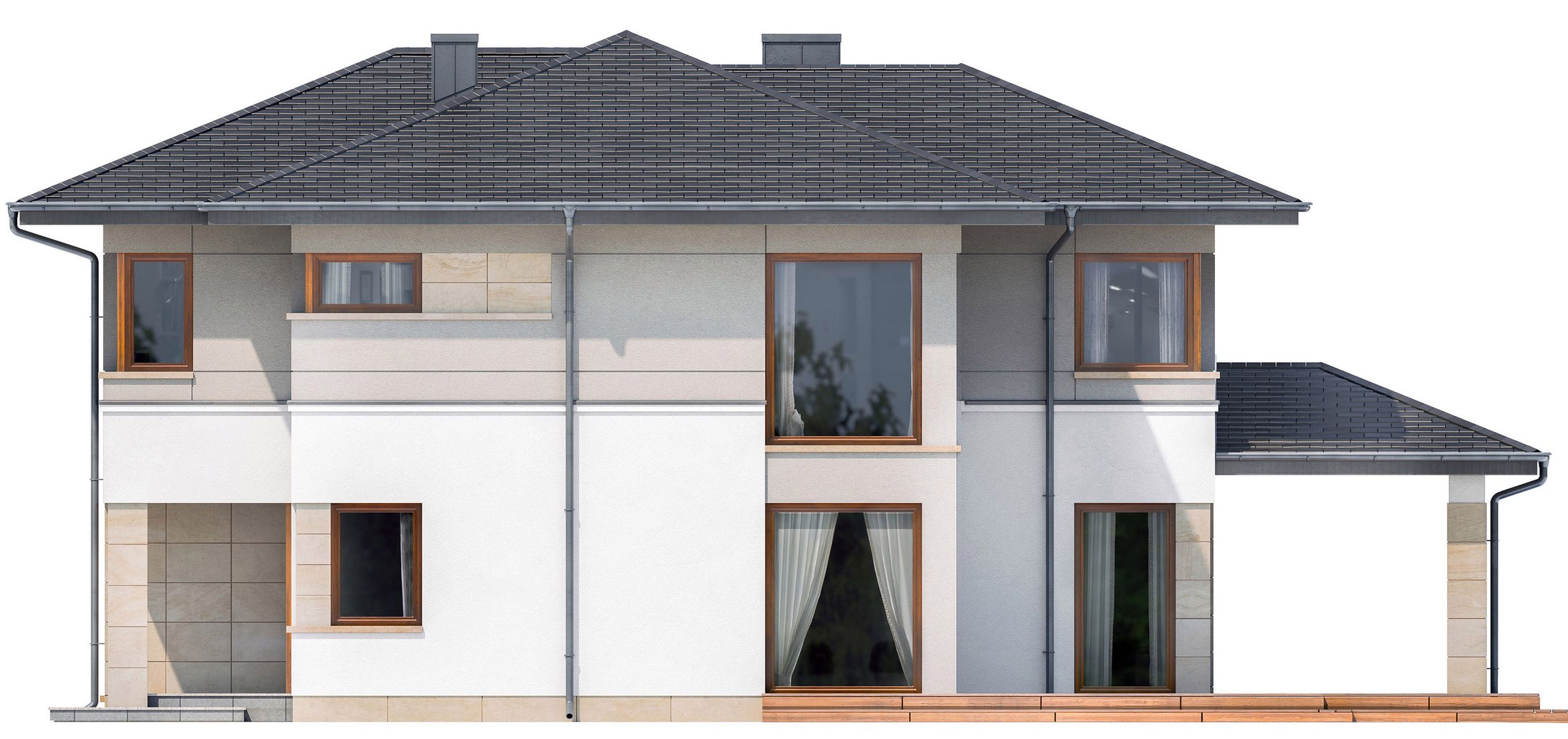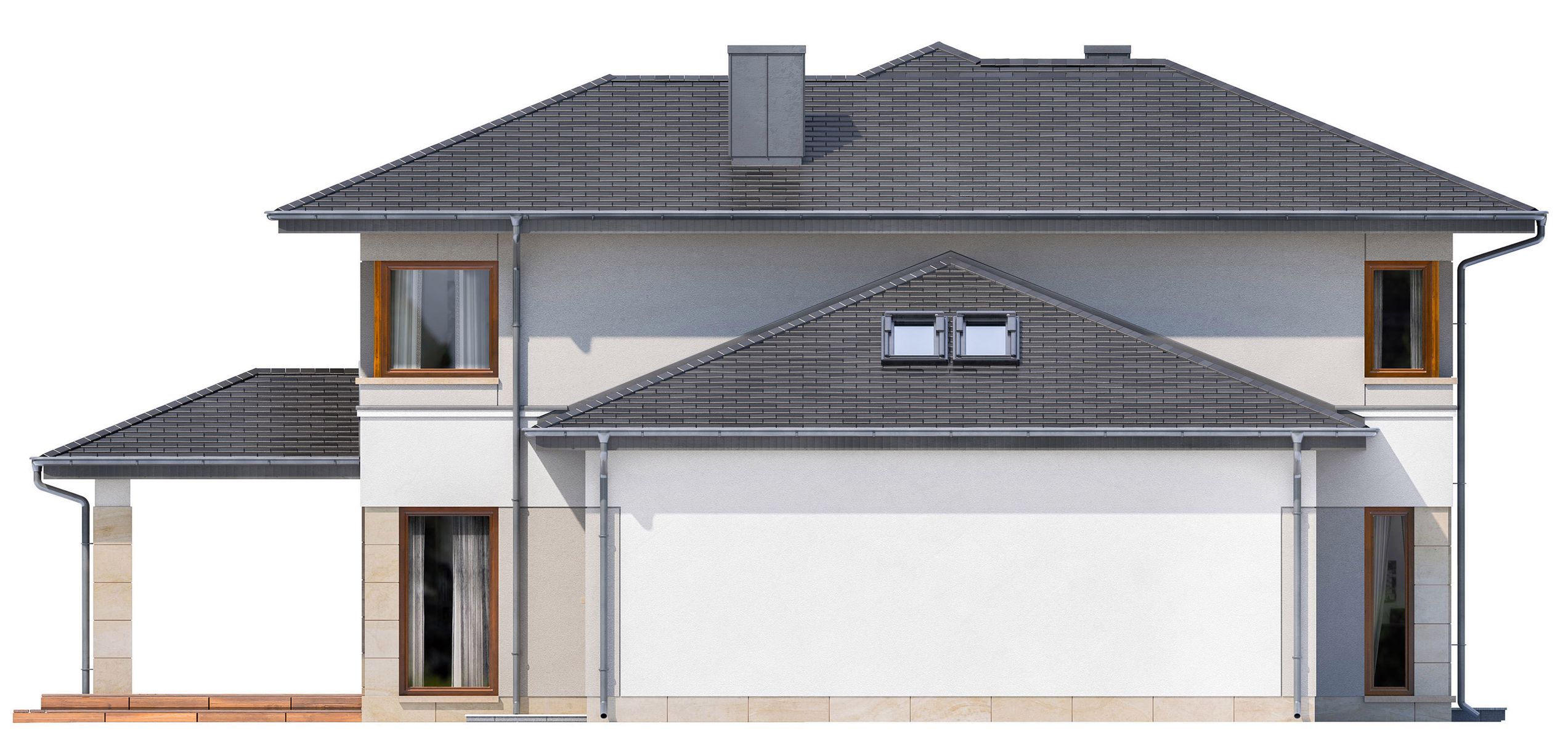 Graficzne opracowanie rzutów poglądowych widocznych na karcie projektu zostało wykonane przez Extradom.pl. Prezentowane przez Extradom.pl wizualizacje wykonane zostały przez autora projektu i należy poczytywać je jedynie za przykład i propozycję wykończenia, wizję architektoniczną autora projektu. Ostateczne wykończenie budynku może nastąpić na wiele sposobów. Szczegółowe rozwiązania zastosowane w oferowanej dokumentacji - w tym również ilość, lokalizacje i wygląd okien, drzwi, kominów - mogą w niewielkim stopniu różnić się od prezentowanej wizualizacji budynku.