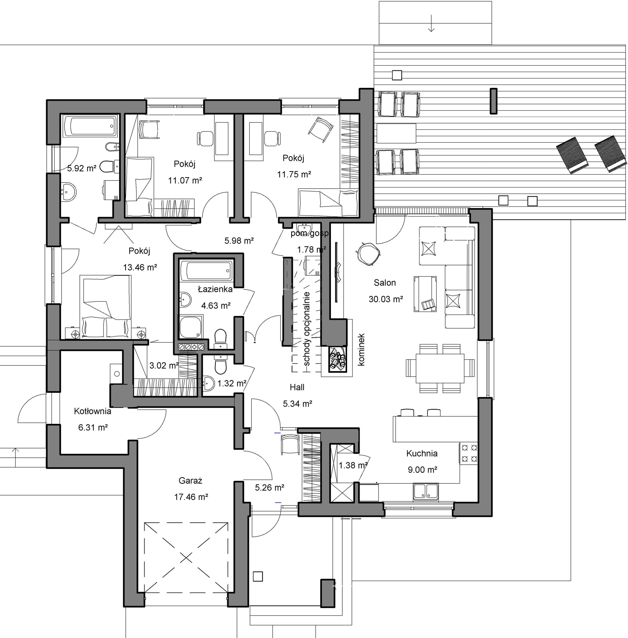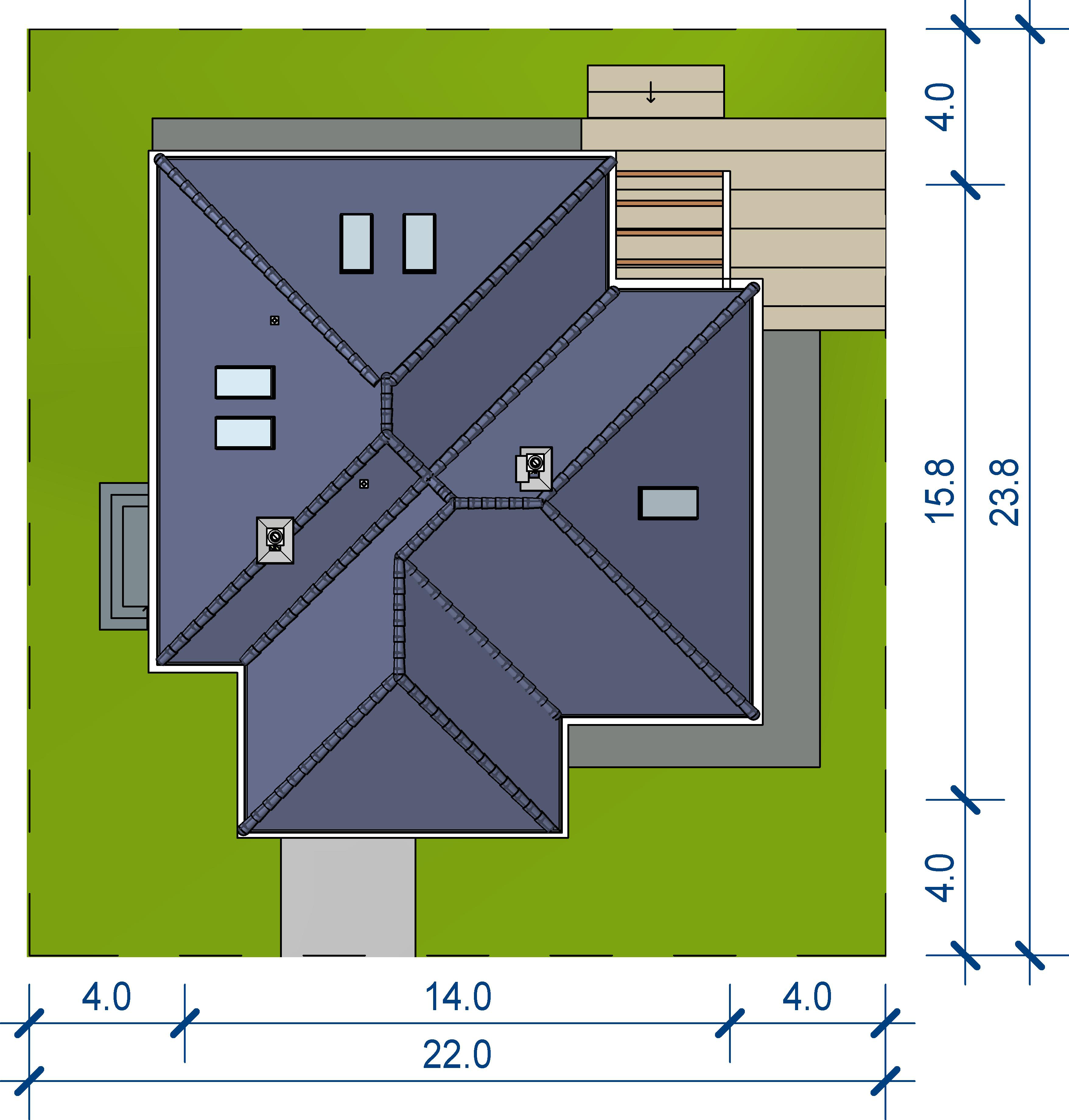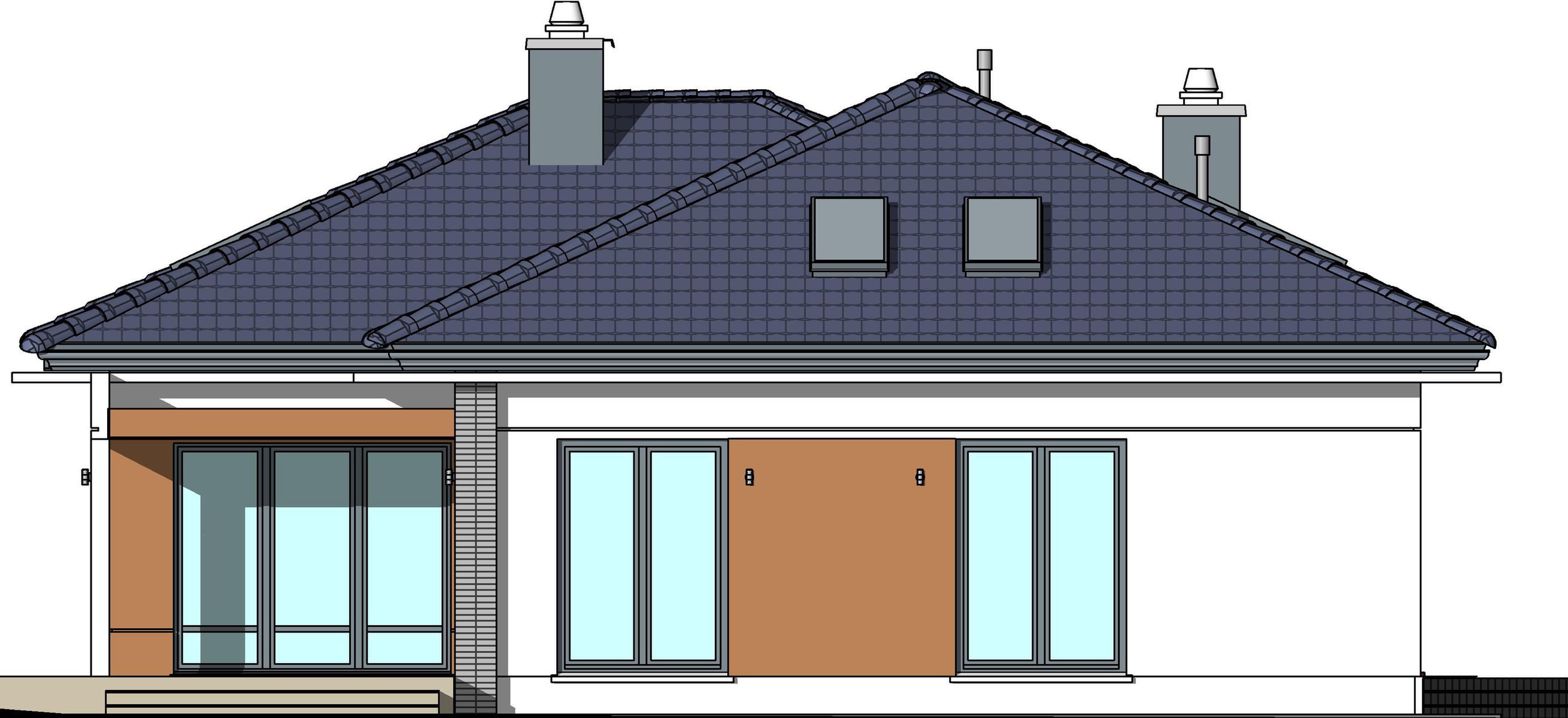 Graficzne opracowanie rzutów poglądowych widocznych na karcie projektu zostało wykonane przez Extradom.pl. Prezentowane przez Extradom.pl wizualizacje wykonane zostały przez autora projektu i należy poczytywać je jedynie za przykład i propozycję wykończenia, wizję architektoniczną autora projektu. Ostateczne wykończenie budynku może nastąpić na wiele sposobów. Szczegółowe rozwiązania zastosowane w oferowanej dokumentacji - w tym również ilość, lokalizacje i wygląd okien, drzwi, kominów - mogą w niewielkim stopniu różnić się od prezentowanej wizualizacji budynku.
