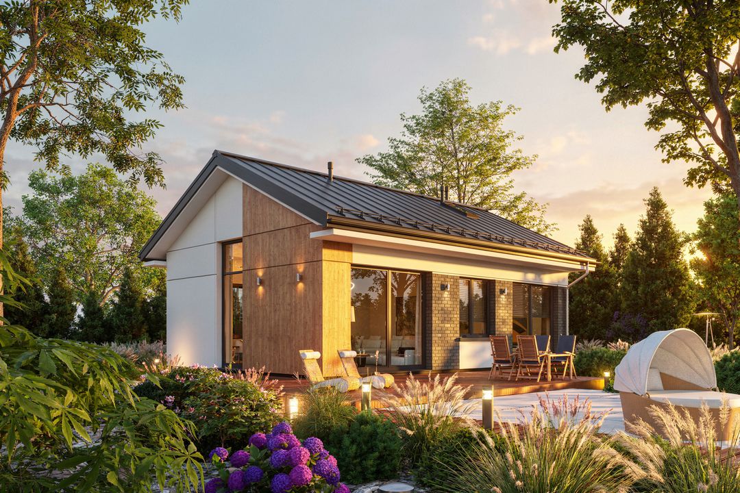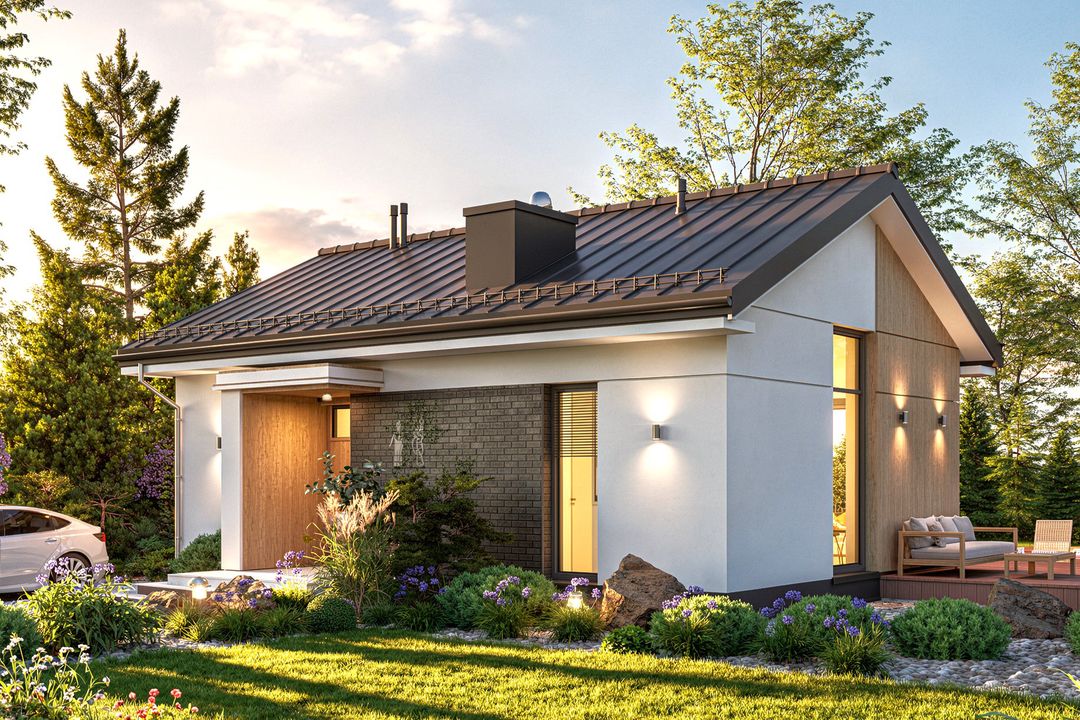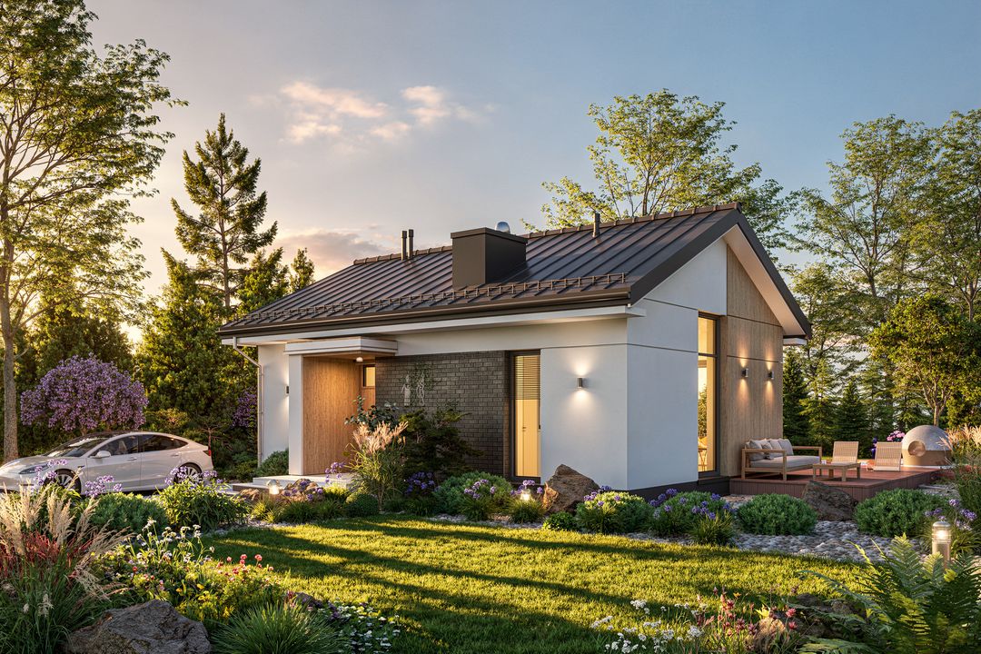 Graficzne opracowanie rzutów poglądowych widocznych na karcie projektu zostało wykonane przez Extradom.pl. Prezentowane przez Extradom.pl wizualizacje wykonane zostały przez autora projektu i należy poczytywać je jedynie za przykład i propozycję wykończenia, wizję architektoniczną autora projektu. Ostateczne wykończenie budynku może nastąpić na wiele sposobów. Szczegółowe rozwiązania zastosowane w oferowanej dokumentacji - w tym również ilość, lokalizacje i wygląd okien, drzwi, kominów - mogą w niewielkim stopniu różnić się od prezentowanej wizualizacji budynku.