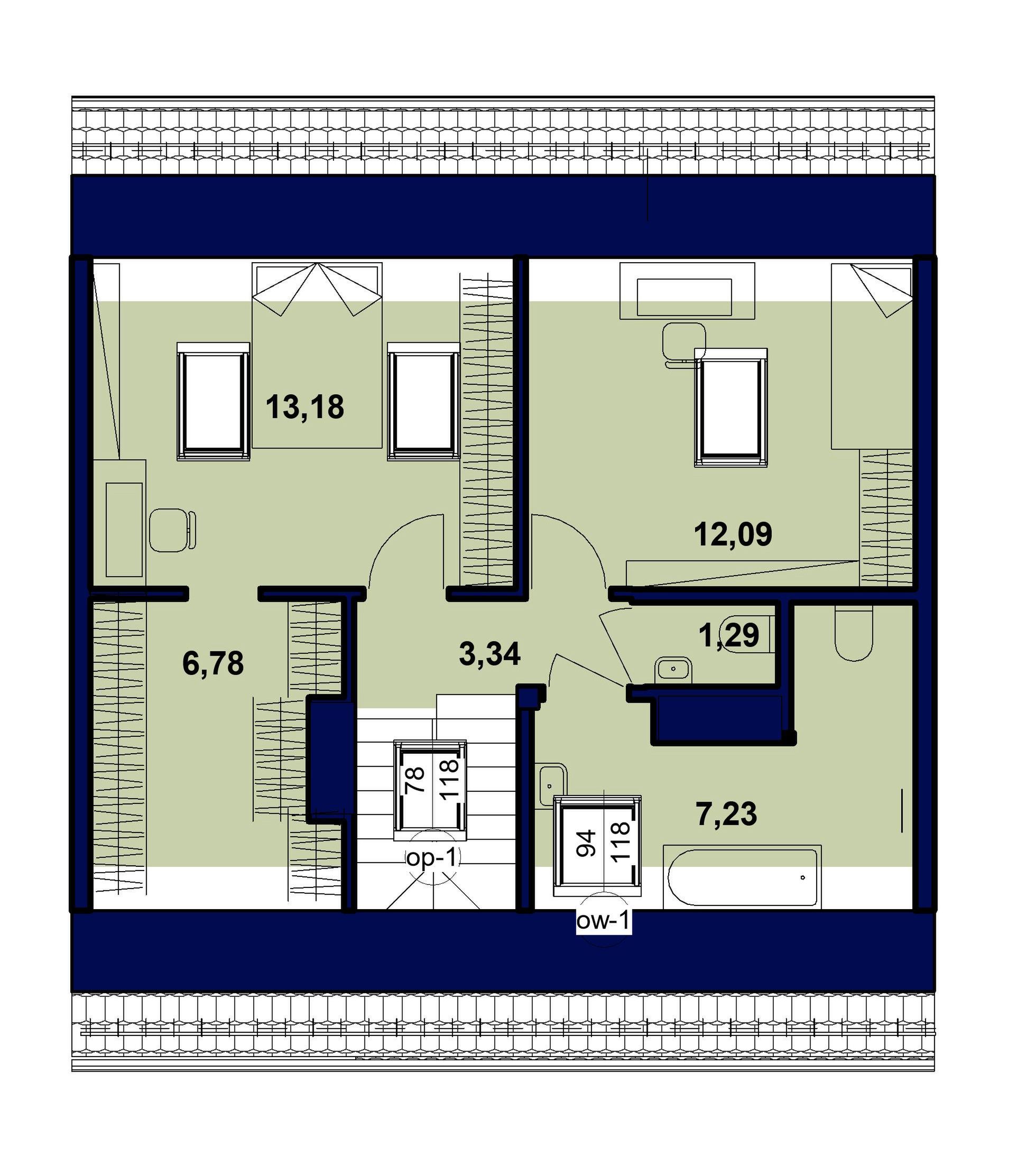 Graficzne opracowanie rzutów poglądowych widocznych na karcie projektu zostało wykonane przez Extradom.pl. Prezentowane przez Extradom.pl wizualizacje wykonane zostały przez autora projektu i należy poczytywać je jedynie za przykład i propozycję wykończenia, wizję architektoniczną autora projektu. Ostateczne wykończenie budynku może nastąpić na wiele sposobów. Szczegółowe rozwiązania zastosowane w oferowanej dokumentacji - w tym również ilość, lokalizacje i wygląd okien, drzwi, kominów - mogą w niewielkim stopniu różnić się od prezentowanej wizualizacji budynku.