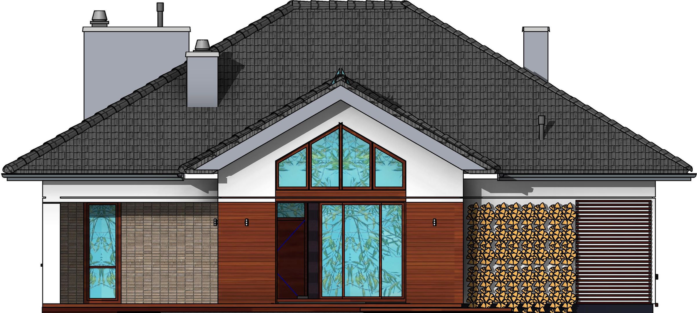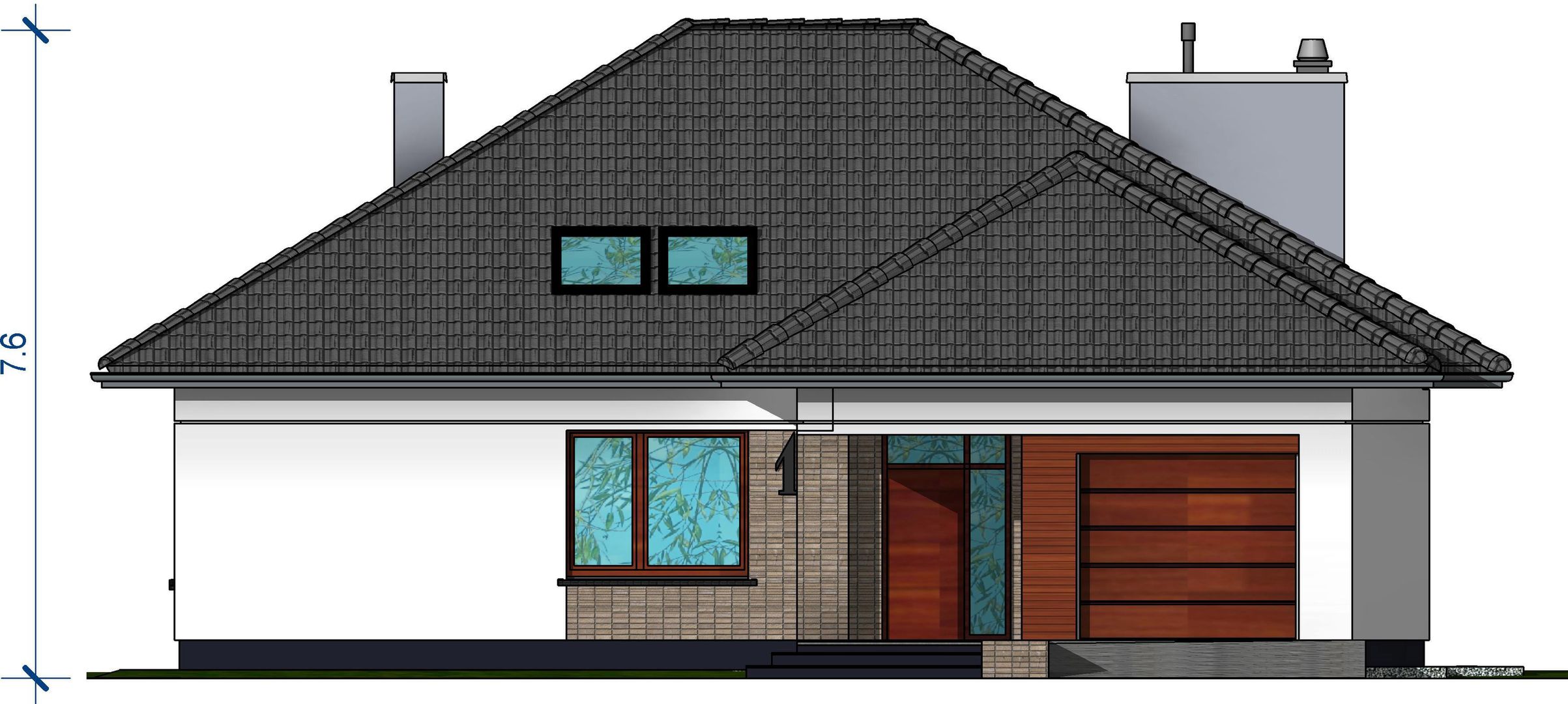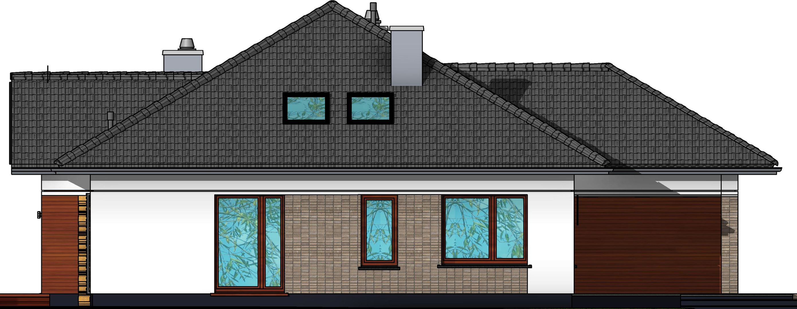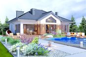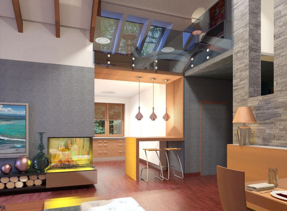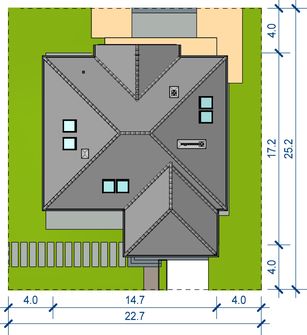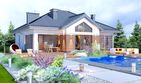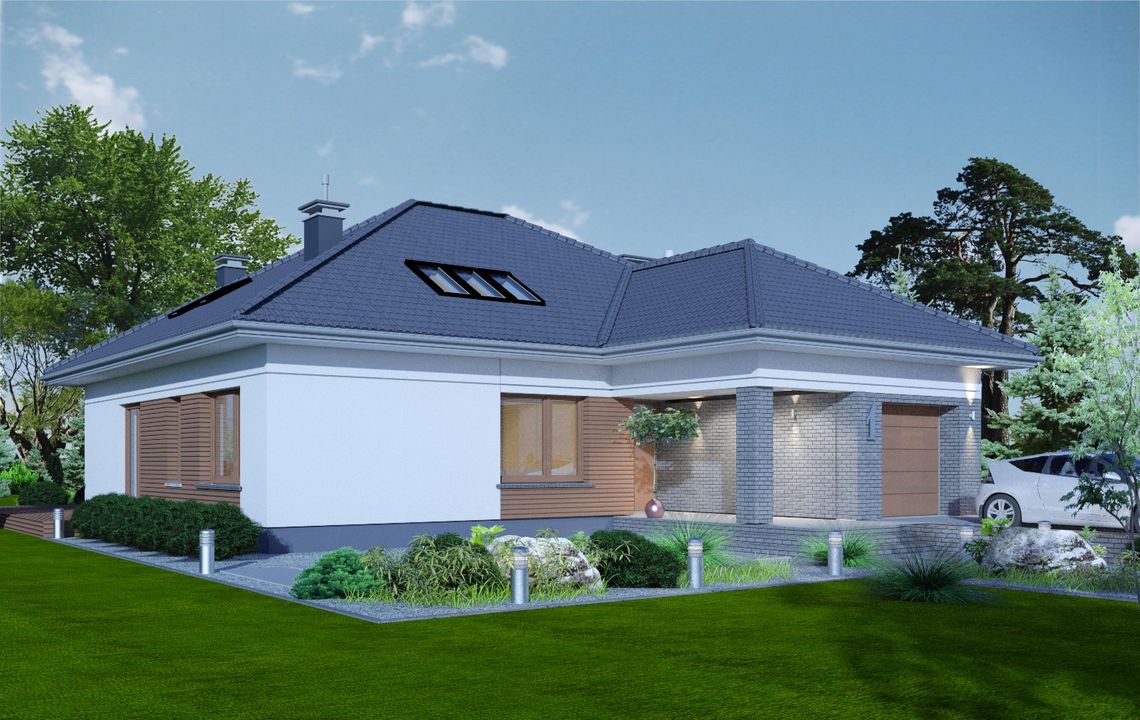 Graficzne opracowanie rzutów poglądowych widocznych na karcie projektu zostało wykonane przez Extradom.pl. Prezentowane przez Extradom.pl wizualizacje wykonane zostały przez autora projektu i należy poczytywać je jedynie za przykład i propozycję wykończenia, wizję architektoniczną autora projektu. Ostateczne wykończenie budynku może nastąpić na wiele sposobów. Szczegółowe rozwiązania zastosowane w oferowanej dokumentacji - w tym również ilość, lokalizacje i wygląd okien, drzwi, kominów - mogą w niewielkim stopniu różnić się od prezentowanej wizualizacji budynku.