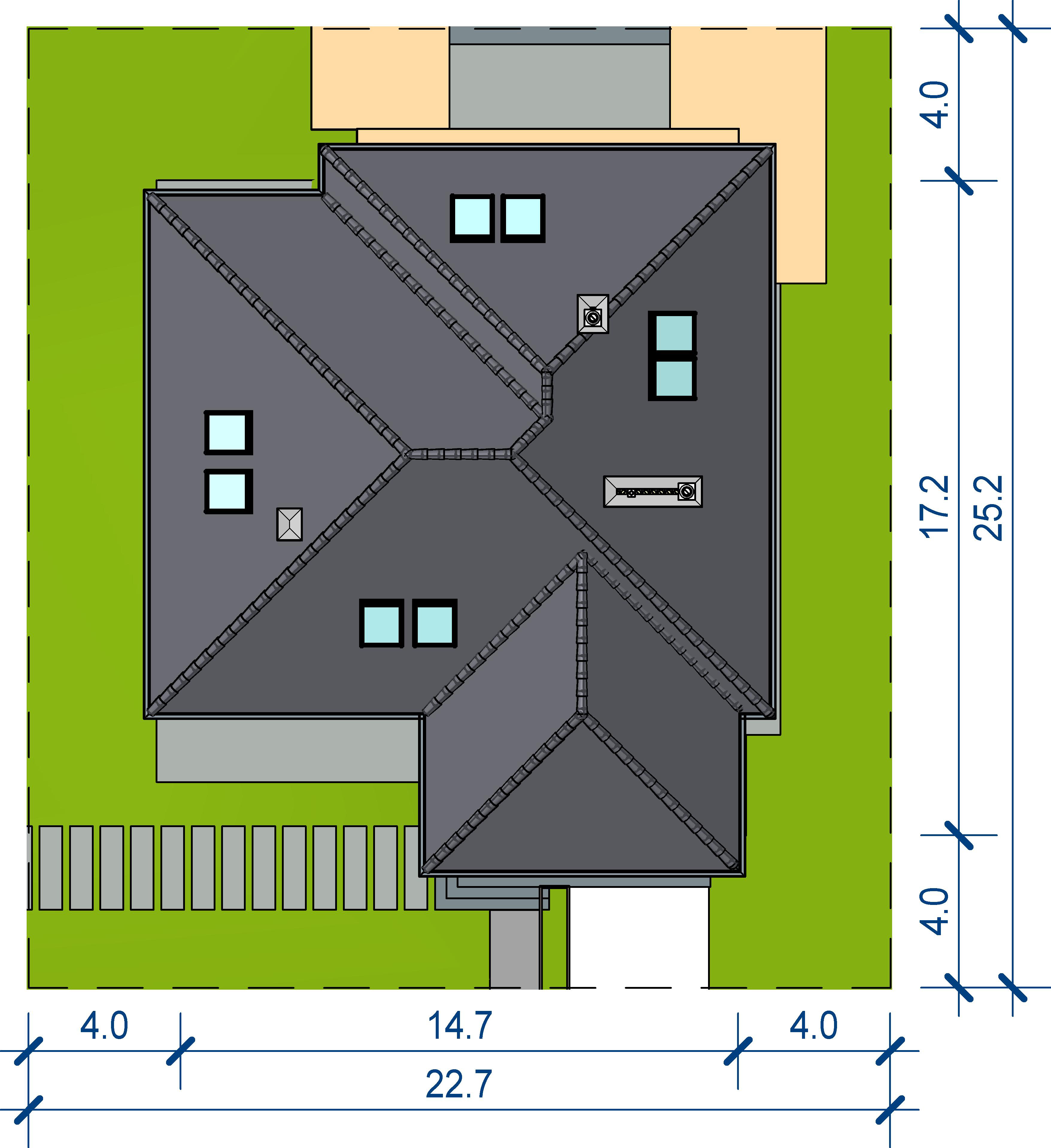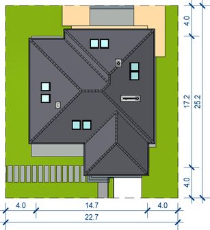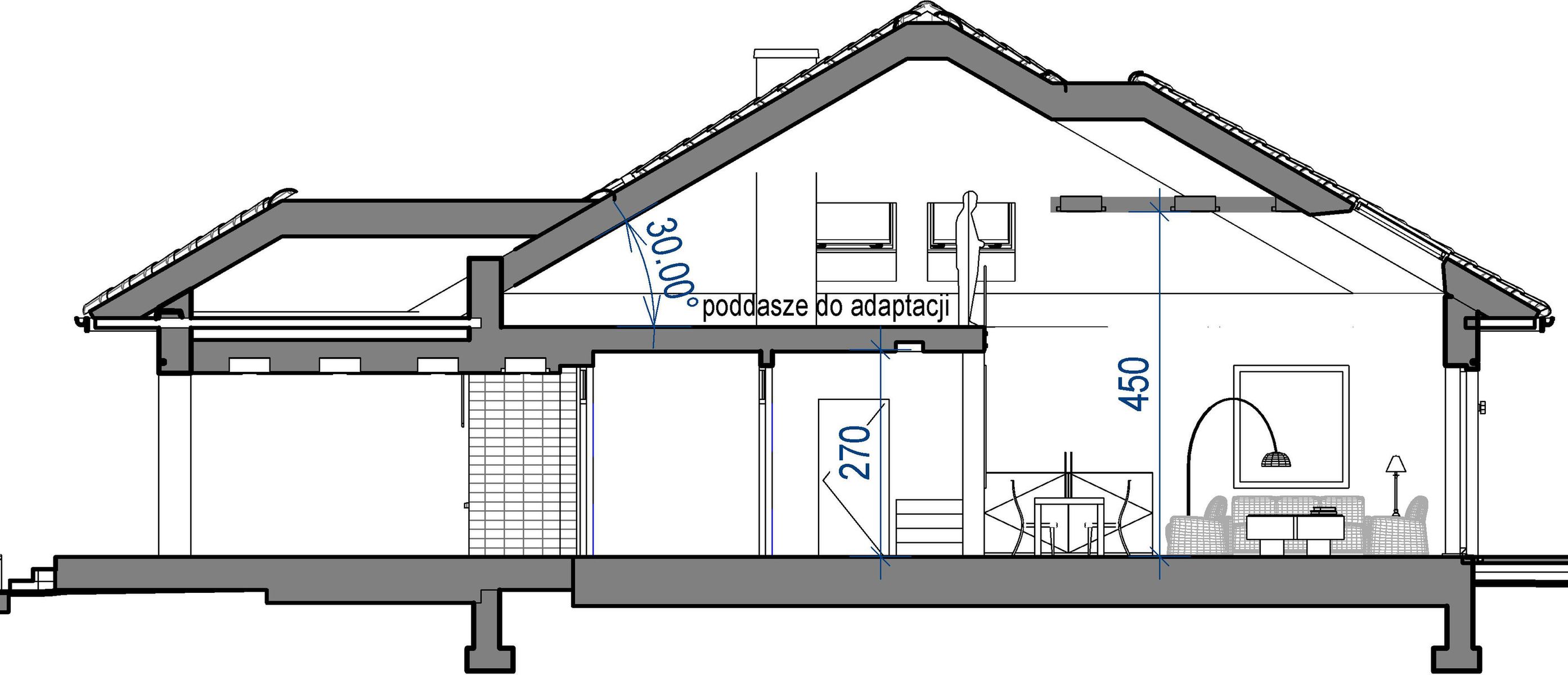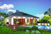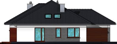 Graficzne opracowanie rzutów poglądowych widocznych na karcie projektu zostało wykonane przez Extradom.pl. Prezentowane przez Extradom.pl wizualizacje wykonane zostały przez autora projektu i należy poczytywać je jedynie za przykład i propozycję wykończenia, wizję architektoniczną autora projektu. Ostateczne wykończenie budynku może nastąpić na wiele sposobów. Szczegółowe rozwiązania zastosowane w oferowanej dokumentacji - w tym również ilość, lokalizacje i wygląd okien, drzwi, kominów - mogą w niewielkim stopniu różnić się od prezentowanej wizualizacji budynku.