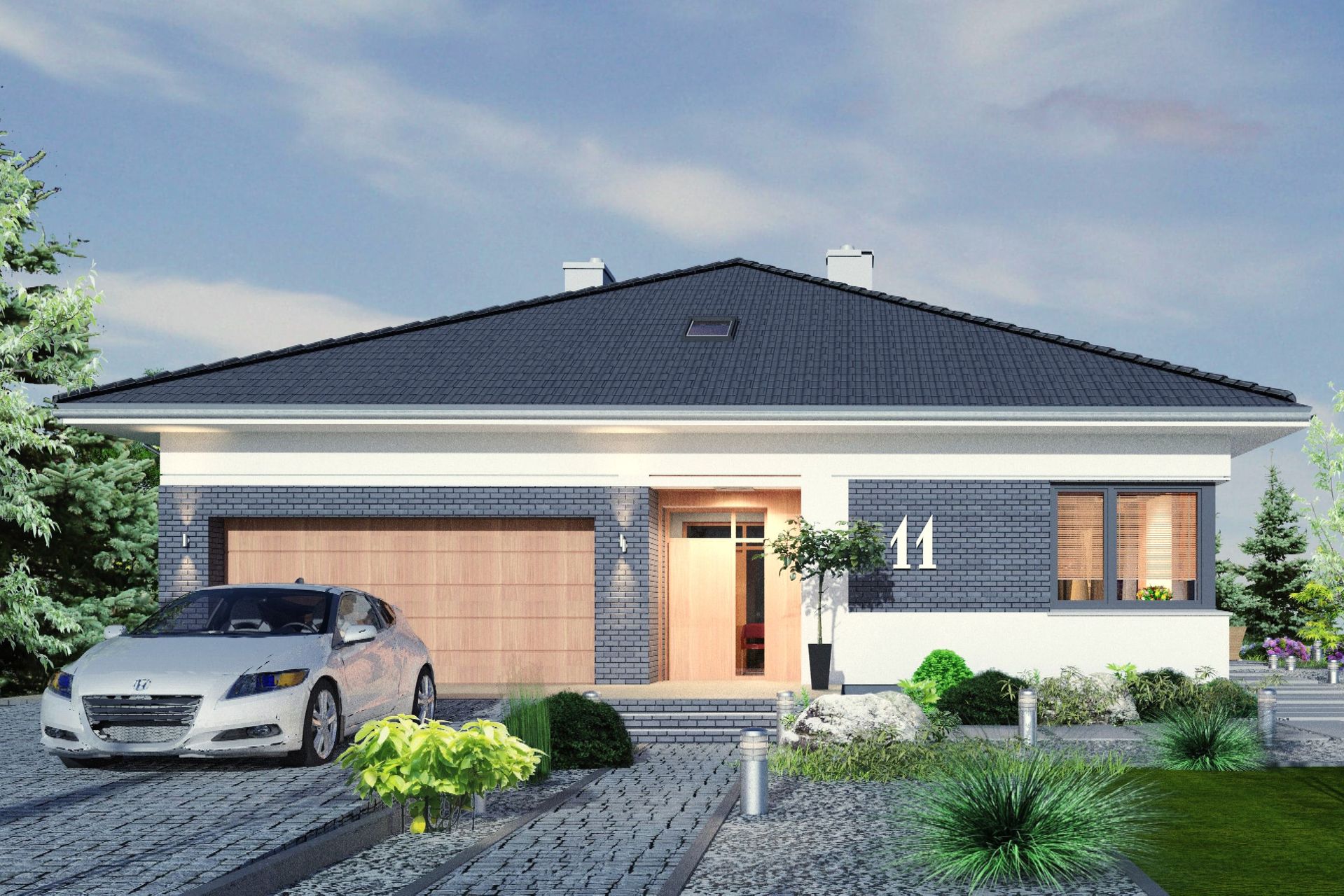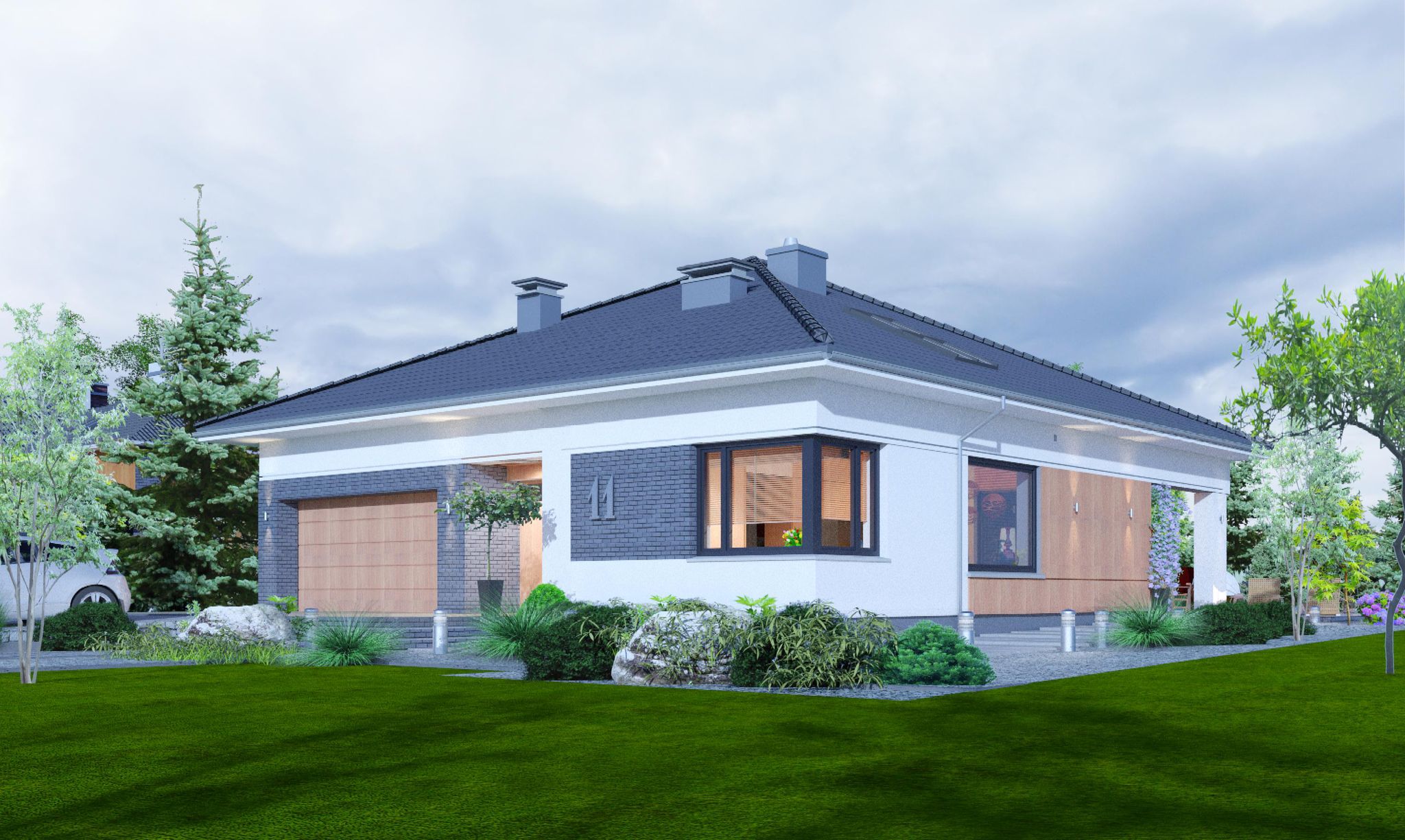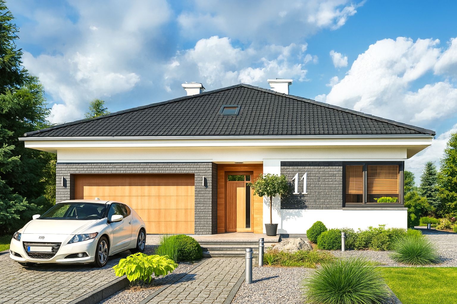 Domidea 3 charakteryzuje się rozłożystą, parterową bryłą o tradycyjnym charakterze, zwieńczoną eleganckim dachem kopertowym. Dwustanowiskowy garaż został zintegrowany z główną częścią budynku, tworząc spójną i harmonijną całość. Zadaszone wejście oraz loggia, tworząca przytulną, osłoniętą część tarasu, dodają budynkowi uroku i funkcjonalności. Duże przeszklenia w strefie dziennej oraz aż dziesięć okien dachowych zapewniają doskonałe doświetlenie wnętrz, w tym przyszłego poddasza.