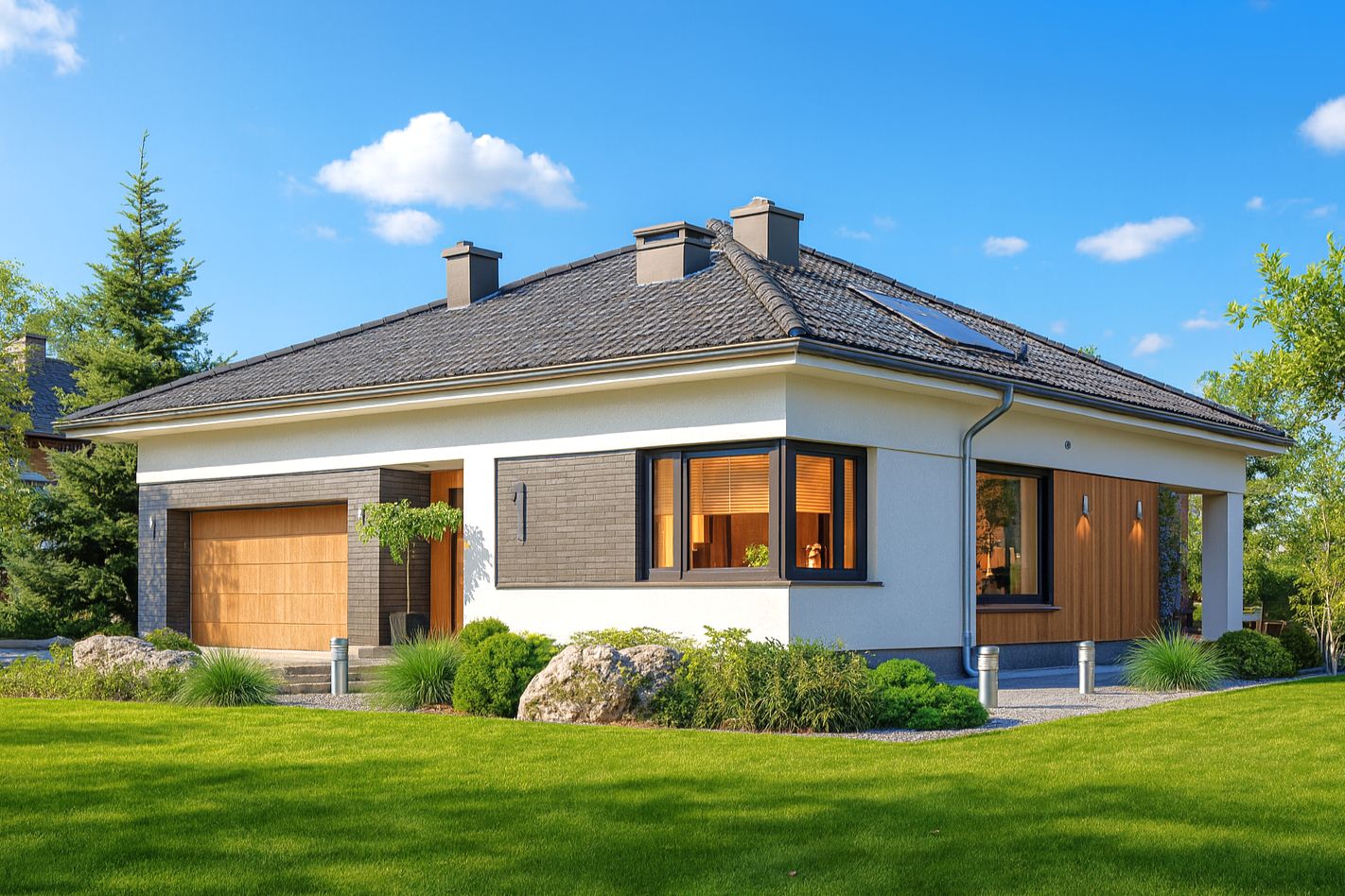 To parterowy dom w tradycyjnym stylu z poddaszem do adaptacji, stworzony z myślą o 3-4 osobowej rodzinie, która ceni sobie komfort, przestrzeń i możliwość rozwoju. Projekt łączy klasyczną elegancję z funkcjonalnością, oferując wysoki salon z antresolą oraz wygodny, dwustanowiskowy garaż wkomponowany w bryłę budynku.