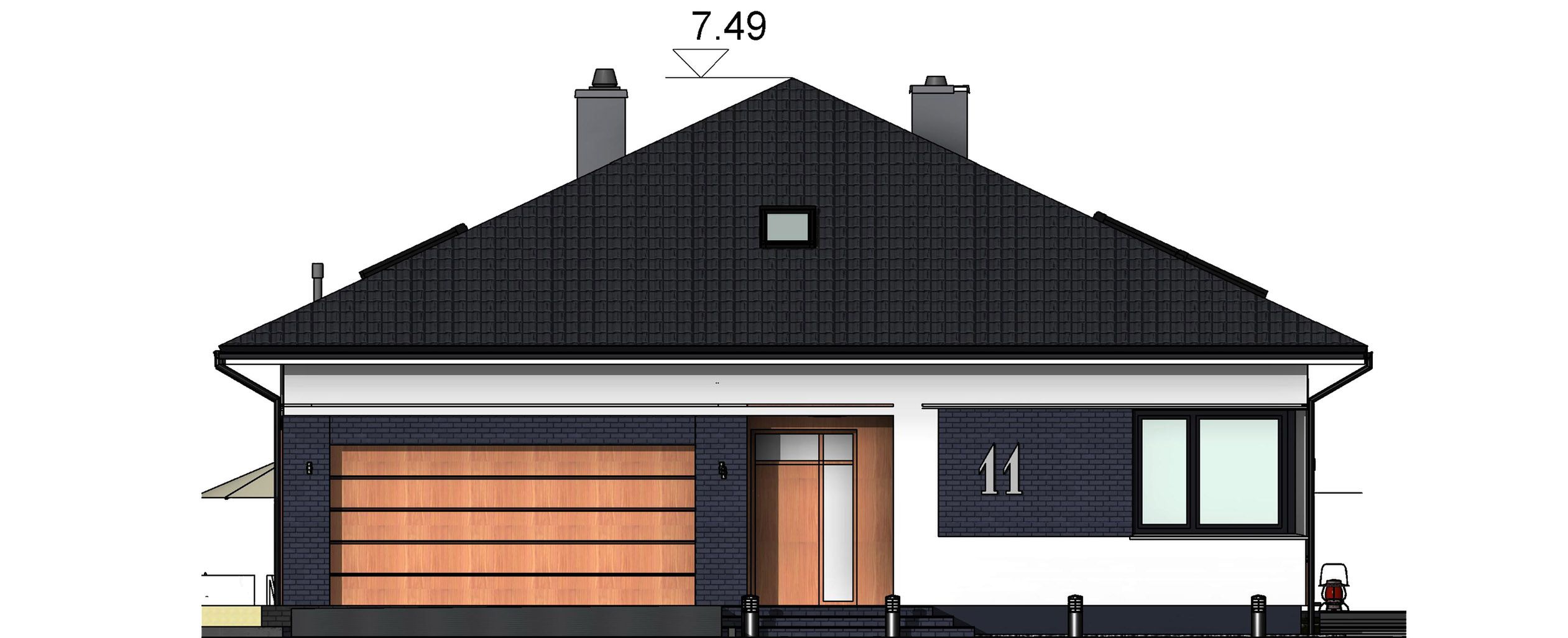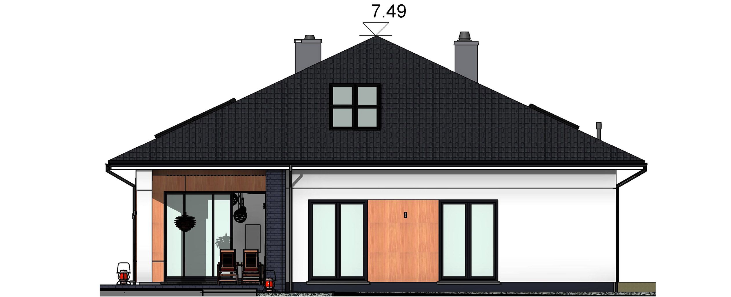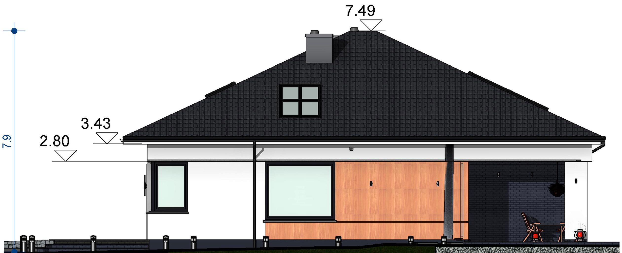 Graficzne opracowanie rzutów poglądowych widocznych na karcie projektu zostało wykonane przez Extradom.pl. Prezentowane przez Extradom.pl wizualizacje wykonane zostały przez autora projektu i należy poczytywać je jedynie za przykład i propozycję wykończenia, wizję architektoniczną autora projektu. Ostateczne wykończenie budynku może nastąpić na wiele sposobów. Szczegółowe rozwiązania zastosowane w oferowanej dokumentacji - w tym również ilość, lokalizacje i wygląd okien, drzwi, kominów - mogą w niewielkim stopniu różnić się od prezentowanej wizualizacji budynku.