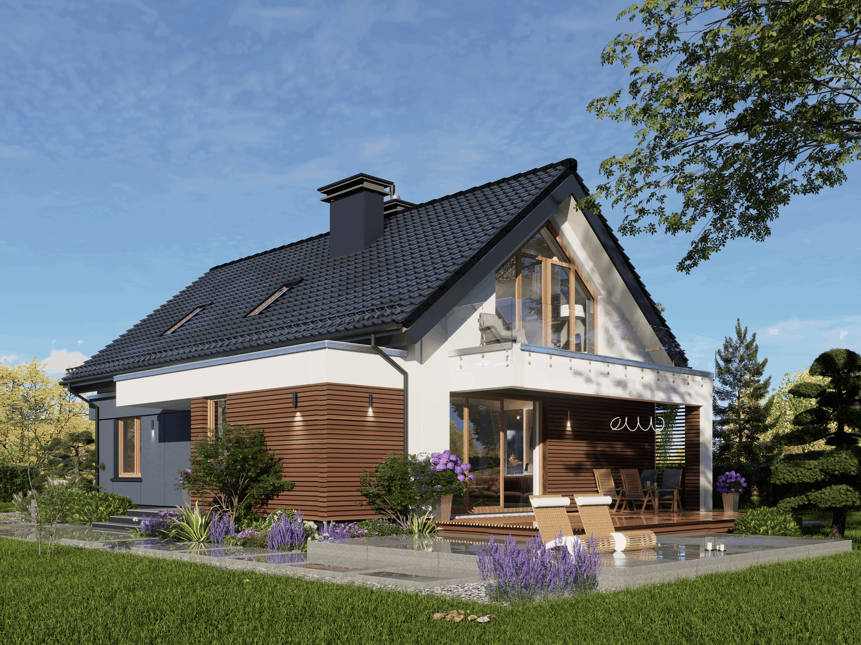 Graficzne opracowanie rzutów poglądowych widocznych na karcie projektu zostało wykonane przez Extradom.pl. Prezentowane przez Extradom.pl wizualizacje wykonane zostały przez autora projektu i należy poczytywać je jedynie za przykład i propozycję wykończenia, wizję architektoniczną autora projektu. Ostateczne wykończenie budynku może nastąpić na wiele sposobów. Szczegółowe rozwiązania zastosowane w oferowanej dokumentacji - w tym również ilość, lokalizacje i wygląd okien, drzwi, kominów - mogą w niewielkim stopniu różnić się od prezentowanej wizualizacji budynku.