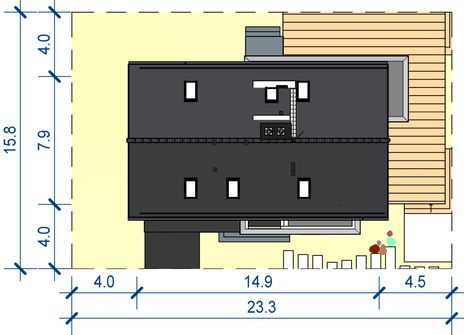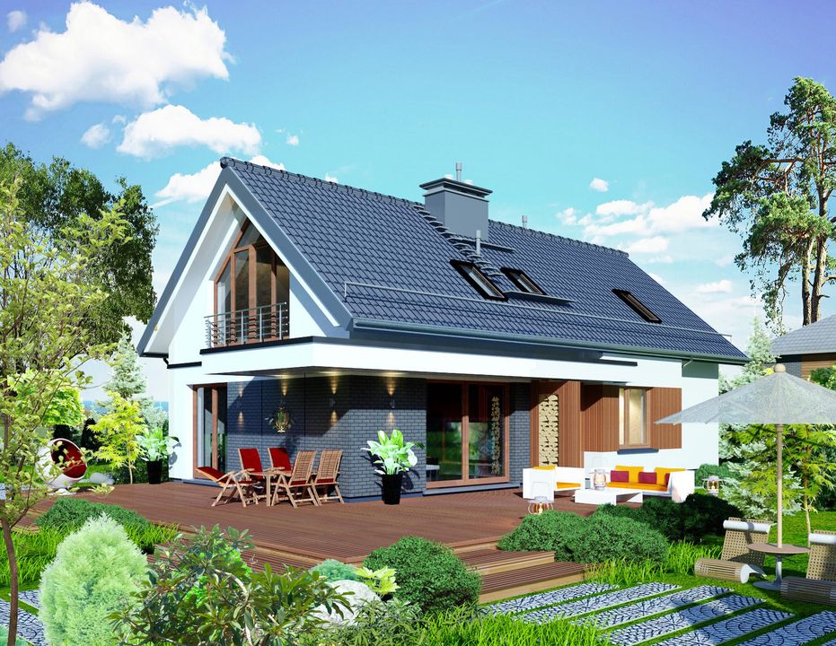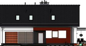 Graficzne opracowanie rzutów poglądowych widocznych na karcie projektu zostało wykonane przez Extradom.pl. Prezentowane przez Extradom.pl wizualizacje wykonane zostały przez autora projektu i należy poczytywać je jedynie za przykład i propozycję wykończenia, wizję architektoniczną autora projektu. Ostateczne wykończenie budynku może nastąpić na wiele sposobów. Szczegółowe rozwiązania zastosowane w oferowanej dokumentacji - w tym również ilość, lokalizacje i wygląd okien, drzwi, kominów - mogą w niewielkim stopniu różnić się od prezentowanej wizualizacji budynku.