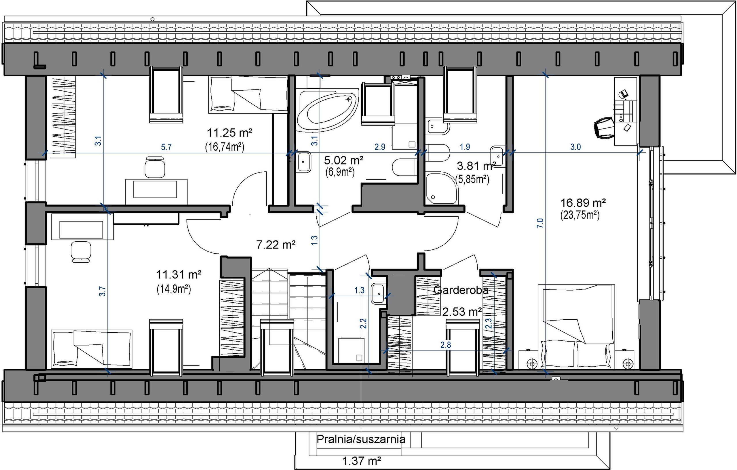 Uwaga! Powierzchnia użytkowa podana w dokumentacji projektowej może być mniejsza o ok. 3-4 mkw od podanej na stronie. Jest to związane wyłącznie ze zmianą sposobu liczenia pow. użytkowej. Wymiary budynku i jego forma nie ulegną zmianie. Zmiana dotyczy projektów dostosowanych do nowej formy dokumentacji 3+.