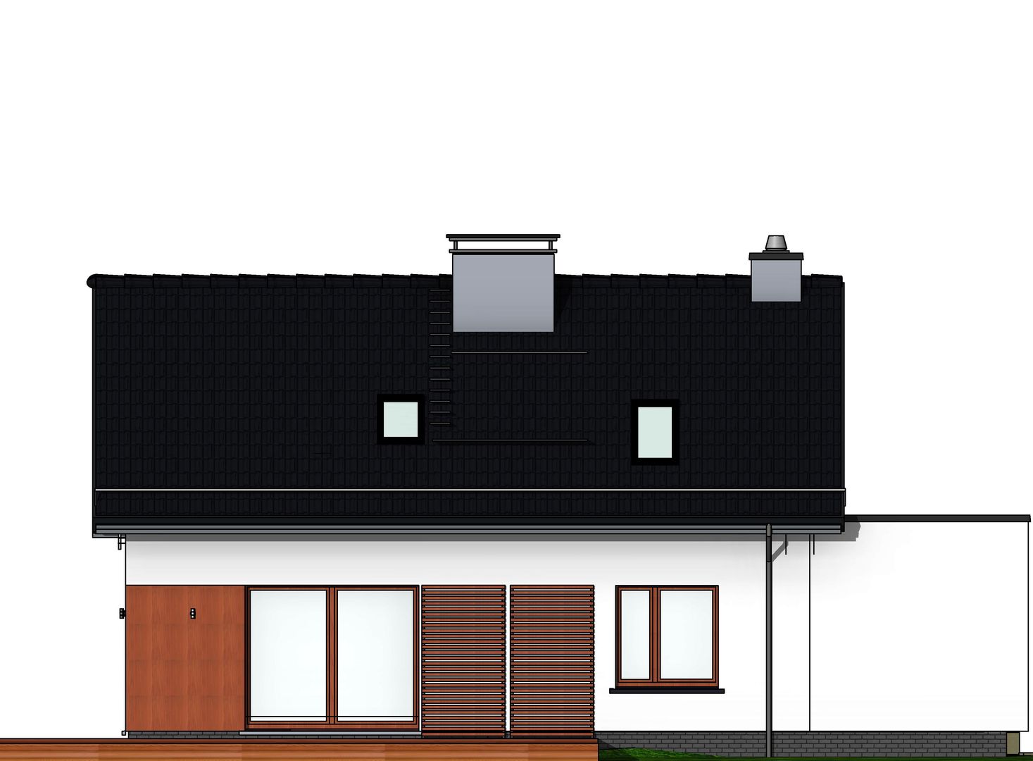 Graficzne opracowanie rzutów poglądowych widocznych na karcie projektu zostało wykonane przez Extradom.pl. Prezentowane przez Extradom.pl wizualizacje wykonane zostały przez autora projektu i należy poczytywać je jedynie za przykład i propozycję wykończenia, wizję architektoniczną autora projektu. Ostateczne wykończenie budynku może nastąpić na wiele sposobów. Szczegółowe rozwiązania zastosowane w oferowanej dokumentacji - w tym również ilość, lokalizacje i wygląd okien, drzwi, kominów - mogą w niewielkim stopniu różnić się od prezentowanej wizualizacji budynku.