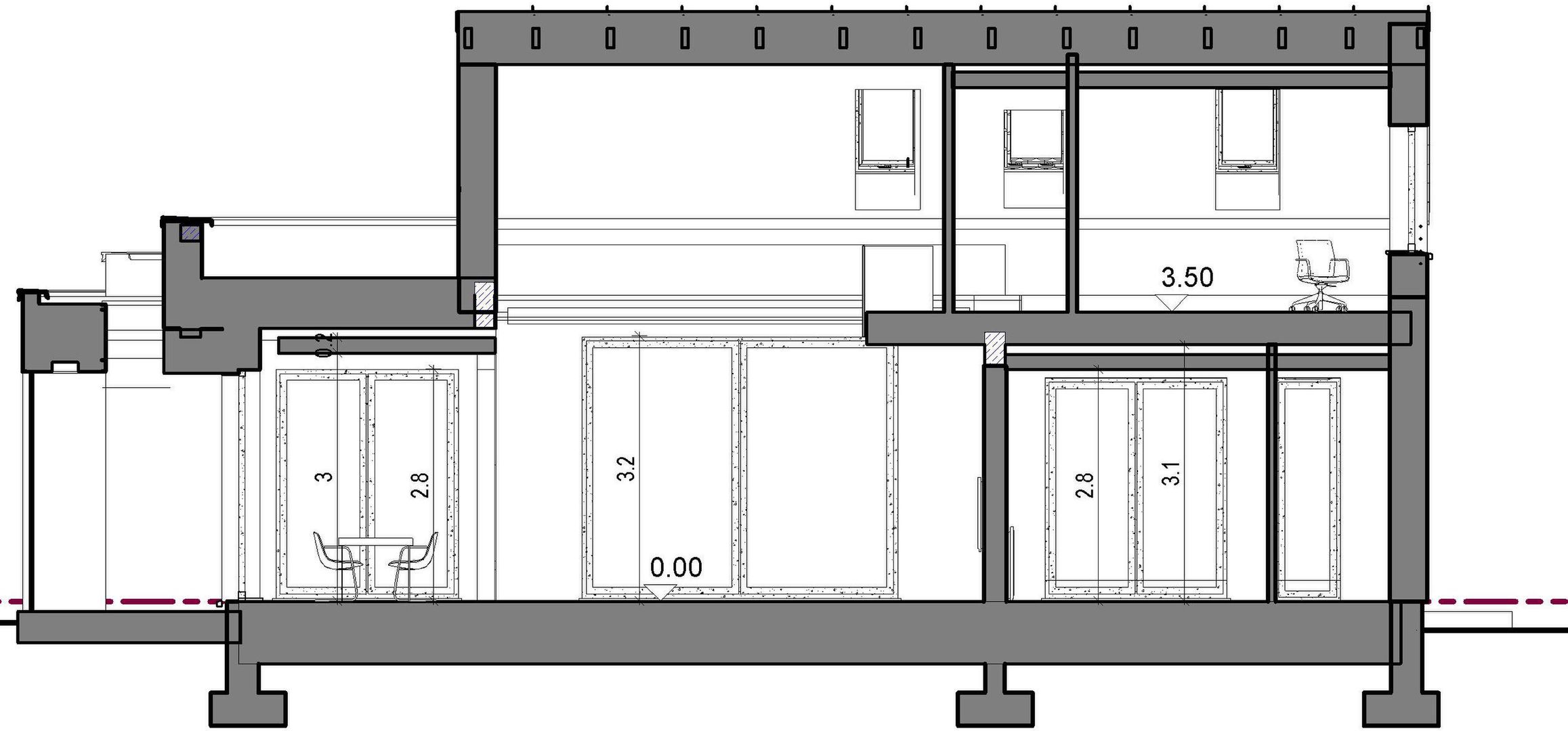 Ściany: murowane - Silka. Stropy: żelbetowe monolityczne. Schody: częściowo żelbetowe. Monolityczne, częściowo drewniane wspornikowe. Więźba - tradycyjna drewniana. Pokrycie dachu: blacha na rąbek stojący. Ogrzewanie gazowe. Wentylacja z rekuperacją. Ogrzewanie podłogowe / grzejniki. Elewacje tynkowane, częściowo obłożone betonem architektonicznym i okładziną elewacyjną HPL.
