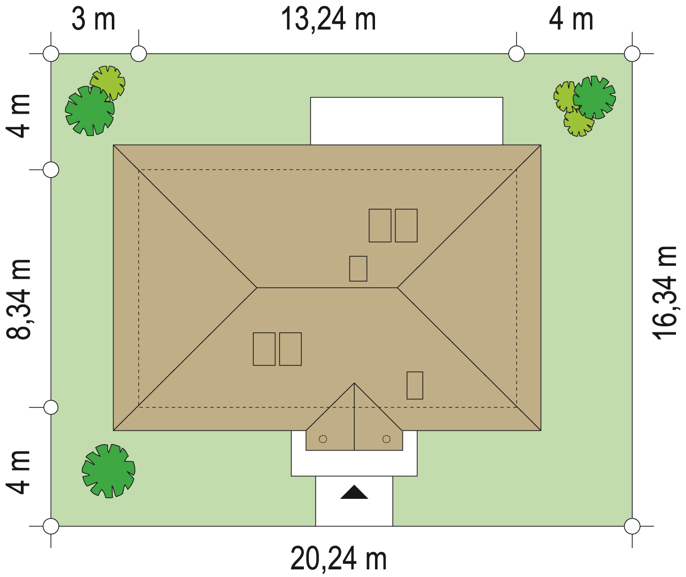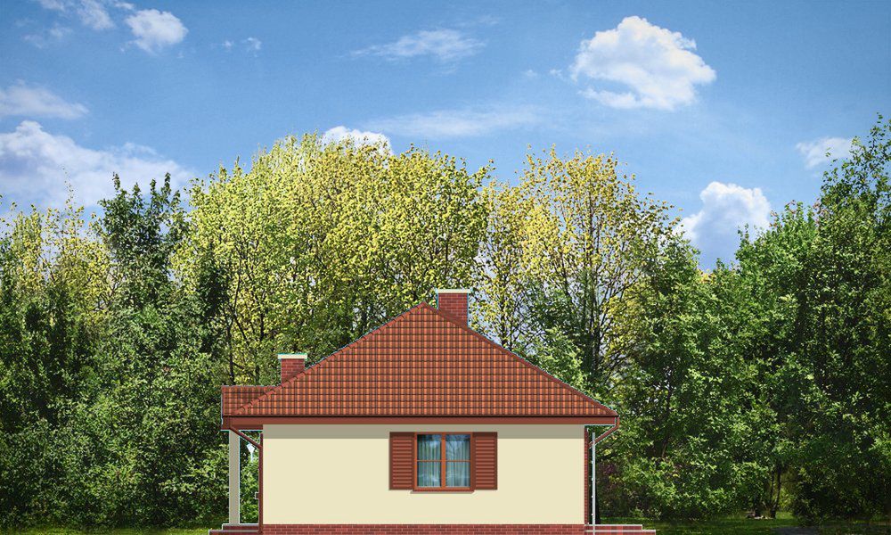 Fundamenty: betonowe. Ściany: pustaki ceramiczne max + styropian. Strop: Teriva. Elewacje: tynk cienkowarstwowy. Pokrycie dachu: blachodachówka lub dachówka ceramiczna. Nachylenie dachu: 30 stopni.