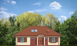 Graficzne opracowanie rzutów poglądowych widocznych na karcie projektu zostało wykonane przez Extradom.pl. Prezentowane przez Extradom.pl wizualizacje wykonane zostały przez autora projektu i należy poczytywać je jedynie za przykład i propozycję wykończenia, wizję architektoniczną autora projektu. Ostateczne wykończenie budynku może nastąpić na wiele sposobów. Szczegółowe rozwiązania zastosowane w oferowanej dokumentacji - w tym również ilość, lokalizacje i wygląd okien, drzwi, kominów - mogą w niewielkim stopniu różnić się od prezentowanej wizualizacji budynku.