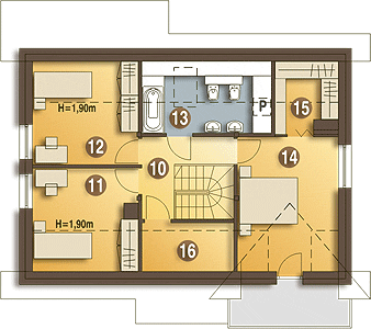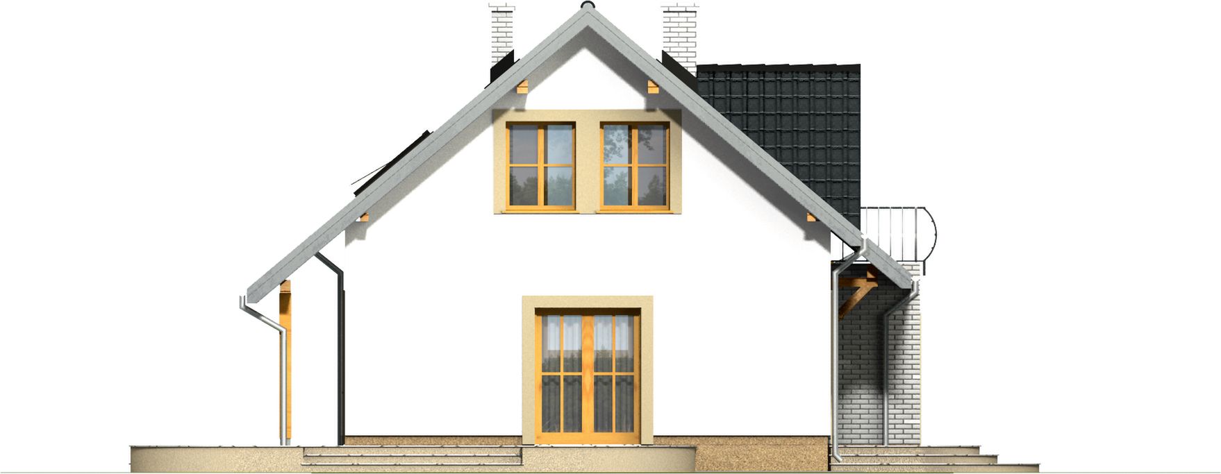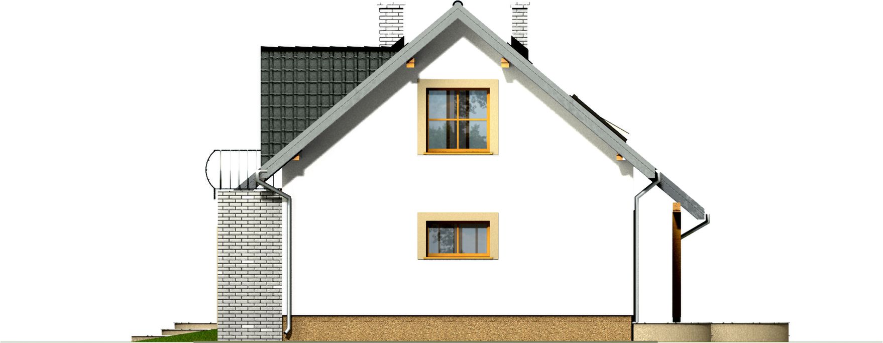 Graficzne opracowanie rzutów poglądowych widocznych na karcie projektu zostało wykonane przez Extradom.pl. Prezentowane przez Extradom.pl wizualizacje wykonane zostały przez autora projektu i należy poczytywać je jedynie za przykład i propozycję wykończenia, wizję architektoniczną autora projektu. Ostateczne wykończenie budynku może nastąpić na wiele sposobów. Szczegółowe rozwiązania zastosowane w oferowanej dokumentacji - w tym również ilość, lokalizacje i wygląd okien, drzwi, kominów - mogą w niewielkim stopniu różnić się od prezentowanej wizualizacji budynku.