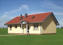 Zależało nam na znalezieniu projektu domu, który umożliwiałby przeznaczenie części jego powierzchni na cele usługowe. Z tego względu skupiliśmy się, aby uwzględniał on pokój o sporych rozmiarach, który byłby oddzielony od pozostałych pomieszczeń, tak abyśmy mogli zaadaptować go na salę sprzedażową. Oprócz tego, od początku interesował nas budynek parterowy, a spośród propozycji spełniających powyższe kryteria wybraliśmy projekt domu Domino-2 - szkielet drewniany prefabryk. KRD1821.W trakcie realizacji nie natrafiliśmy na żadne niesprzyjające sytuacje, a fachowcy nie mieli obiekcji do dokumentacji technicznej. Postawienie domu wraz z wykonaniem wszelkich wewnętrznych prac wykończeniowych trwało w naszym przypadku 1 rok i 2 miesiące. Na tamtą chwilę do ostatecznego zakończenia inwestycji zostało nam jedynie zewnętrzne otynkowanie bryły, aczkolwiek wiązało się to z długim czasem oczekiwania na fachowców.Do wymurowania ścian użyliśmy bloczków z betonu komórkowego. Więźbę dachową wykonaliśmy z gotowych prefabrykowanych elementów i tym samym strop został zrobiony w lekkiej, podwieszanej konstrukcji. Dach pokryliśmy gontem bitumicznym. Oszacowany przez architekta kosztorys został moim zdaniem dobrze wyliczony i można się nim sugerować - koszty naszej budowy na etapie stanu surowego zamkniętego były zbliżone do podanej w nim kwoty.Nasz dom usytuowany jest na działce w ten sposób iż, wyjście tarasowe znajduje się na południowym zachodzie, zaś front mamy od północnego wschodu. Przy takim ułożeniu, przed zamontowaniem rolet słońca było dostatecznie dużo, jednak po ich zainstalowaniu, do pomieszczeń nie dostaje się już tyle światła. Zaproponowane w projekcie domu Domino-2 - szkielet drewniany prefabryk. KRD1821 okna nie są za duże, więc można pomyśleć nad ich powiększeniem.Do projektu domu Domino-2 - szkielet drewniany prefabryk. KRD1821 wprowadziliśmy jedynie kosmetyczne poprawki polegające na delikatnym przesunięciu kilku ścianek działowych. Były to jednak niewielkie zmiany do max. 30 cm, więc w dalszym ciągu układ pomieszczeń jest zgodny z oryginalnym. Nie mam w tej kwestii żadnych zastrzeżeń i na tą chwilę nie nanosiłbym już innych modyfikacji. Nowy dom w pełni mnie satysfakcjonuje. Pozdrawiam.
