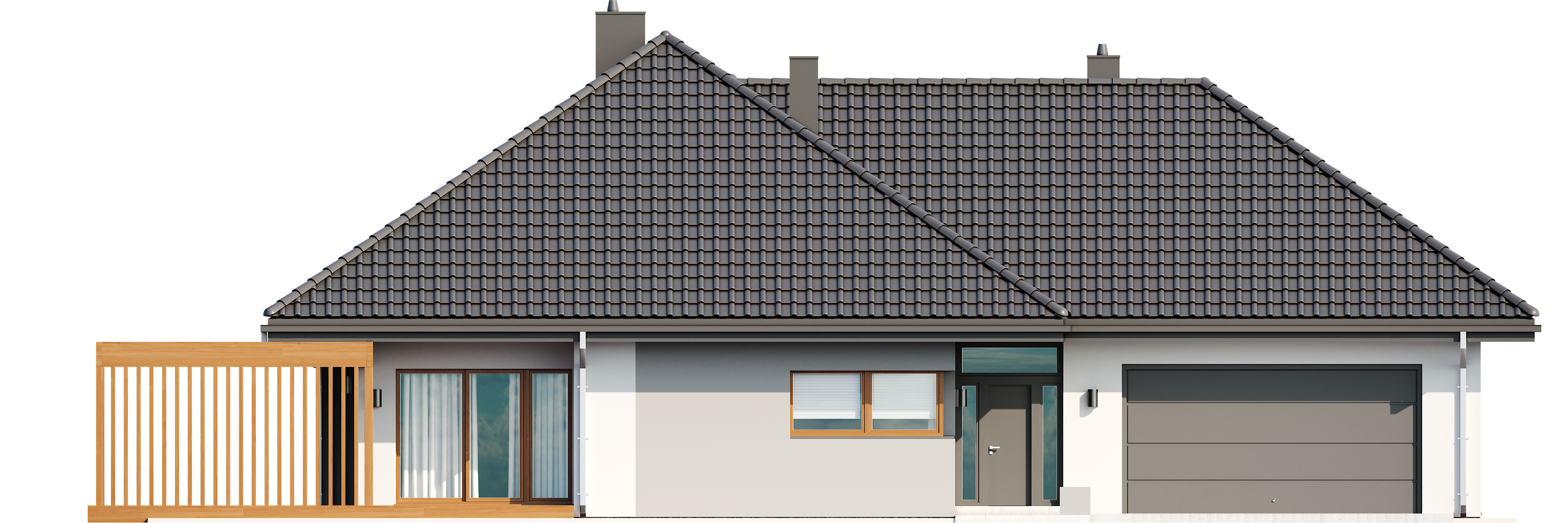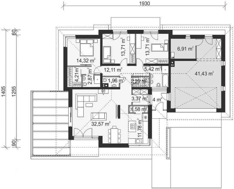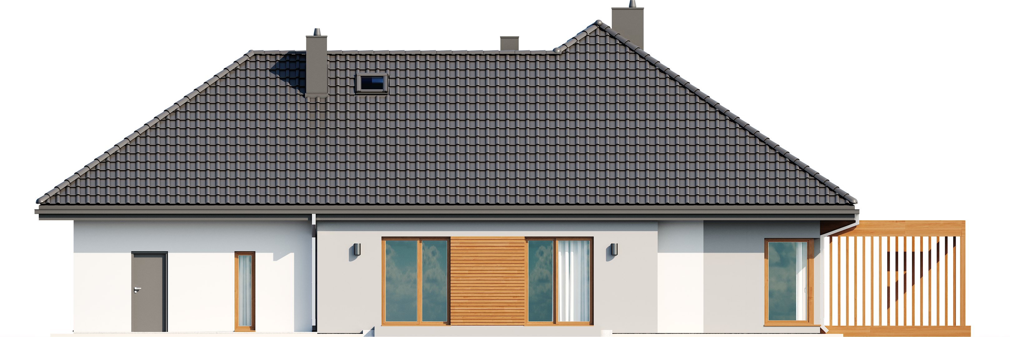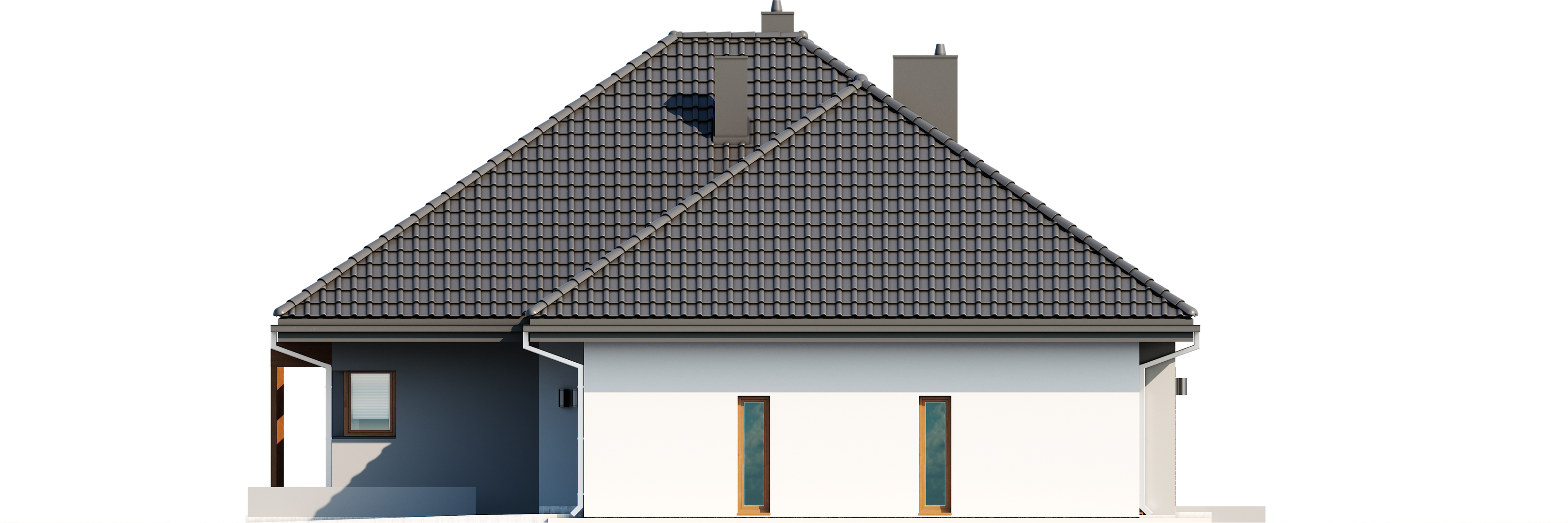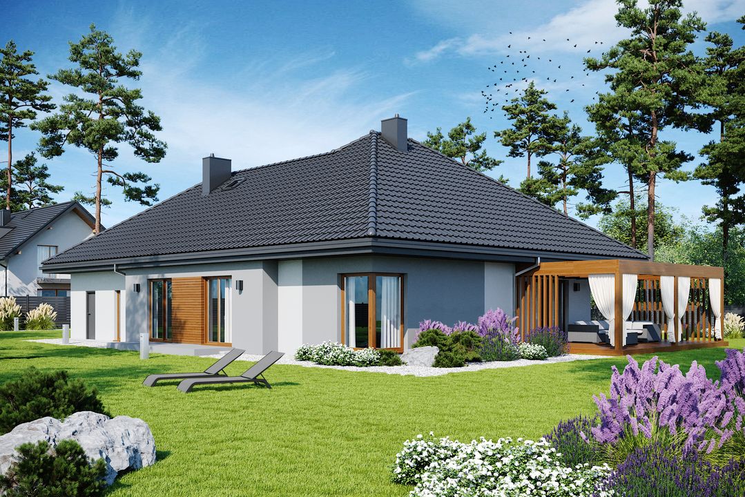 Graficzne opracowanie rzutów poglądowych widocznych na karcie projektu zostało wykonane przez Extradom.pl. Prezentowane przez Extradom.pl wizualizacje wykonane zostały przez autora projektu i należy poczytywać je jedynie za przykład i propozycję wykończenia, wizję architektoniczną autora projektu. Ostateczne wykończenie budynku może nastąpić na wiele sposobów. Szczegółowe rozwiązania zastosowane w oferowanej dokumentacji - w tym również ilość, lokalizacje i wygląd okien, drzwi, kominów - mogą w niewielkim stopniu różnić się od prezentowanej wizualizacji budynku.