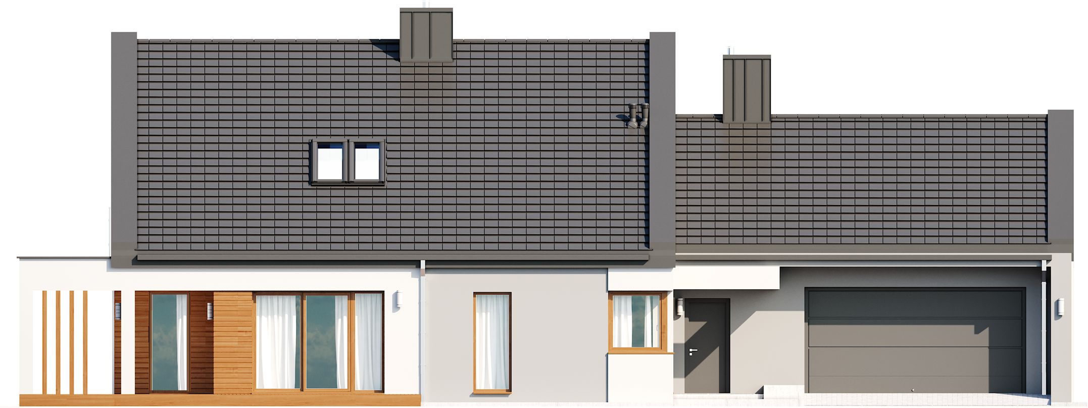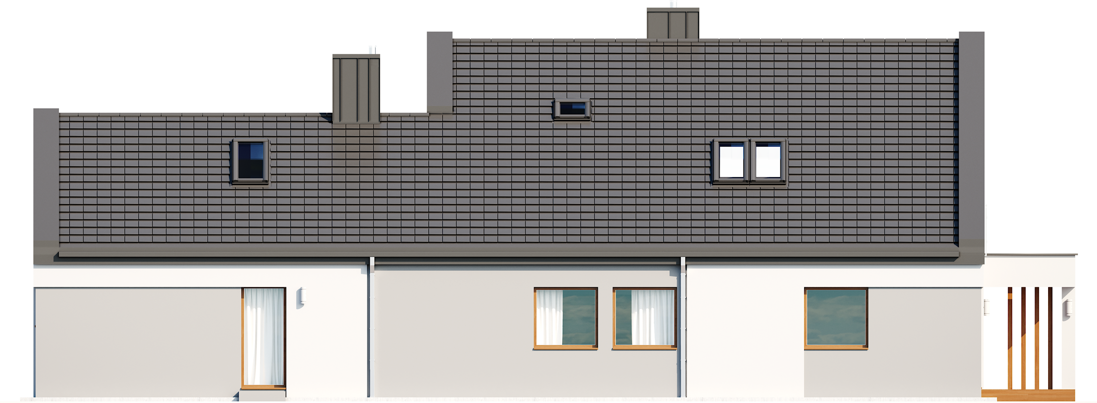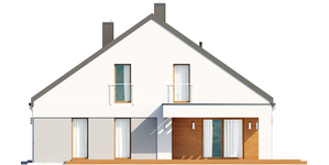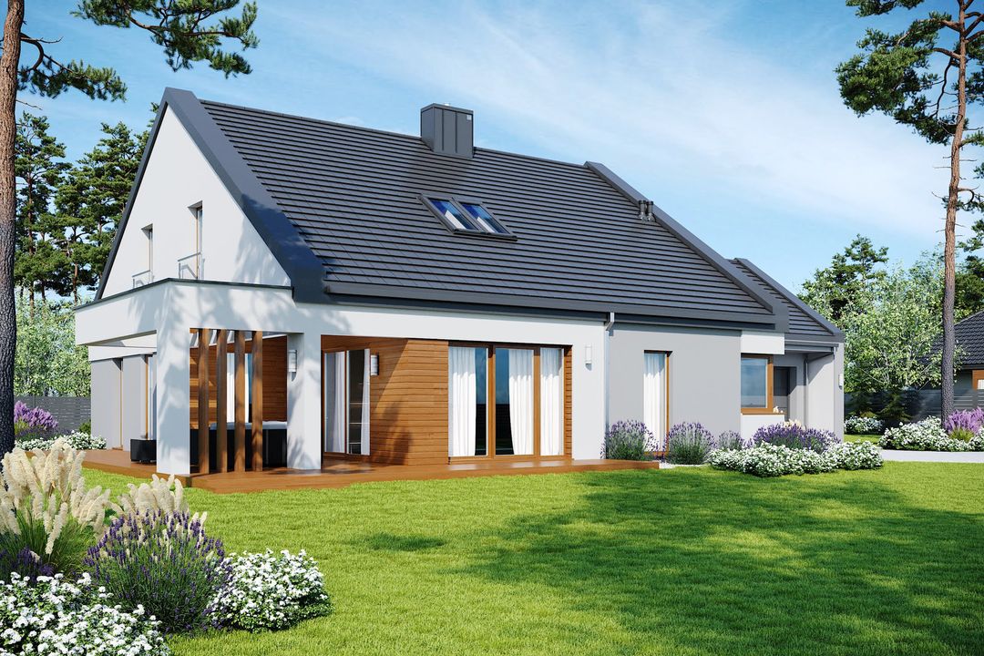 Graficzne opracowanie rzutów poglądowych widocznych na karcie projektu zostało wykonane przez Extradom.pl. Prezentowane przez Extradom.pl wizualizacje wykonane zostały przez autora projektu i należy poczytywać je jedynie za przykład i propozycję wykończenia, wizję architektoniczną autora projektu. Ostateczne wykończenie budynku może nastąpić na wiele sposobów. Szczegółowe rozwiązania zastosowane w oferowanej dokumentacji - w tym również ilość, lokalizacje i wygląd okien, drzwi, kominów - mogą w niewielkim stopniu różnić się od prezentowanej wizualizacji budynku.