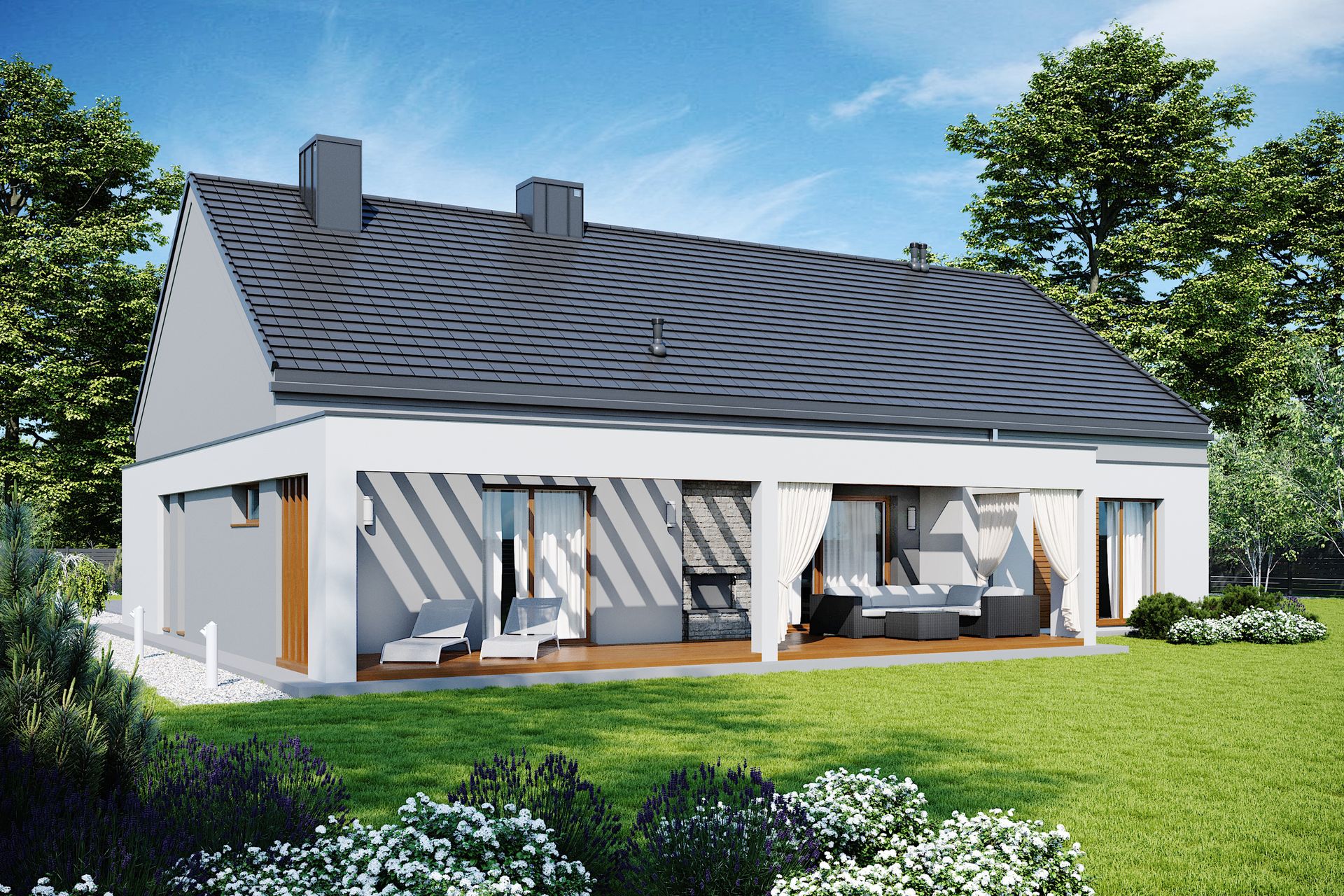 Projekt wyróżnia się nowoczesną i zwartą bryłą przykrytą dwuspadowym dachem, co jest rozwiązaniem sprawdzonym i ekonomicznym w realizacji. Charakter budynku podkreśla wysunięty do przodu garaż, który wraz z zadaszoną strefą wejściową tworzy spójną kompozycję. Duże przeszklenia oraz częściowo zadaszona loggia otwierają dom na ogród, zacierając granicę między wnętrzem a otoczeniem. Nowoczesna elewacja łączy prostotę z elegancją, nadając całości ponadczasowy wygląd.