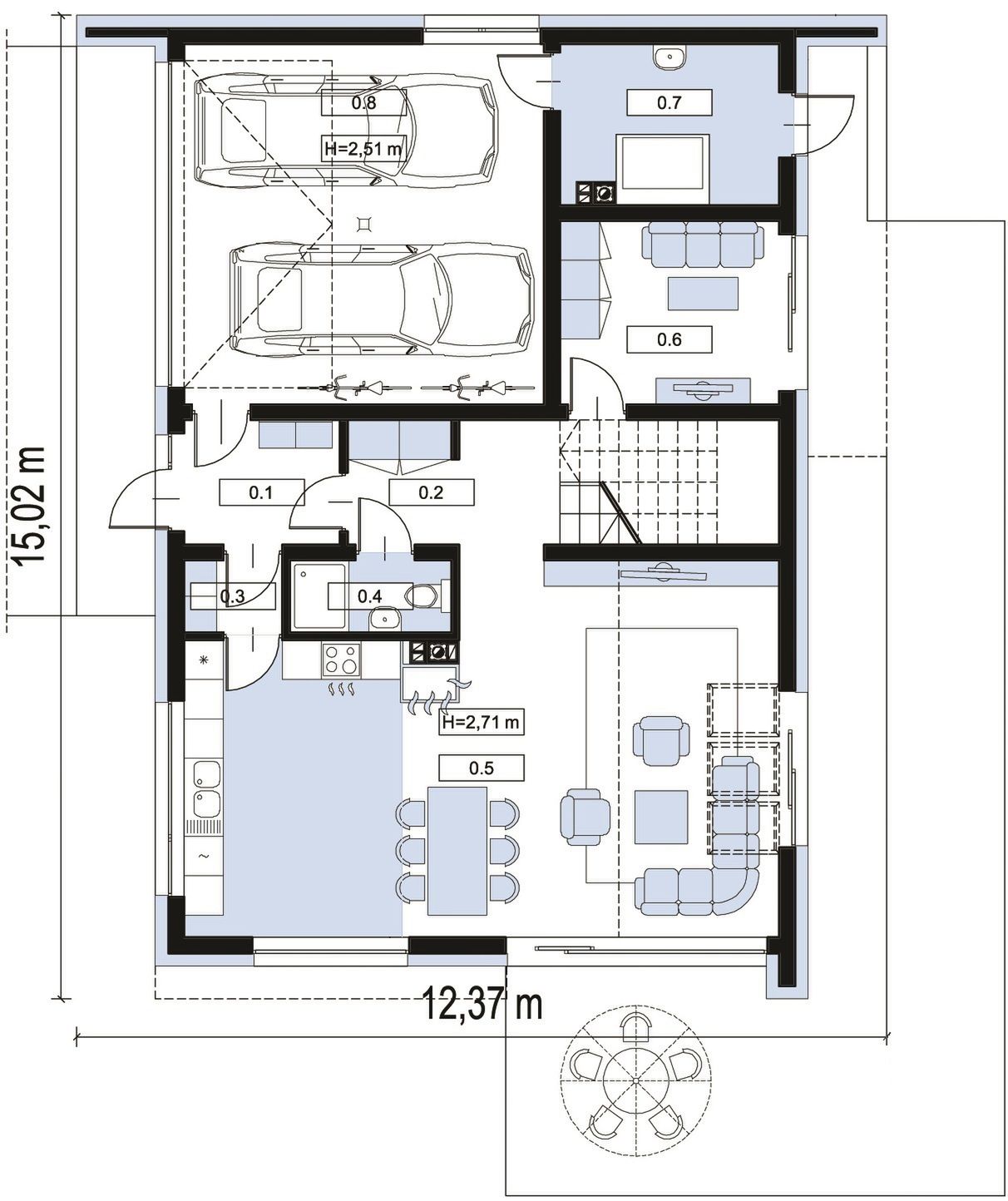 Fundament tradycyjny- ława+ściana fundamentowa. Sciana zewn.- bloczki- beton komórkowy+styropian. Ściana wewn.-bloczki- beton komórkowy. Strop teriva. Więźba drewniana z elementami stalowymi/dachówka ceramiczna. Elewacja- tynk mineralny+płyty HPL