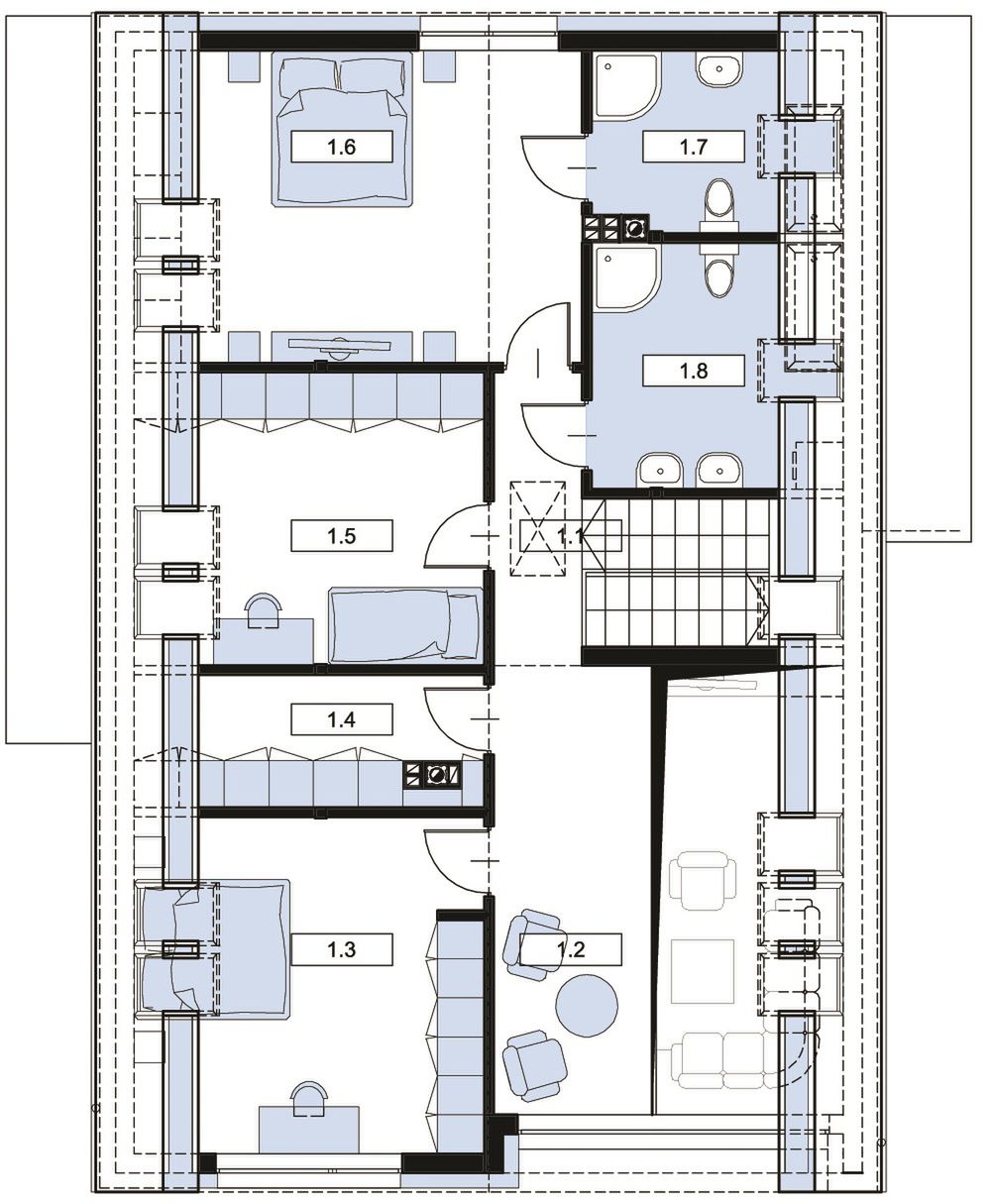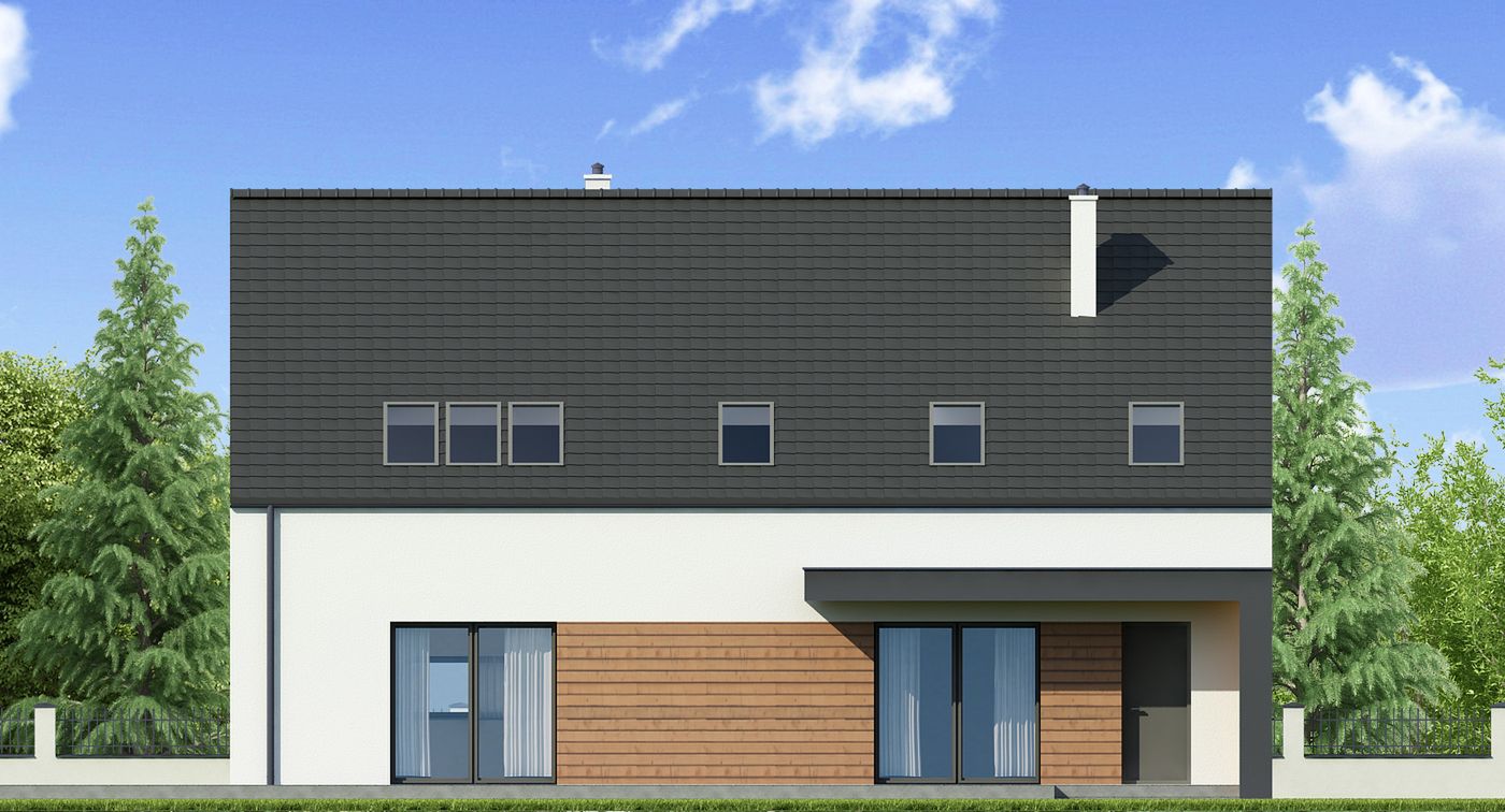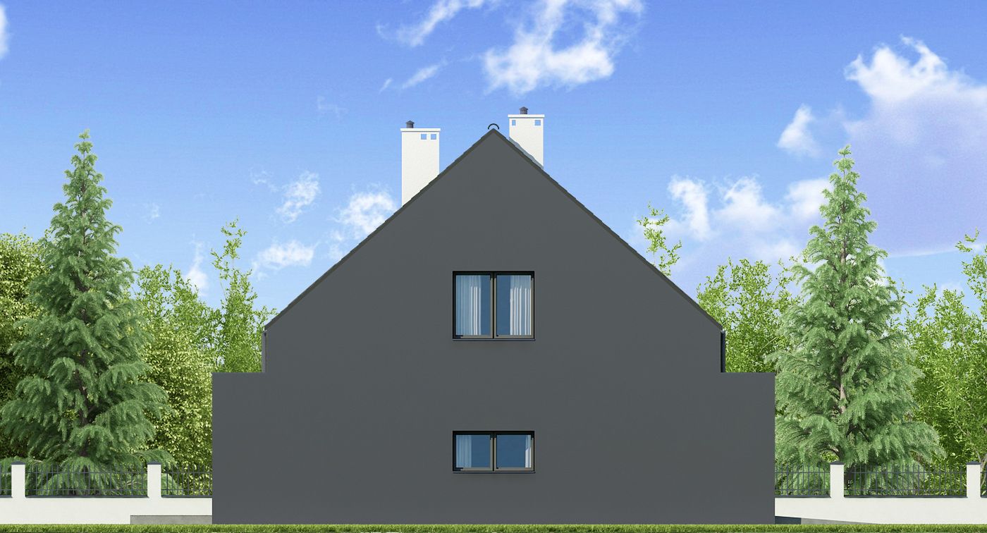 Graficzne opracowanie rzutów poglądowych widocznych na karcie projektu zostało wykonane przez Extradom.pl. Prezentowane przez Extradom.pl wizualizacje wykonane zostały przez autora projektu i należy poczytywać je jedynie za przykład i propozycję wykończenia, wizję architektoniczną autora projektu. Ostateczne wykończenie budynku może nastąpić na wiele sposobów. Szczegółowe rozwiązania zastosowane w oferowanej dokumentacji - w tym również ilość, lokalizacje i wygląd okien, drzwi, kominów - mogą w niewielkim stopniu różnić się od prezentowanej wizualizacji budynku.