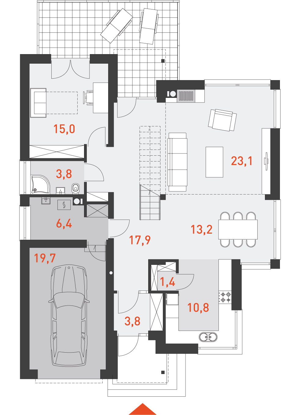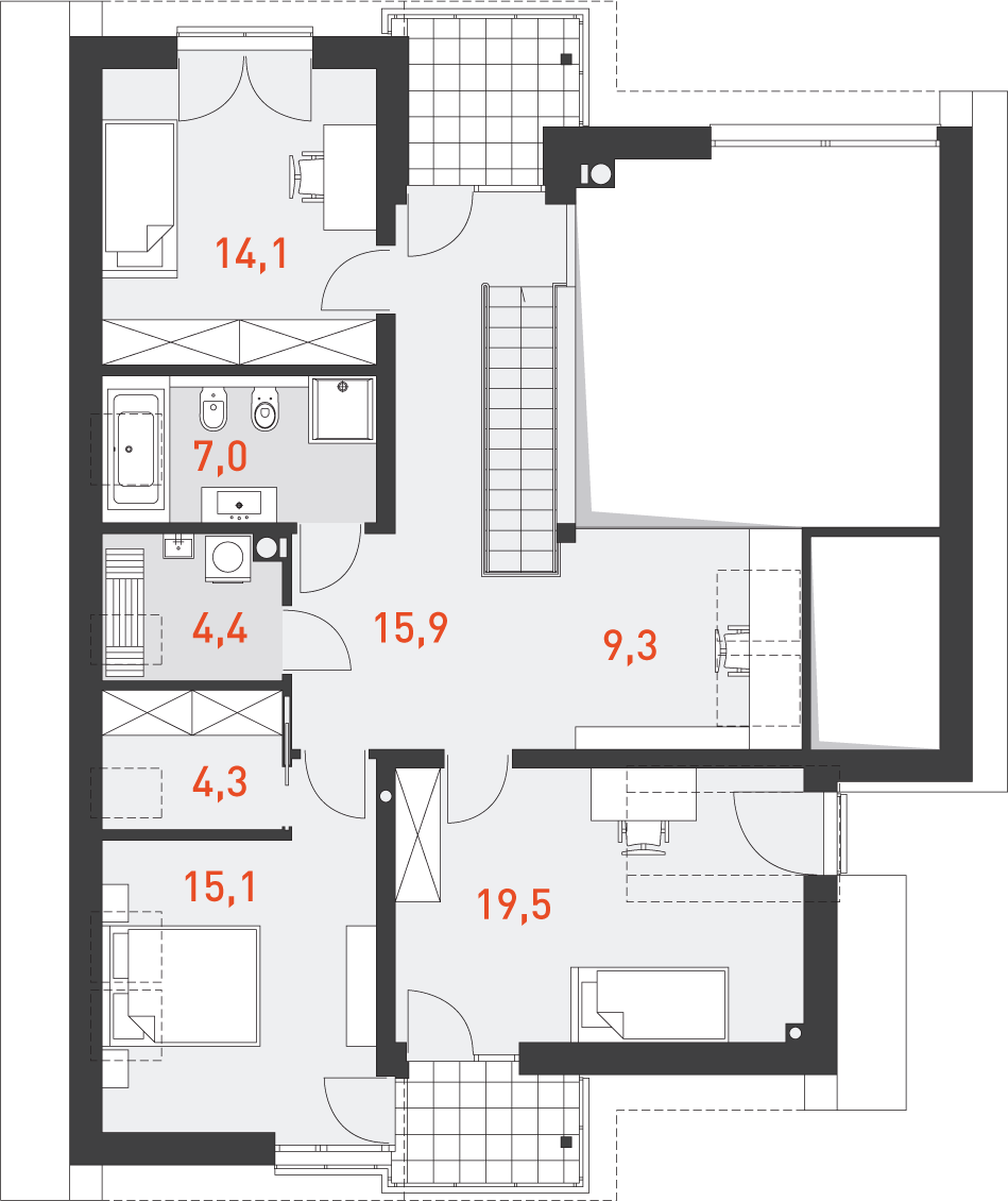 Konstrukcja: zgodna z normami EUROKOD. Fundamenty: tradycyjne ławy i stopy żelbetowe. Ściany: pustak ceramiczny + styropian na etapie adaptacji projektu istnieje możliwość zamiany pustaka ceramicznego na inny materiał o podobnych parametrach wytrzymałosciowych, np. na bloczek silikatowy. Elewacja: tynk, wielkoformatowe płyty kamienne wielkoformatowe płyty kamienne wykorzystane jako materiał dekoracyjny można zamienić na etapie adaptacji projektu na inny, np. na płytkę klinkierową. Stropy: żelbetowe wylewane na etapie adaptacji projektu istnieje możliwość zmiany technologii stropu na gęstożebrowy lub prefabrykowany. Schody: konstrukcji lekkiej konstrukcja oraz materiały wykończeniowe schodów przewidziane do indywidualnej aranżacji. Możesz skorzystać z usług naszego Partnera. Formularz ofertowy dostępny w zakładce „kosztorys”. Dach: dachówka ceramiczna lub cementowa konstrukcja więźby przewidziana pod pokrycie ciężkie dla I strefy wiatrowej i II strefy śniegowej.
