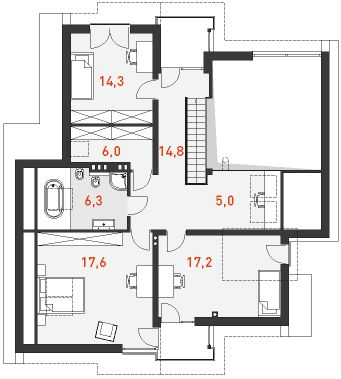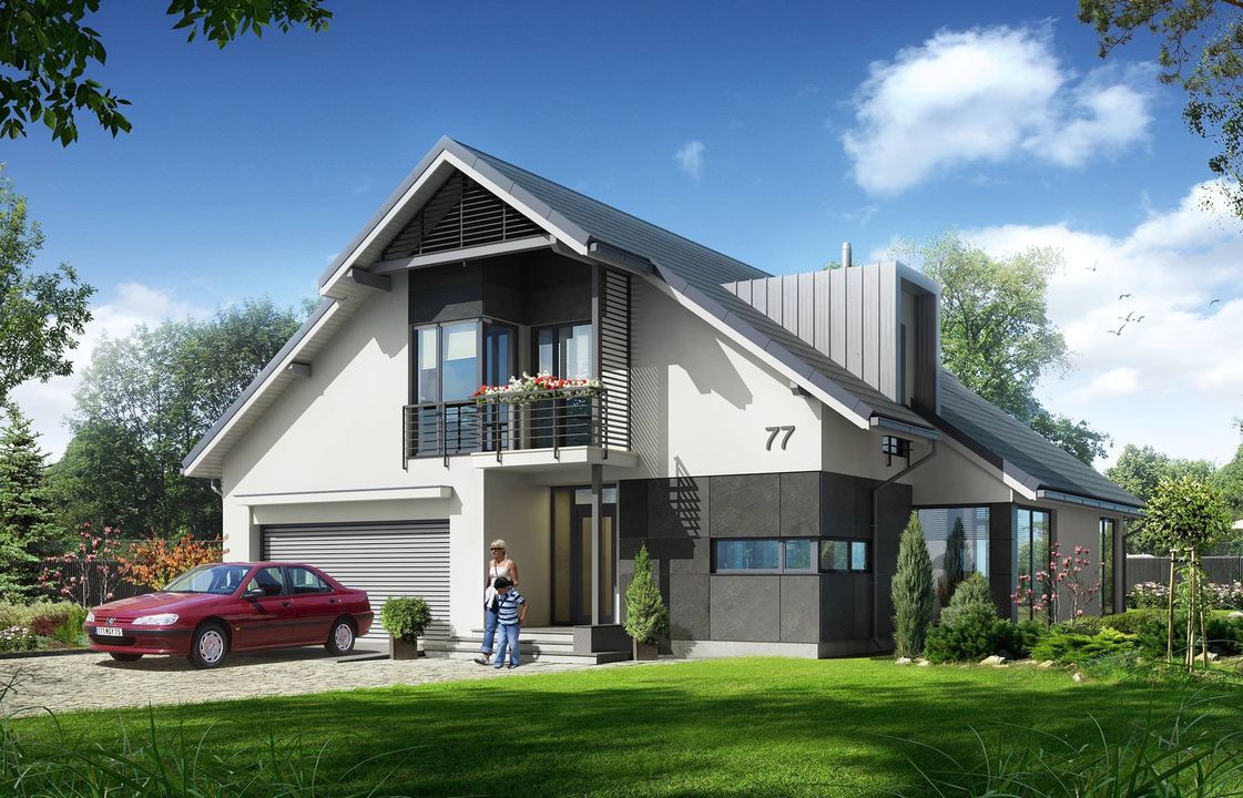 Graficzne opracowanie rzutów poglądowych widocznych na karcie projektu zostało wykonane przez Extradom.pl. Prezentowane przez Extradom.pl wizualizacje wykonane zostały przez autora projektu i należy poczytywać je jedynie za przykład i propozycję wykończenia, wizję architektoniczną autora projektu. Ostateczne wykończenie budynku może nastąpić na wiele sposobów. Szczegółowe rozwiązania zastosowane w oferowanej dokumentacji - w tym również ilość, lokalizacje i wygląd okien, drzwi, kominów - mogą w niewielkim stopniu różnić się od prezentowanej wizualizacji budynku.
