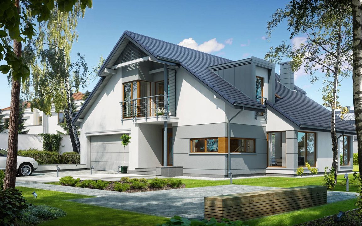 Graficzne opracowanie rzutów poglądowych widocznych na karcie projektu zostało wykonane przez Extradom.pl. Prezentowane przez Extradom.pl wizualizacje wykonane zostały przez autora projektu i należy poczytywać je jedynie za przykład i propozycję wykończenia, wizję architektoniczną autora projektu. Ostateczne wykończenie budynku może nastąpić na wiele sposobów. Szczegółowe rozwiązania zastosowane w oferowanej dokumentacji - w tym również ilość, lokalizacje i wygląd okien, drzwi, kominów - mogą w niewielkim stopniu różnić się od prezentowanej wizualizacji budynku.