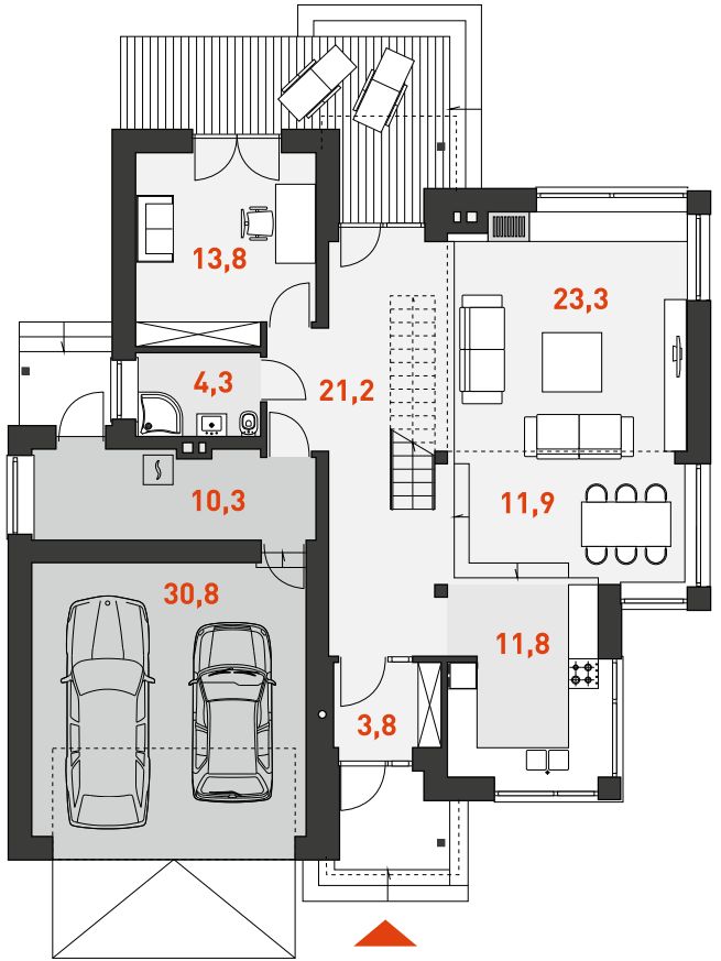 Ściany: pustak ceramiczny + styropian - na etapie adaptacji projektu istnieje możliwość zamiany pustaka ceramicznego na inny materiał o podobnych parametrach wytrzymałosciowych, np. na bloczek silikatowy. Elewacja: tynk, wielkoformatowe płyty kamienne - wielkoformatowe płyty kamienne wykorzystane jako materiał dekoracyjny można zamienić na etapie adaptacji projektu na inny, np. na płytkę klinkierową. Stropy: żelbetowe wylewane - na etapie adaptacji projektu istnieje możliwość zmiany technologii stropu na gęstożebrowy lub prefabrykowany. Schody: konstrukcji lekkiej - konstrukcja oraz materiały wykończeniowe schodów przewidziane do indywidualnej aranżacji. Dach: dachówka ceramiczna lub cementowa - konstrukcja więźby przewidziana pod pokrycie ciężkie dla I strefy wiatrowej i II strefy śniegowej.