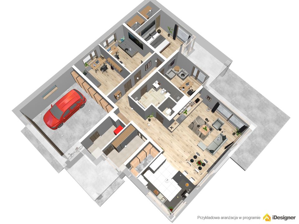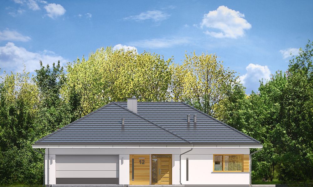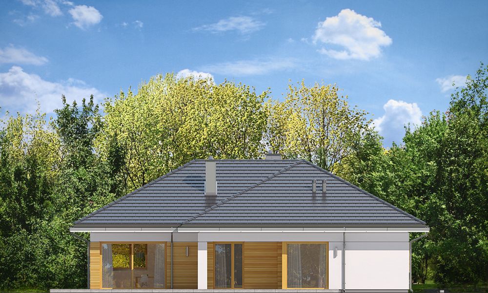 Graficzne opracowanie rzutów poglądowych widocznych na karcie projektu zostało wykonane przez Extradom.pl. Prezentowane przez Extradom.pl wizualizacje wykonane zostały przez autora projektu i należy poczytywać je jedynie za przykład i propozycję wykończenia, wizję architektoniczną autora projektu. Ostateczne wykończenie budynku może nastąpić na wiele sposobów. Szczegółowe rozwiązania zastosowane w oferowanej dokumentacji - w tym również ilość, lokalizacje i wygląd okien, drzwi, kominów - mogą w niewielkim stopniu różnić się od prezentowanej wizualizacji budynku.