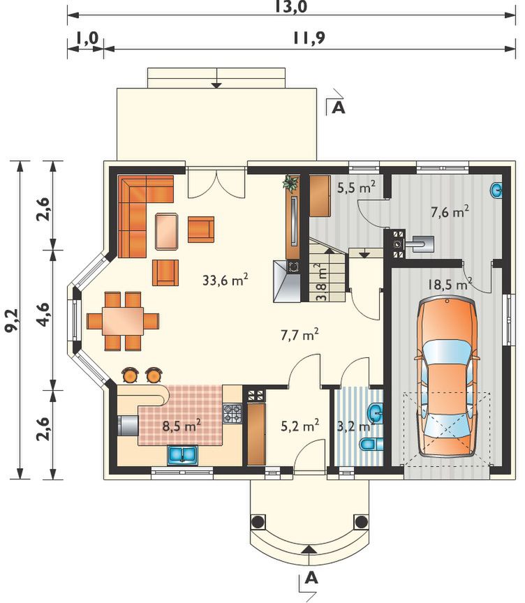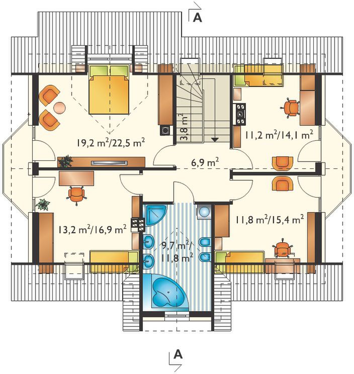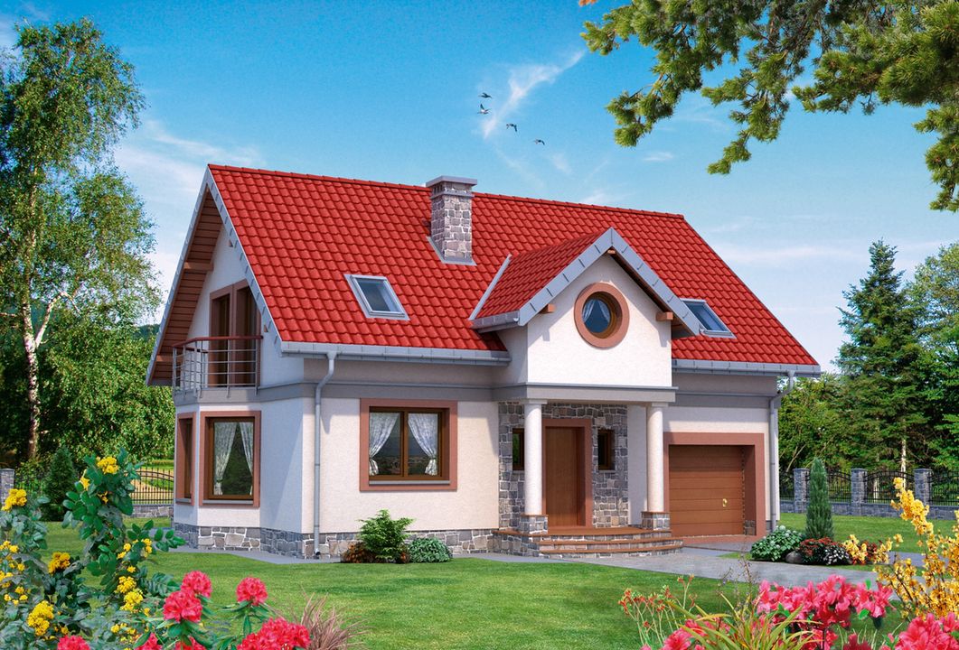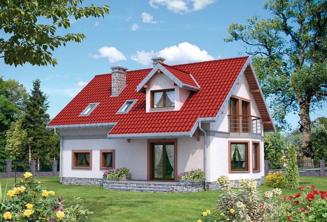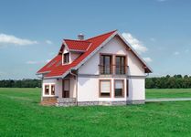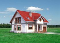 Graficzne opracowanie rzutów poglądowych widocznych na karcie projektu zostało wykonane przez Extradom.pl. Prezentowane przez Extradom.pl wizualizacje wykonane zostały przez autora projektu i należy poczytywać je jedynie za przykład i propozycję wykończenia, wizję architektoniczną autora projektu. Ostateczne wykończenie budynku może nastąpić na wiele sposobów. Szczegółowe rozwiązania zastosowane w oferowanej dokumentacji - w tym również ilość, lokalizacje i wygląd okien, drzwi, kominów - mogą w niewielkim stopniu różnić się od prezentowanej wizualizacji budynku.