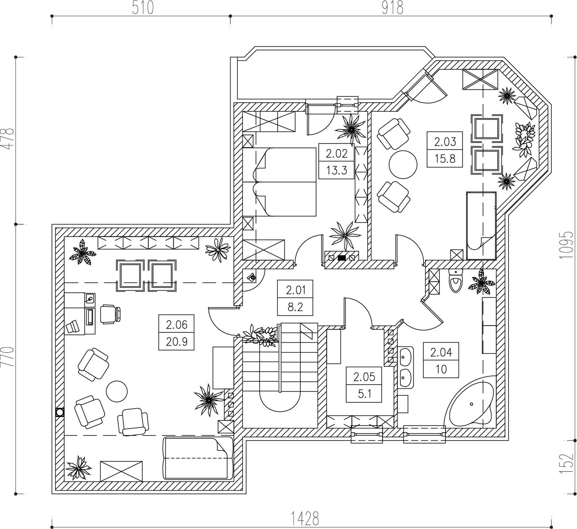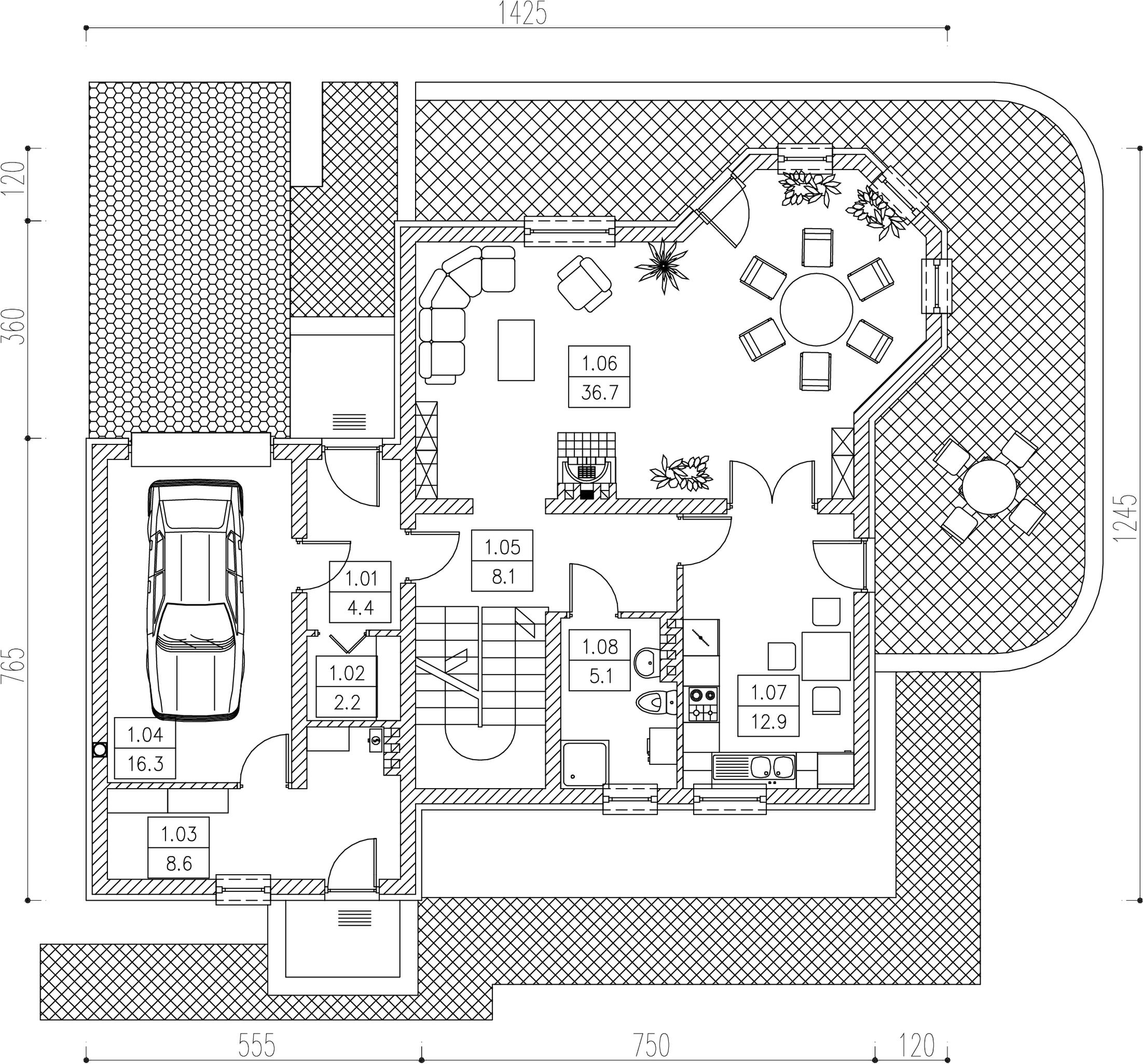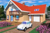 Graficzne opracowanie rzutów poglądowych widocznych na karcie projektu zostało wykonane przez Extradom.pl. Prezentowane przez Extradom.pl wizualizacje wykonane zostały przez autora projektu i należy poczytywać je jedynie za przykład i propozycję wykończenia, wizję architektoniczną autora projektu. Ostateczne wykończenie budynku może nastąpić na wiele sposobów. Szczegółowe rozwiązania zastosowane w oferowanej dokumentacji - w tym również ilość, lokalizacje i wygląd okien, drzwi, kominów - mogą w niewielkim stopniu różnić się od prezentowanej wizualizacji budynku.