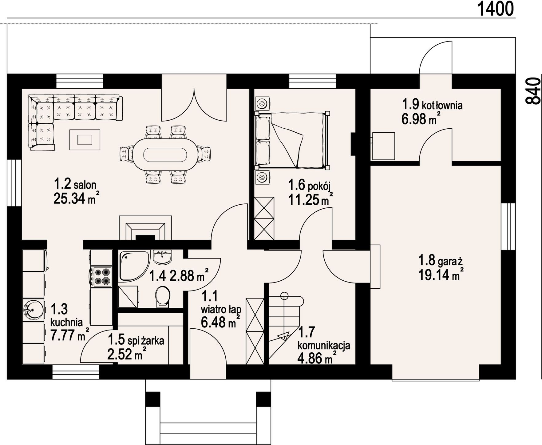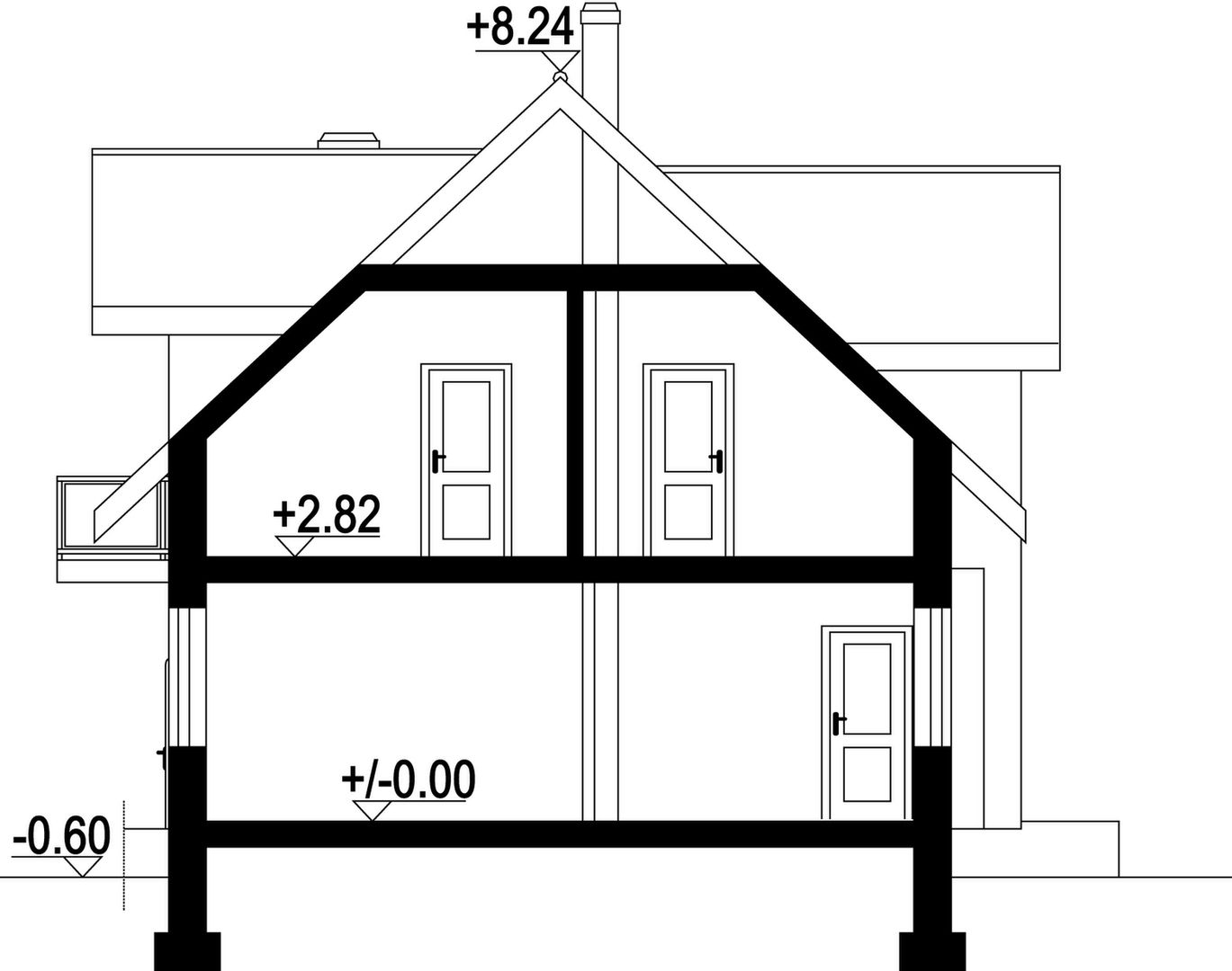 Wysokość ścianki kolankowej: 1.32 m. Strop: płyta żelbetowa. Pokrycie dachu: dachówka ceramiczna. Ściany zewnętrzne: pustaki ceramiczne + styropian. Ściany wewnętrzne: pustaki ceramiczne. Typ ogrzewania: kocioł gazowy lub kocioł na paliwo stałe. Inne: okna połaciowe Fakro.