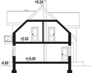 Wysokość ścianki kolankowej: 1.32 m. Strop: płyta żelbetowa. Pokrycie dachu: dachówka ceramiczna. Ściany zewnętrzne: pustaki ceramiczne + styropian. Ściany wewnętrzne: pustaki ceramiczne. Typ ogrzewania: kocioł gazowy lub kocioł na paliwo stałe. Inne: okna dachowe Fakro Greenview.