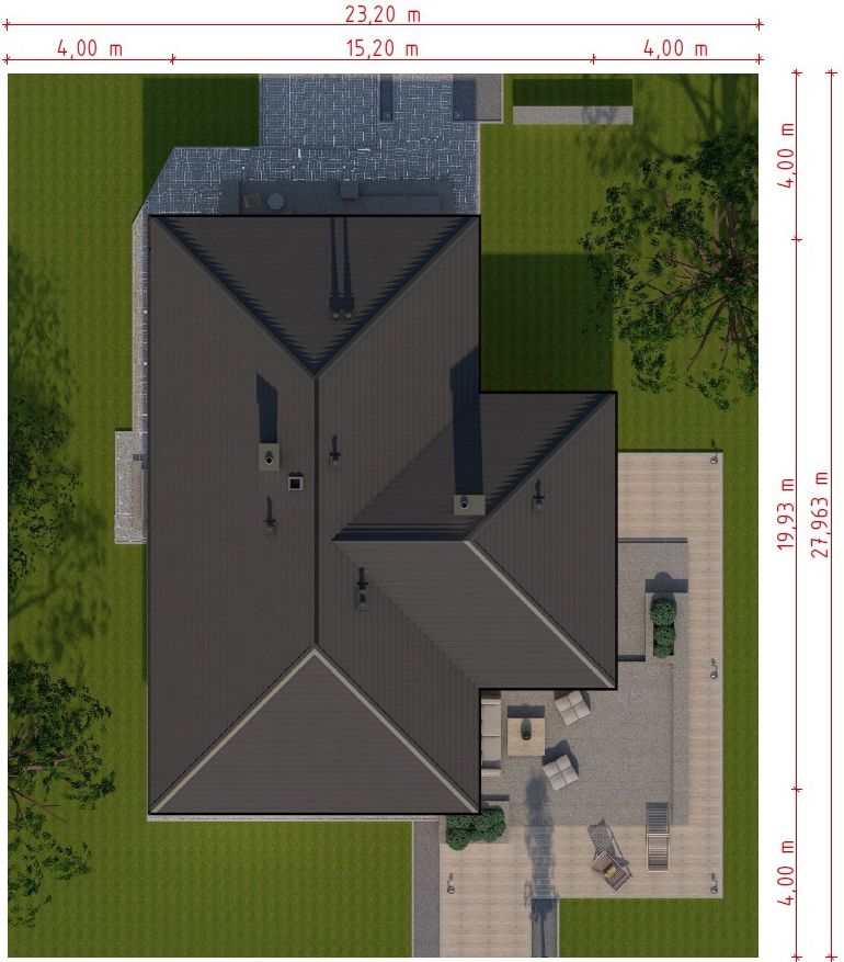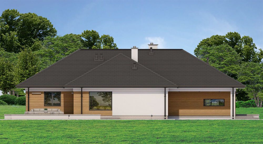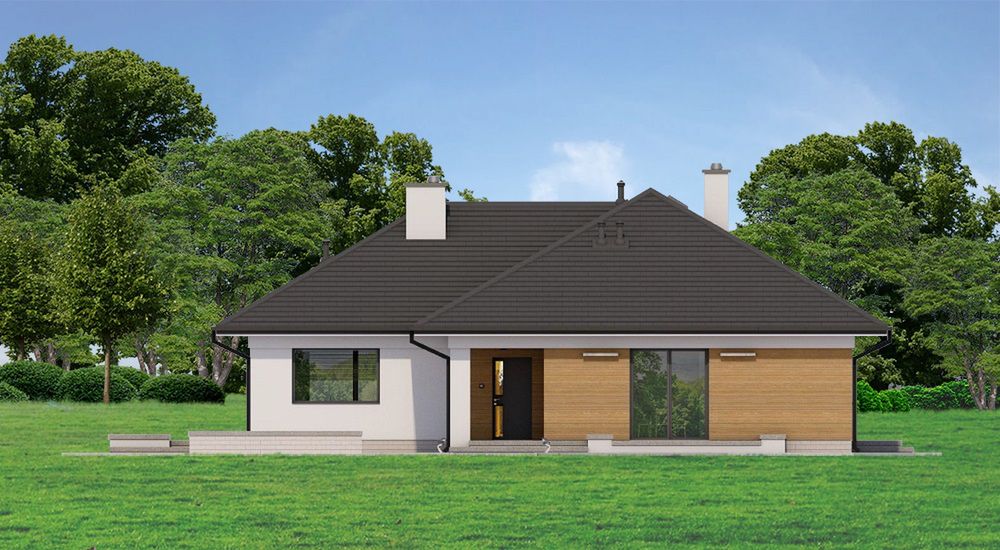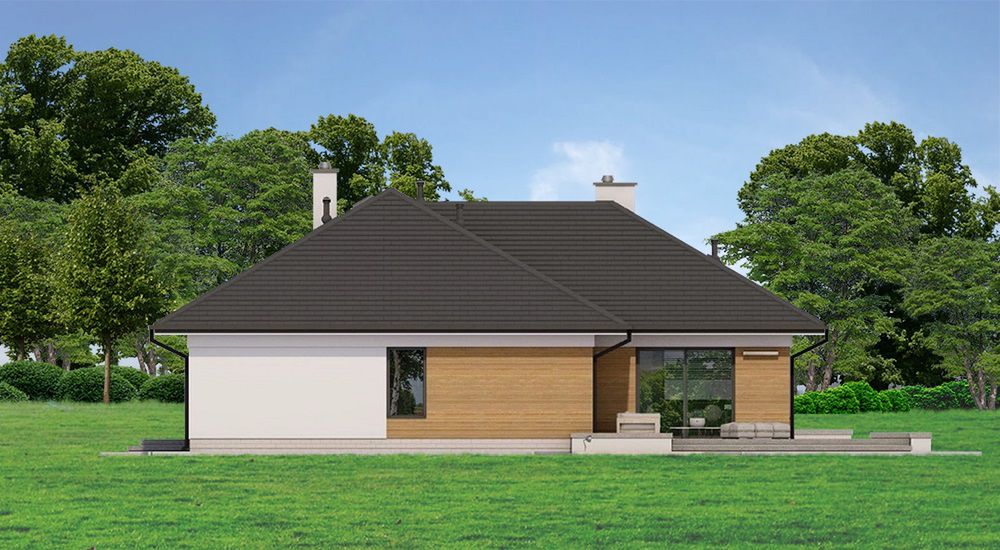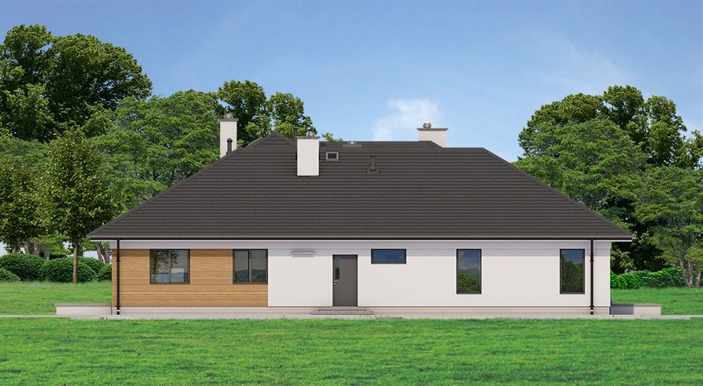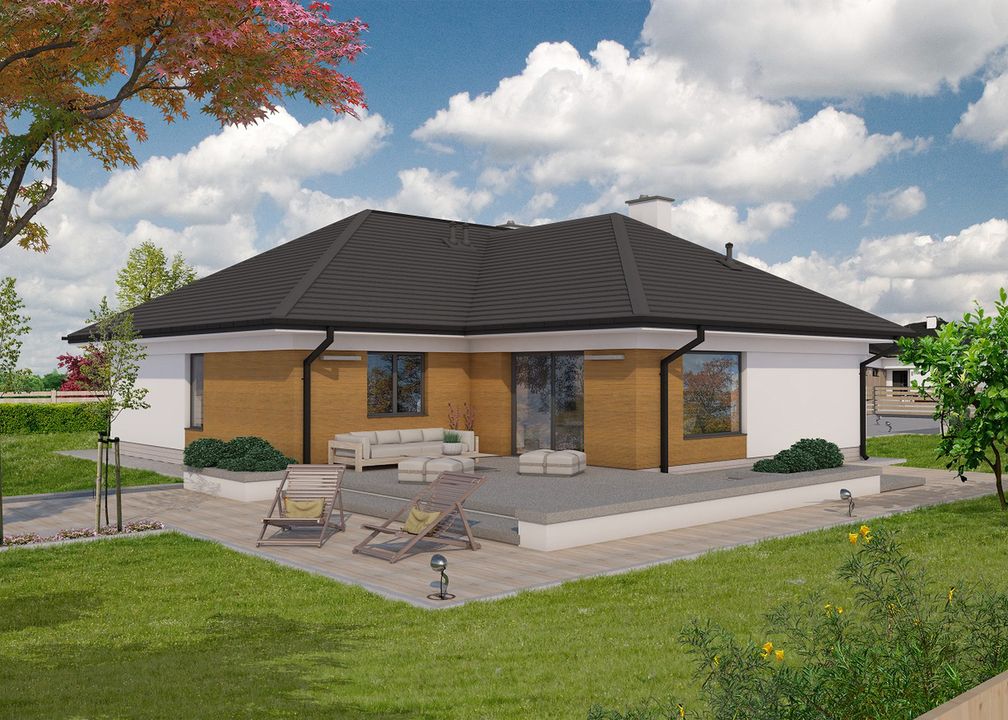 Graficzne opracowanie rzutów poglądowych widocznych na karcie projektu zostało wykonane przez Extradom.pl. Prezentowane przez Extradom.pl wizualizacje wykonane zostały przez autora projektu i należy poczytywać je jedynie za przykład i propozycję wykończenia, wizję architektoniczną autora projektu. Ostateczne wykończenie budynku może nastąpić na wiele sposobów. Szczegółowe rozwiązania zastosowane w oferowanej dokumentacji - w tym również ilość, lokalizacje i wygląd okien, drzwi, kominów - mogą w niewielkim stopniu różnić się od prezentowanej wizualizacji budynku.